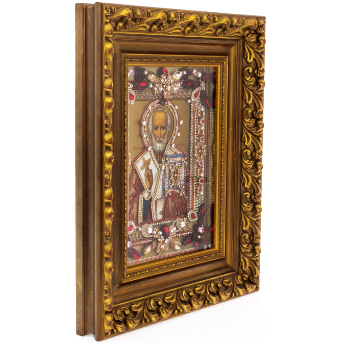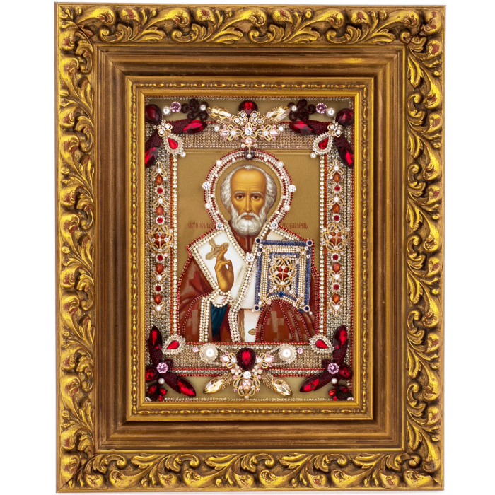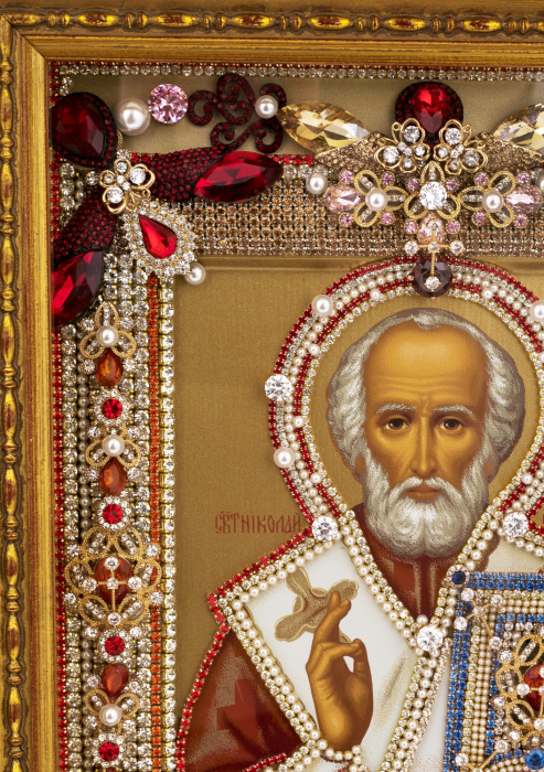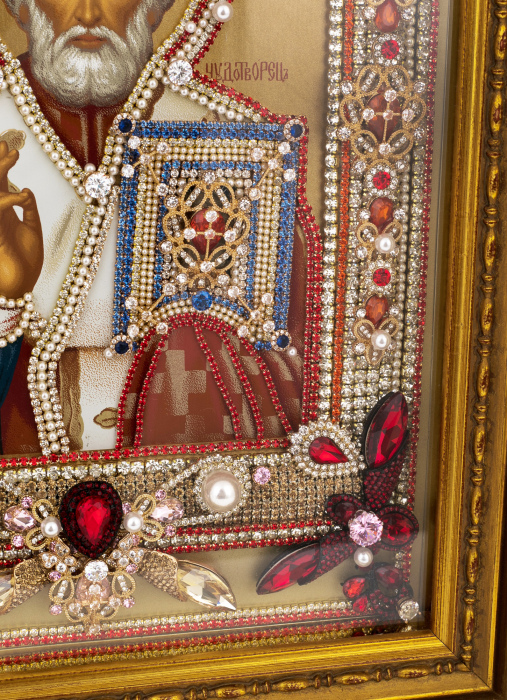 Материалы иконы: липовая доска левкас, масляные краски, сусальное золото, стекло, жемчуг, фианиты, стразы.