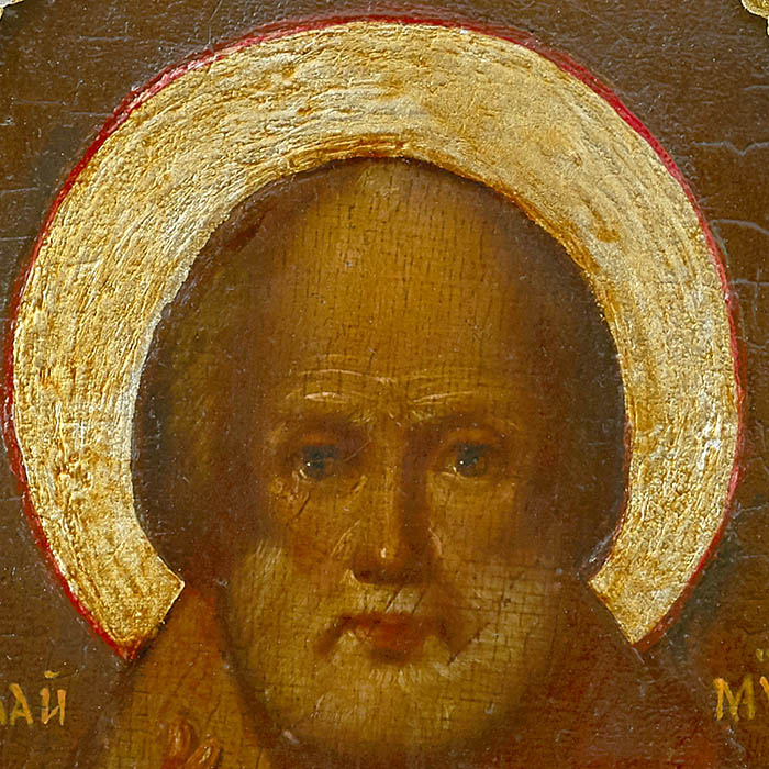 Икона начала XX века, написанная на липовой доске с использованием масляных красок и левкаса, хранит в себе тепло рук мастера, а её поверхность словно оживает под сиянием золотого нимба. Лик Николая Чудотворца излучает мудрость и доброту, его проницательный взгляд проникает в самую душу, пробуждая в ней гармонию и умиротворение. Изящный жест благословения, запечатленный художником, символизирует божественную защиту, которой святитель окружает тех, кто ищет его помощи.