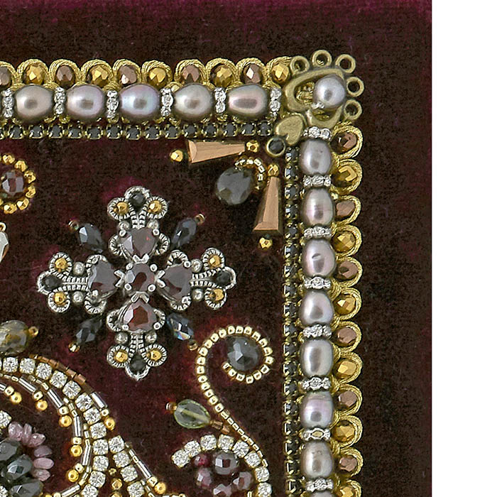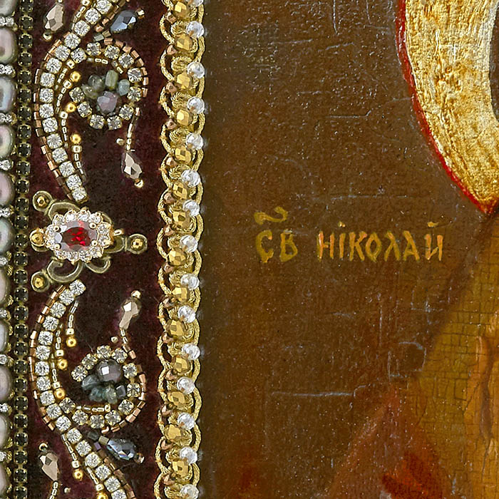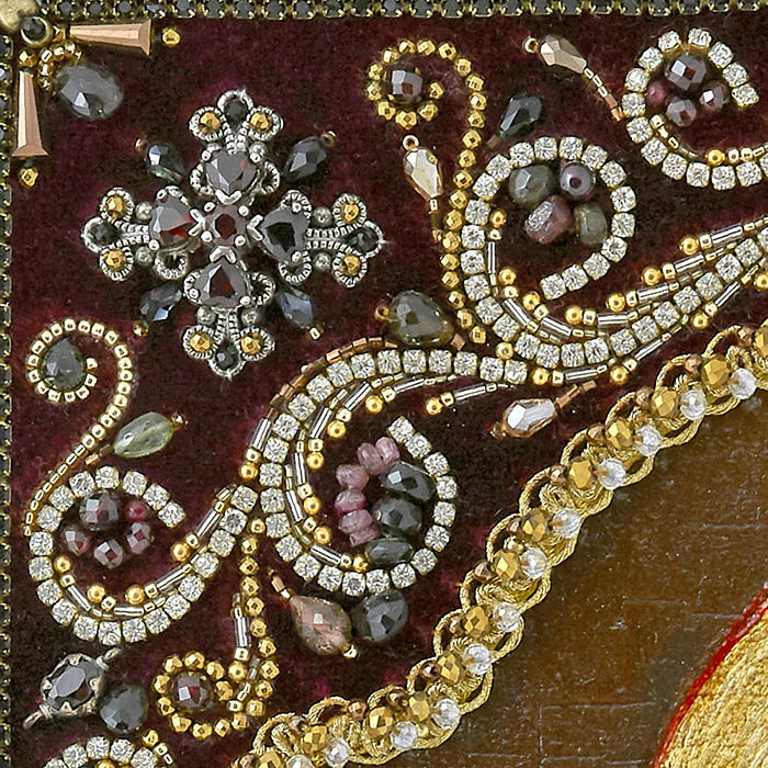 Обрамление иконы — настоящее произведение искусства. Бархатный фон насыщенного бордового оттенка служит основой для сложных орнаментов, выполненных с использованием драгоценных и полудрагоценных камней: турмалинов, гранатов, лабрадоров, цитринов и авантюрина. Каждый камень, отточенный до совершенства, привносит в композицию свою энергию — от тепла и страсти до глубины и уравновешенности. Украшения из бисера и стразов сверкают, словно звёзды на ночном небе, придавая иконе ещё большую торжественность.