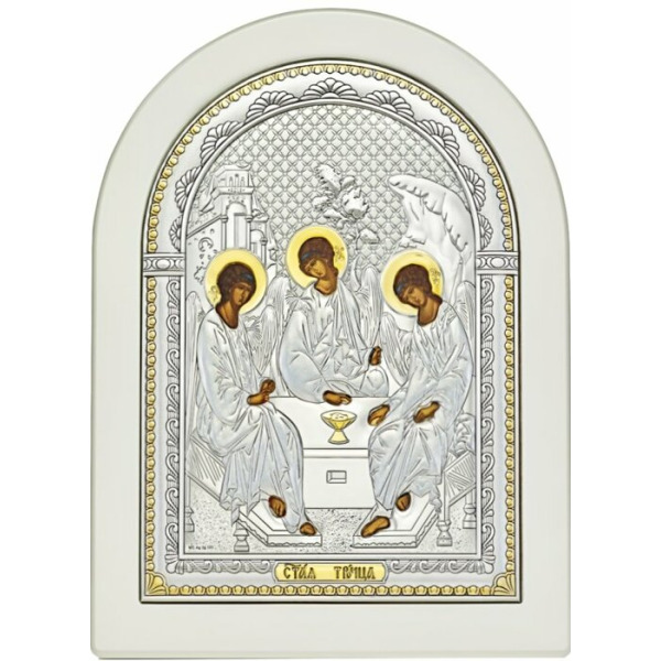 Икона "Святая Троица" с перламутром в белой рамеИкона "Святая Троица" с перламутром в белой рамеИкона Святая Троица была написана великим иконописцем Андреем Рублевым. На ней изображается библейское событие — встреча трех странников в виде ангелов. Они символизируют собой триединство Бога, который воплощается в Отце, Сыне и Святом Духе. Ангелы находятся возле стола, в центре которого расположена чаша, наполненная пищей — как знак жертвы, которую предстоит принести Иисусу Христу для спасения человеческого рода. Все три фигуры облачены в дорогие одежды, демонстрирующие их царственное величие.
