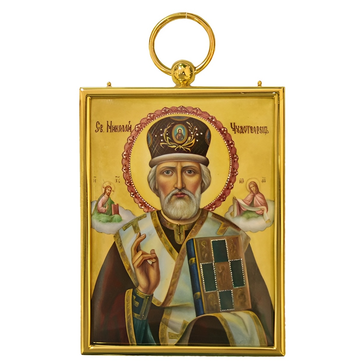 Святитель Николай, архиепископ Мир Ликийских, — один из самых почитаемых христианских святых. Он прославился добротой, кротостью и многочисленными чудесами при жизни, а после смерти — как скорый помощник в бедах и заступник в молитвах. Его имя почитается на Руси с глубокой древности, а образ традиционно размещается в домах как покров благополучия, справедливости и милосердия. На иконе он изображён в окружении Спасителя и Богоматери, передающих ему Евангелие и омофор — символы пастырского служения.