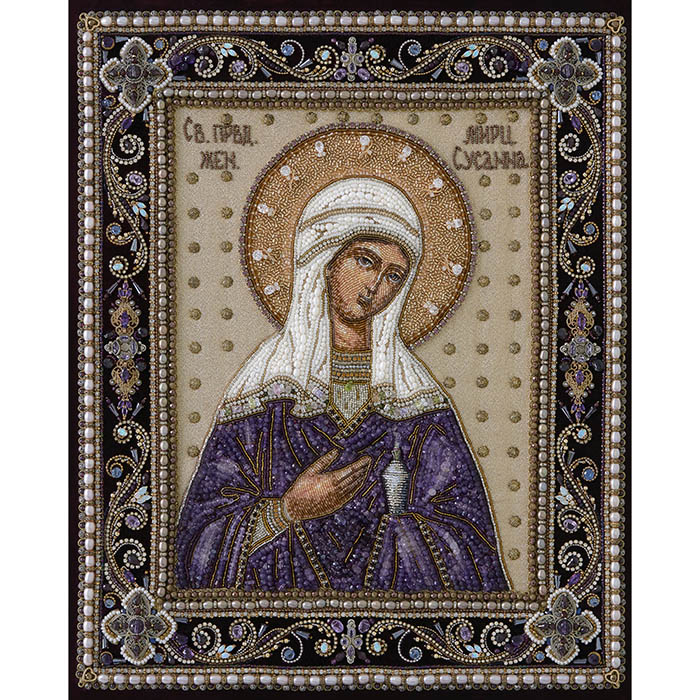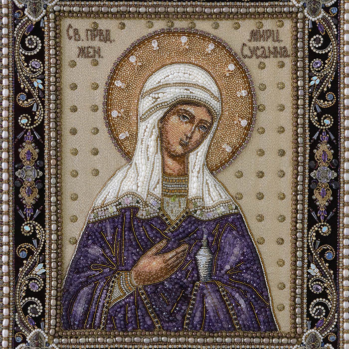 Святость иконы подчеркнута сияющим нимбом, выполненным из бисера и жемчуга, что добавляет ей торжественности и сакрального значения. Взгляд Сусанны, исполненный мягкости и смирения, призывает к духовной тишине, приглашая обратиться к ней за поддержкой в минуты сомнений и испытаний. В её облике соединяются нежность и внутренняя сила, что делает икону мощным символом верности и стойкости.