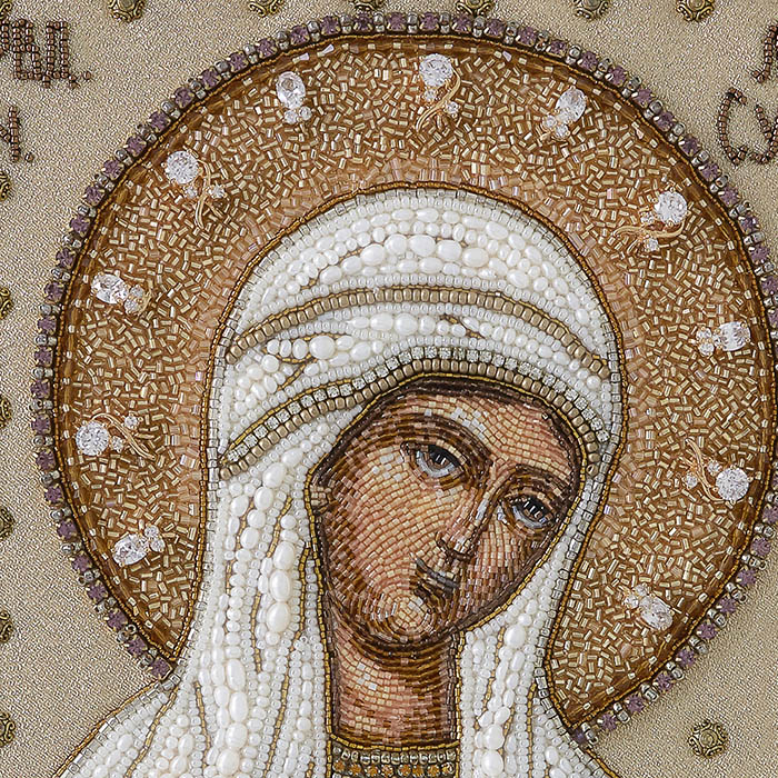 Икона «Праведная Сусанна мироносица» воплощает слияние духовной силы и утончённой красоты. Её образ, вышитый с предельным мастерством, словно светится изнутри, отражая чистоту и стойкость той, кто служила Богу и сопровождала Христа. Каждая деталь раскрывает историю служения и веры, олицетворяя непоколебимую преданность и вдохновляя на молитву. Лицевое мозаичное шитье, напоминающее о древних традициях иконописи, вручную дополняется орнаментальным великолепием, создавая ощущение вечности и святости.