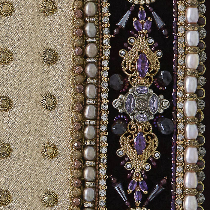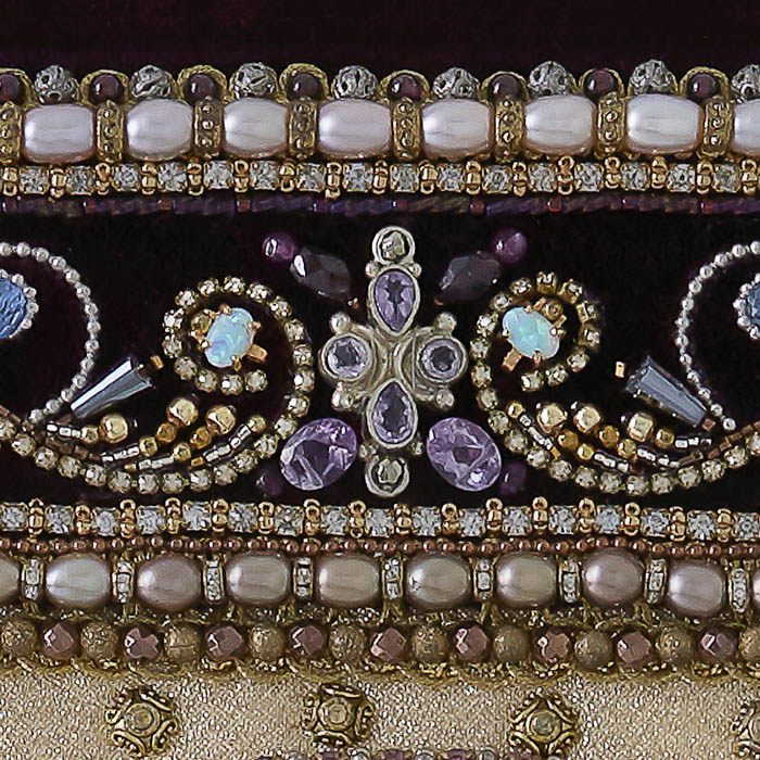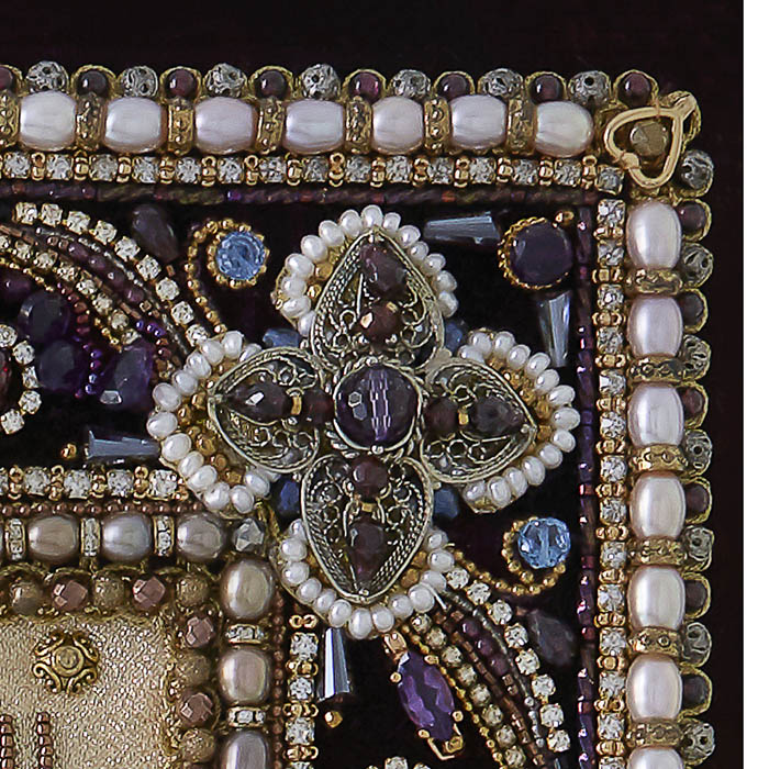 Ручная работа с использованием аметистов, топазов, гранатов, опалов, хризолитов, цирконов и жемчуга подобна бесценной симфонии света и цвета. Камни, сверкающие как звёзды, заключают в себе символы духовного возрождения, мудрости и силы. Бархатное полотно обрамляет икону мягким блеском, подчёркивая её уникальность и возвышенность. Каждая деталь вышивки продумана до мелочей: бисер и стразы, будто капли росы, украшают святой лик и фон, выделяя тонкость и гармонию композиции.