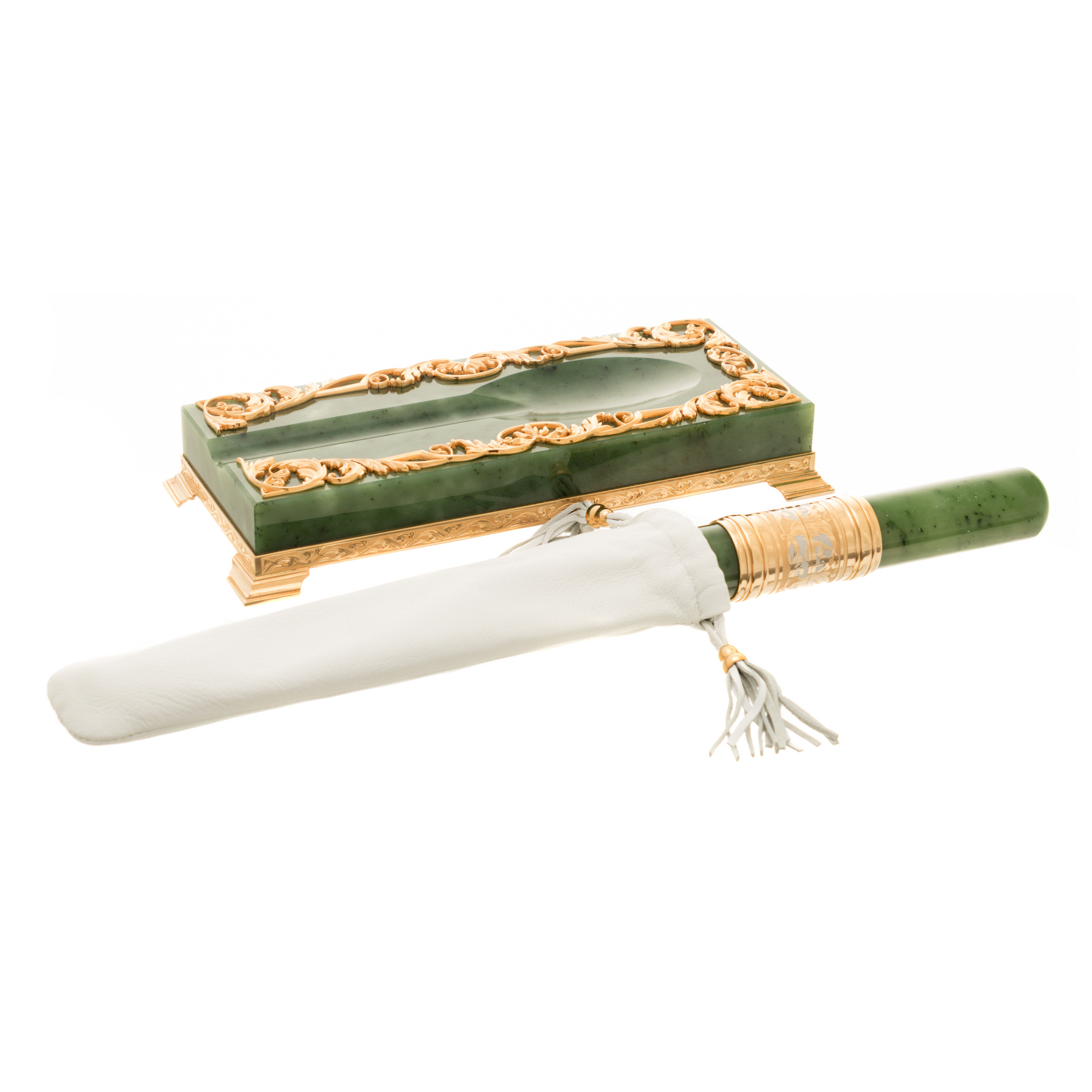 Мужской курительный набор из нефрита непременно будет оценён по достоинству. Выполненный в традициях златоустовской гравюры по золоту, он выглядит как дорогой старинный сувенир и в то же время несёт в себе практическую пользу. Идеальные формы сигарного футляра и пепельницы - заслуга искусной ручной работы мастеров Златоуста, создавших поистине эксклюзивную вещь.