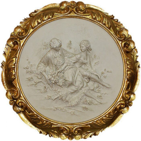 Барельеф "На лугу" квадратныйБарельеф "На лугу" квадратныйБарельеф «На лугу» — изысканная настенная композиция, воплощающая дух галантного XVIII века и тонкость итальянской художественной традиции. В центре круглого медальона изображена романтическая сцена: юноша и девушка, погружённые в безмятежный летний день, отдыхают среди цветов, обмениваясь взглядами, в которых читаются доверие, лёгкость и первое чувство. Каждая складка их пастушеских нарядов, каждый лепесток окружающего пейзажа передан с ювелирной тщательностью в высоком рельефе, создающем ощущение живого, осязаемого пространства.