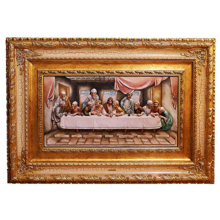Барельеф «Тайная вечеря» — это изысканное произведение искусства, созданное для истинных ценителей религиозной и исторической тематики, а также высокого мастерства художественного ремесла. Выполненный из качественных материалов и украшенный роскошной позолоченной рамой с богатым резным орнаментом, барельеф представляет собой объемное изображение знаменитой библейской сцены с тонкой прорисовкой каждого персонажа и архитектурных деталей. Свет и тень, играющие на рельефной поверхности, создают глубину и живость композиции, позволяя зрителю погрузиться в атмосферу великого события.