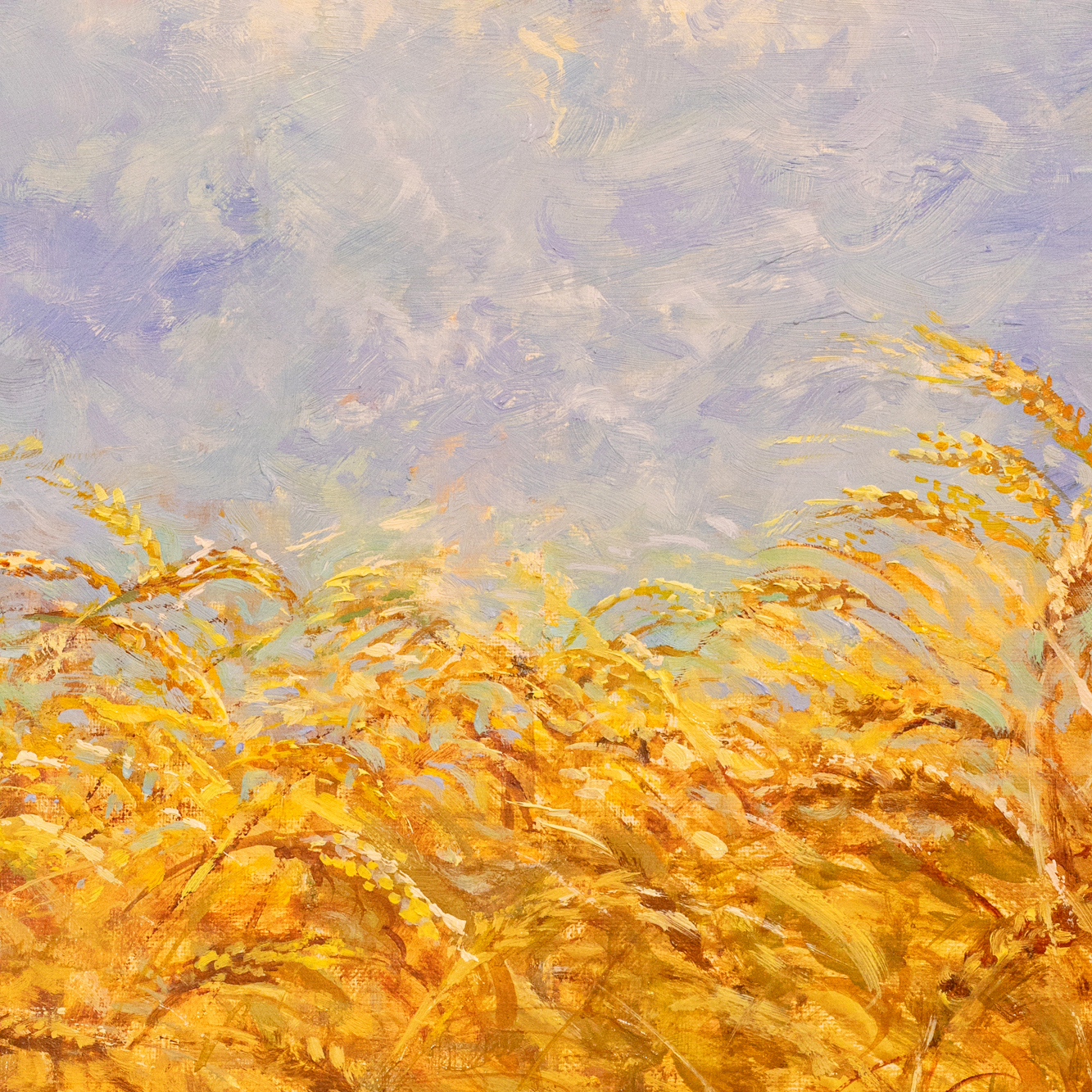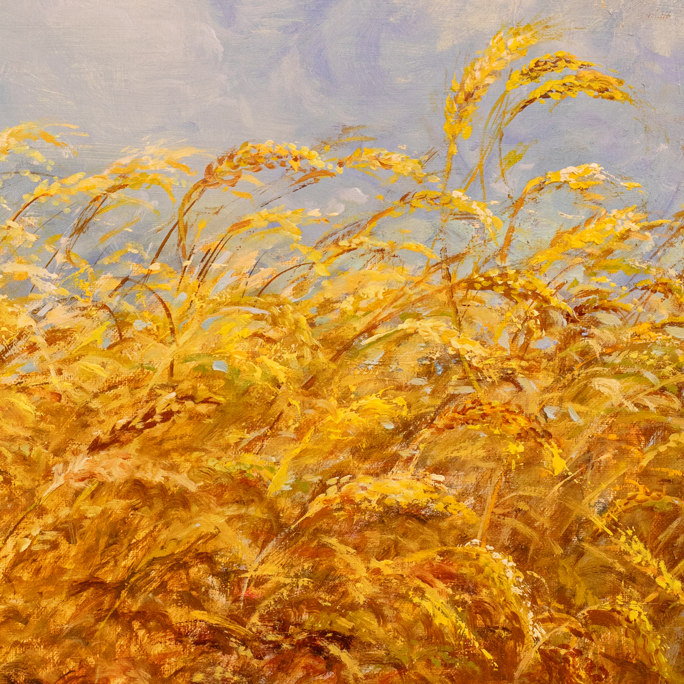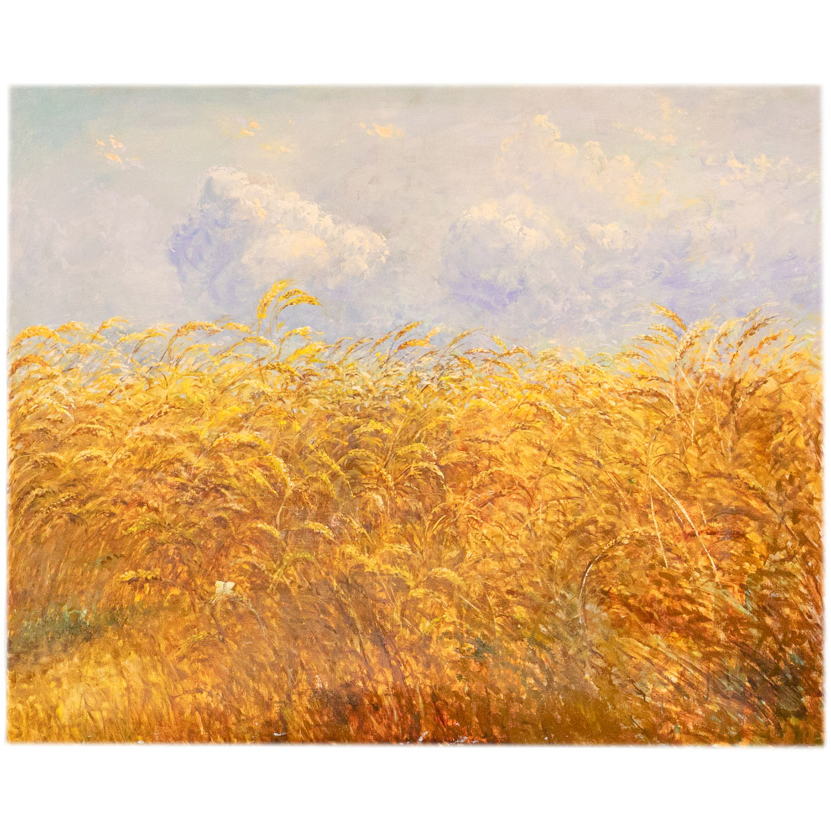 Авторская картина маслом «Изобилие хлеба. Золотой импрессион» наполнена тем редким светом, которым одаривает природу только августовское солнце в полдень. Сотканный из оттенков старого золота, янтаря и меда пейзаж охватывает зрителя словно дыханием самой земли — тёплым, плодоносящим, зрелым. Пшеничное поле, простирающееся до самого горизонта, написано щедрыми пастозными мазками, передающими не только цвет и форму, но и фактуру — зреющие колосья словно шелестят при каждом взгляде. Над полем — высокое, прозрачное небо, пронизанное лёгкими перламутровыми облаками, словно написанными на шёлке. Каждая деталь — от живописных волн хлебной массы до небесного купола — передана с такой деликатностью, что картина превращается в медитативное пространство, в котором тишина говорит громче слов. Это не просто пейзаж, а воплощённый образ процветания, стабильности и красоты, рожденной самой природой.