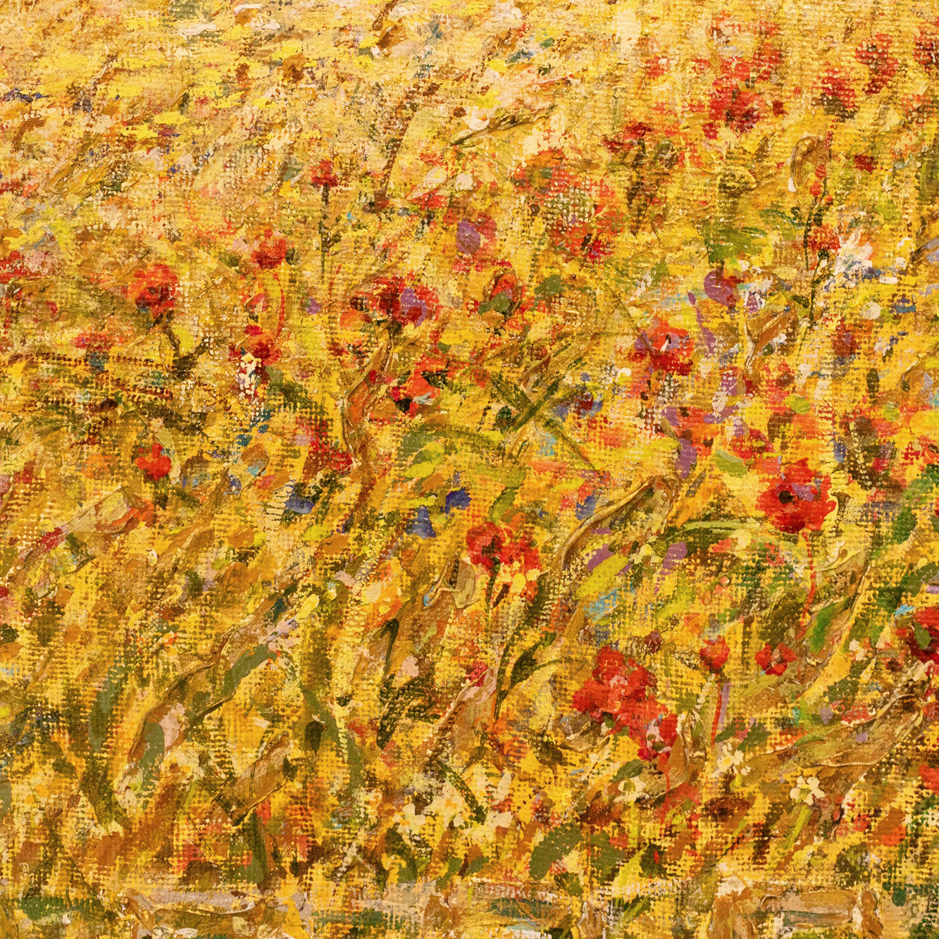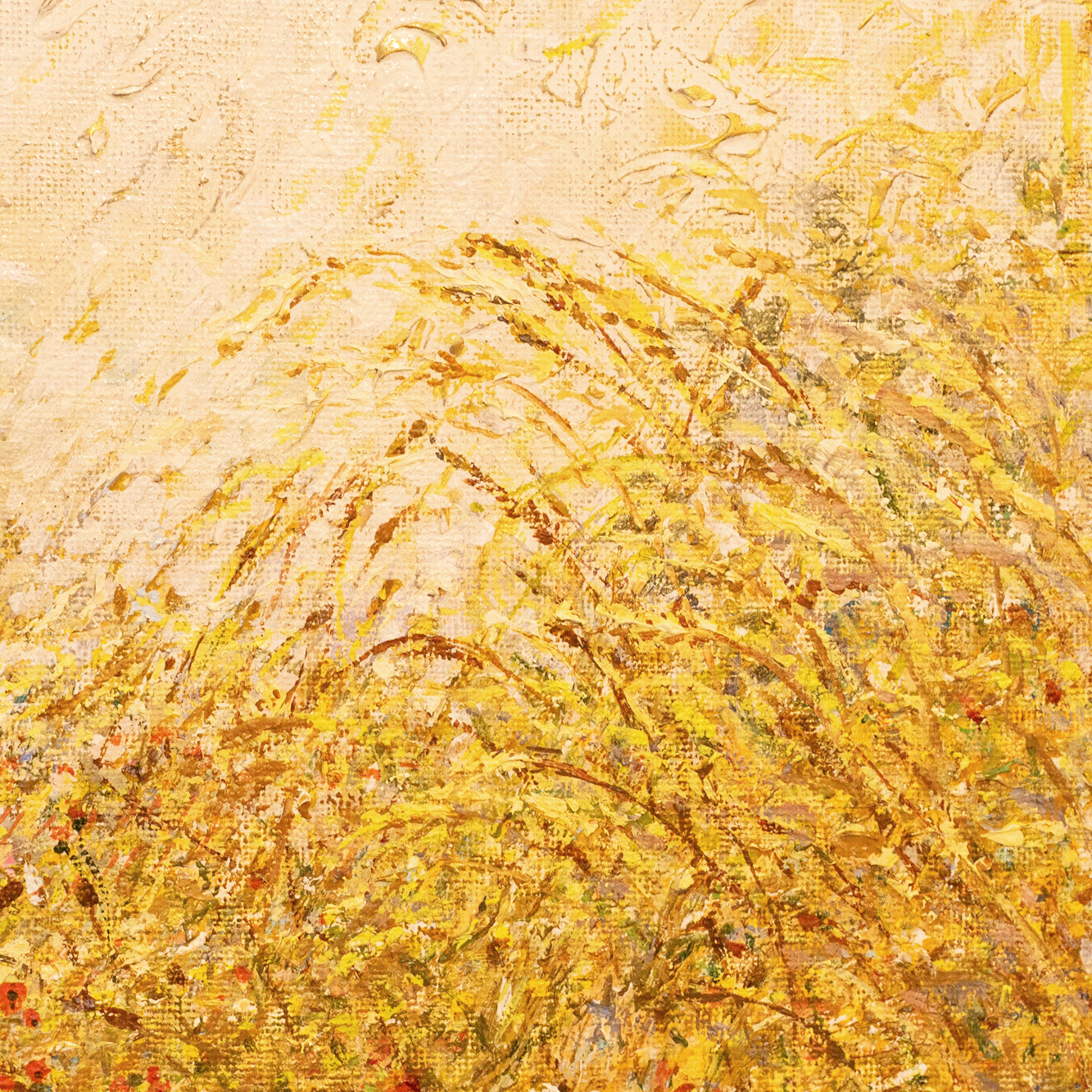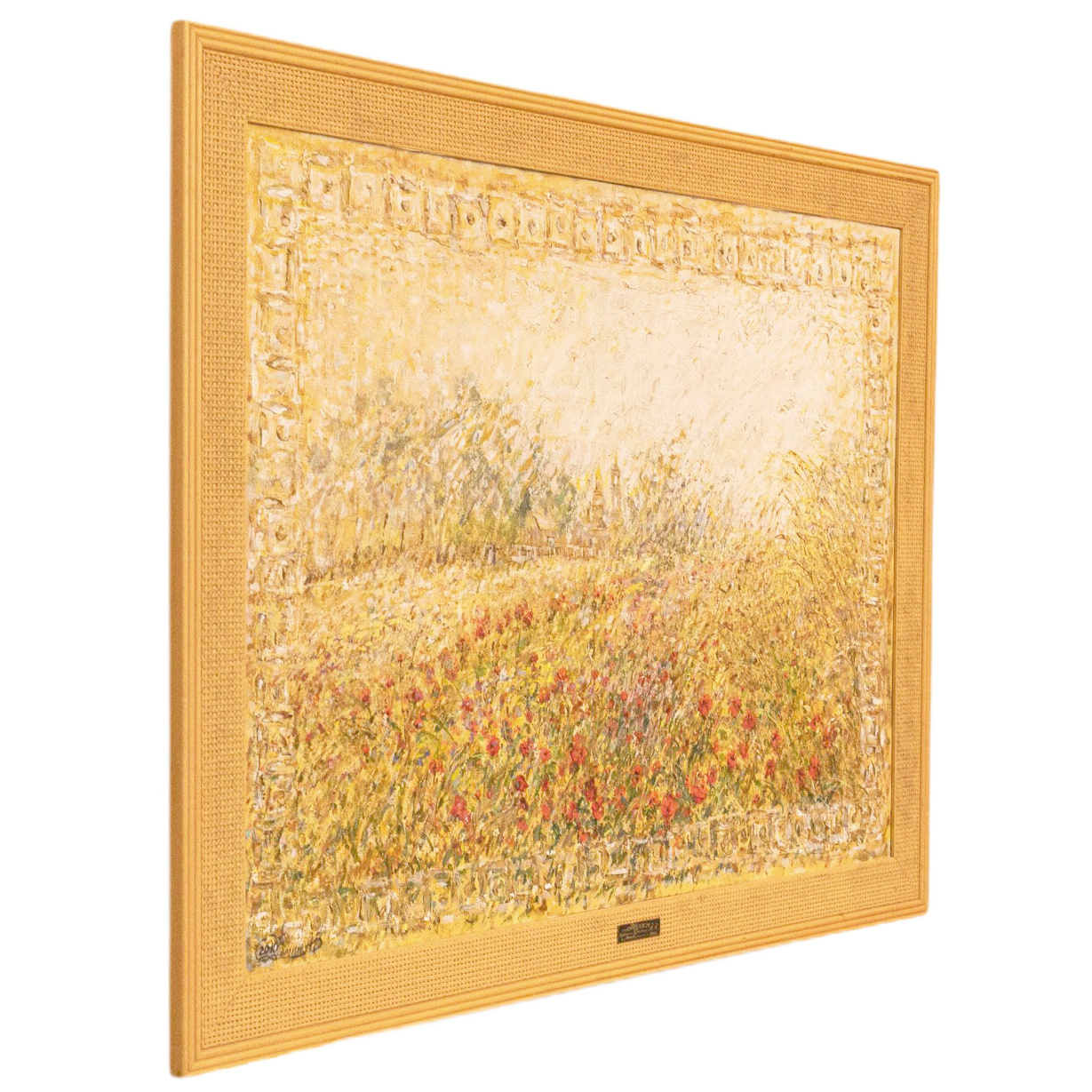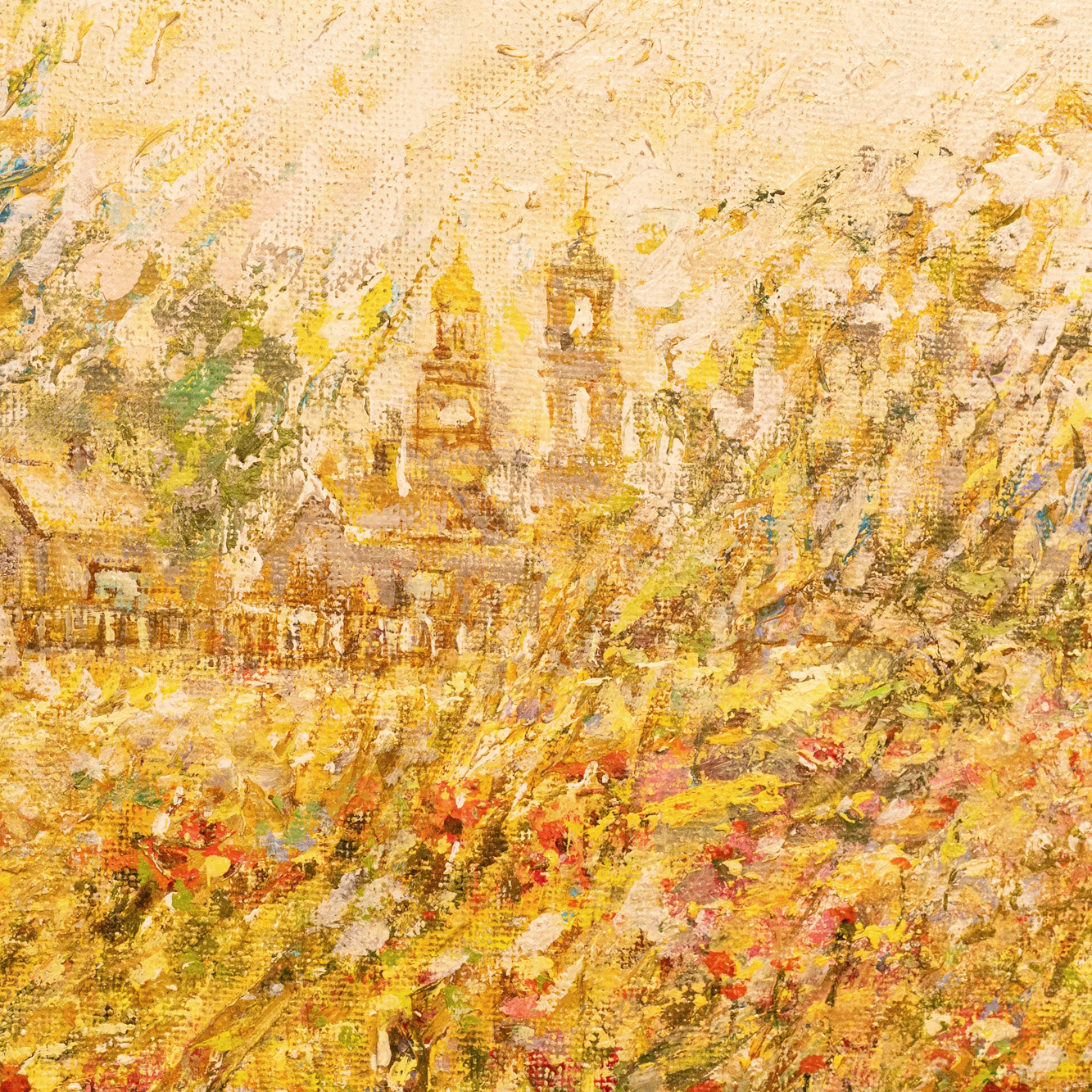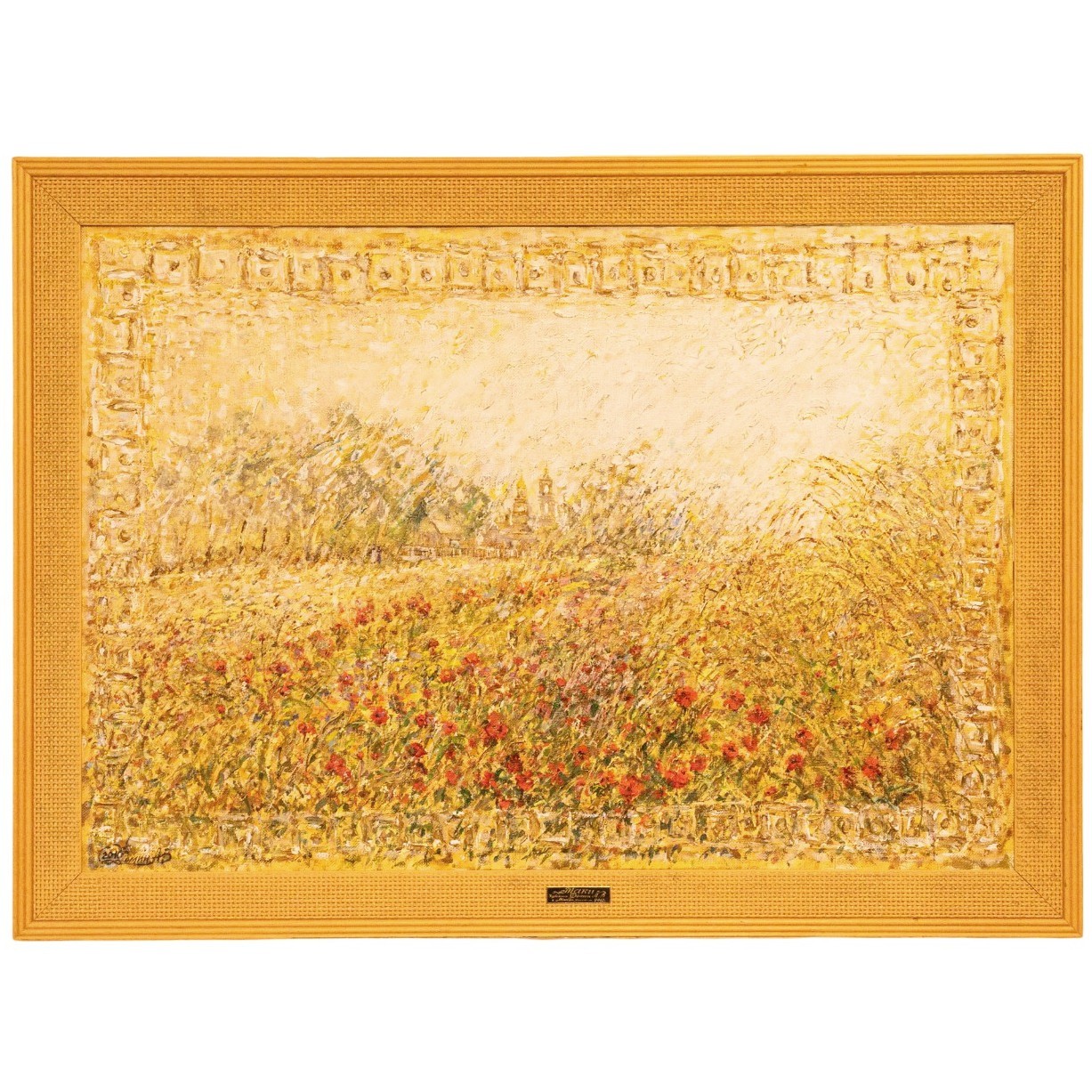 Авторская картина маслом «Маки» — это гимн лету, написанный языком света, цвета и дыхания полей. Пейзаж, сотканный из золота зреющей пшеницы и алых росчерков диких цветов, обрамлённый густой, словно выбитой рамкой, предстаёт не просто зрелищем природы, а настроением, переданным с безупречной живописной интуицией. На горизонте, сквозь прозрачную вуаль солнечного зноя, угадываются очертания храмовых башен — словно память о вечном, растворённая в зыбкости дня. Живописная поверхность буквально пульсирует: фактурная пастозность мазков создаёт эффект движения воздуха, шелеста трав, танца лепестков в порывах лёгкого ветра. Цветовая палитра выстроена в утончённой игре жёлтых, охристых, алых и белёсых оттенков, будто само полотно источает тепло. Эта работа не требует интерпретаций — она воздействует напрямую, пробуждая в зрителе чувство покоя, изобилия и тихой благодарности за мгновение, приподнятое над временем.