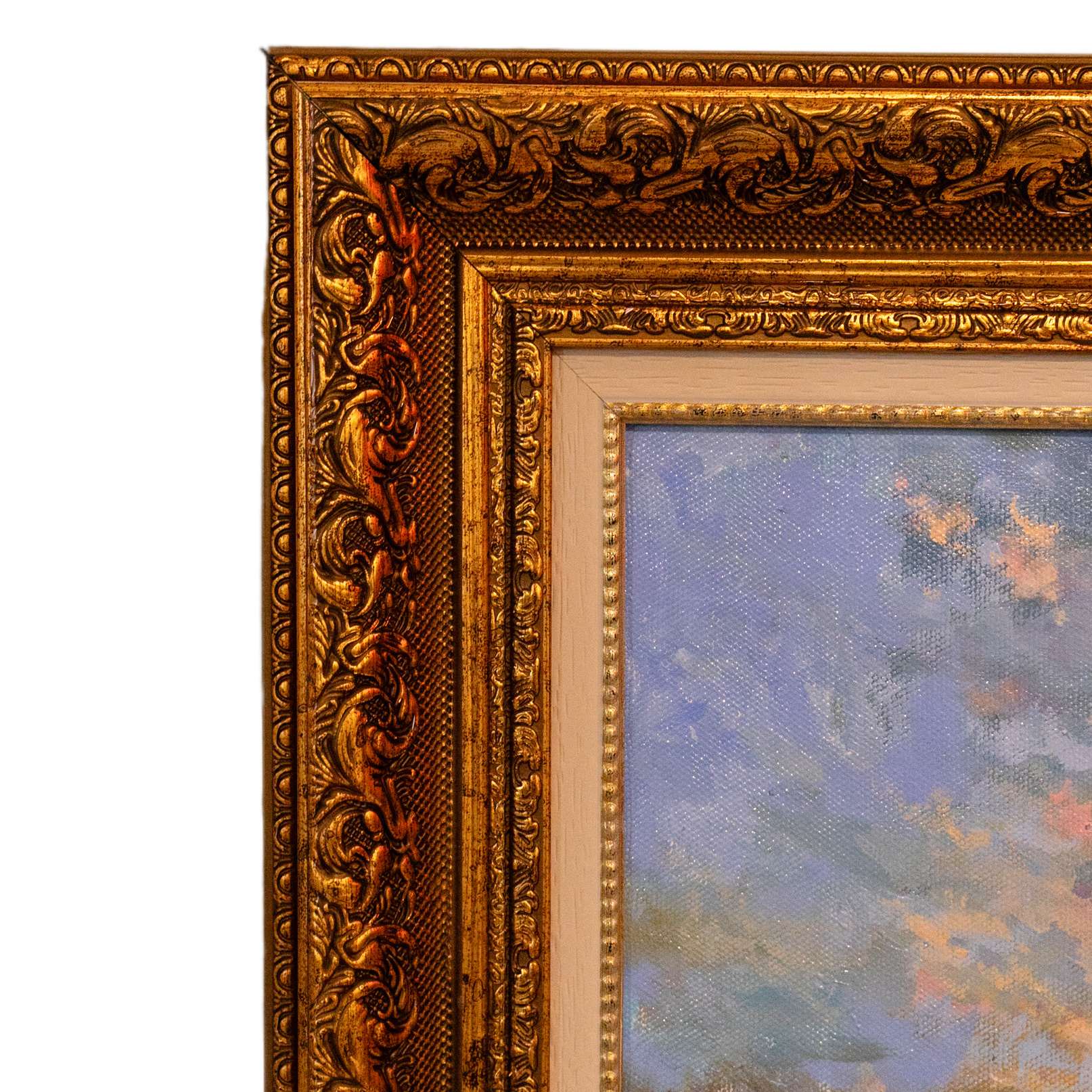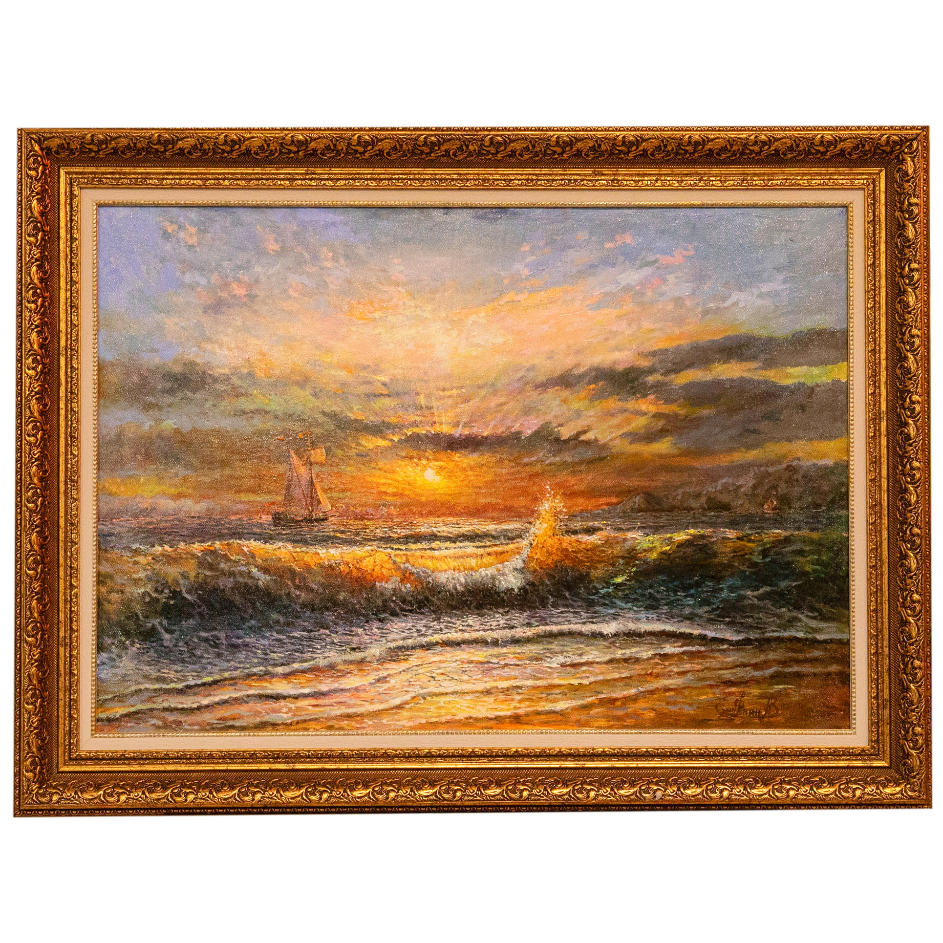 Авторская картина «Морской пейзаж» — это триумф света, захваченный в живом движении воды и неба. Мгновение, пойманное на стыке бурлящей стихии и безмолвного заката, переплавлено в густые масляные мазки, переливающиеся медью, янтарем и ультрамарином. Полотно передает вечный диалог между ветром и волнами, между тишиной горизонта и неудержимой энергией всплесков. На гребне света и пены появляется парусник — символ устремления, воли и одиночного пути сквозь многоликие краски судьбы. Мастер использовал сложную фактуру и многослойную технику наложения цвета, добившись объемности, в которой каждая волна словно дышит. Изящная багетная рама ручной работы, украшенная глубоким золочением и витиеватым орнаментом, завершает образ, подчеркивая монументальность морской сцены.