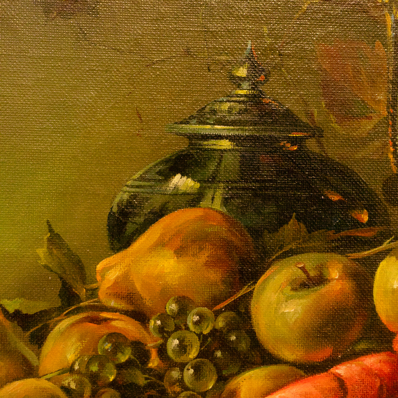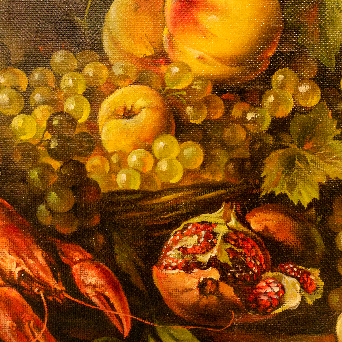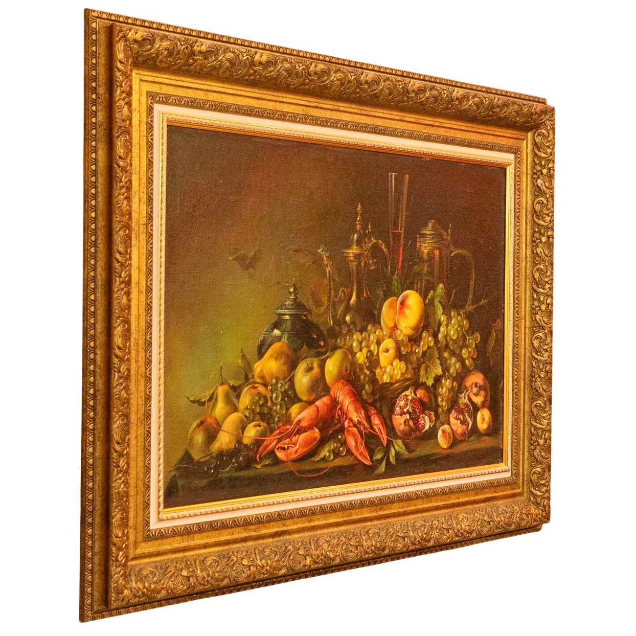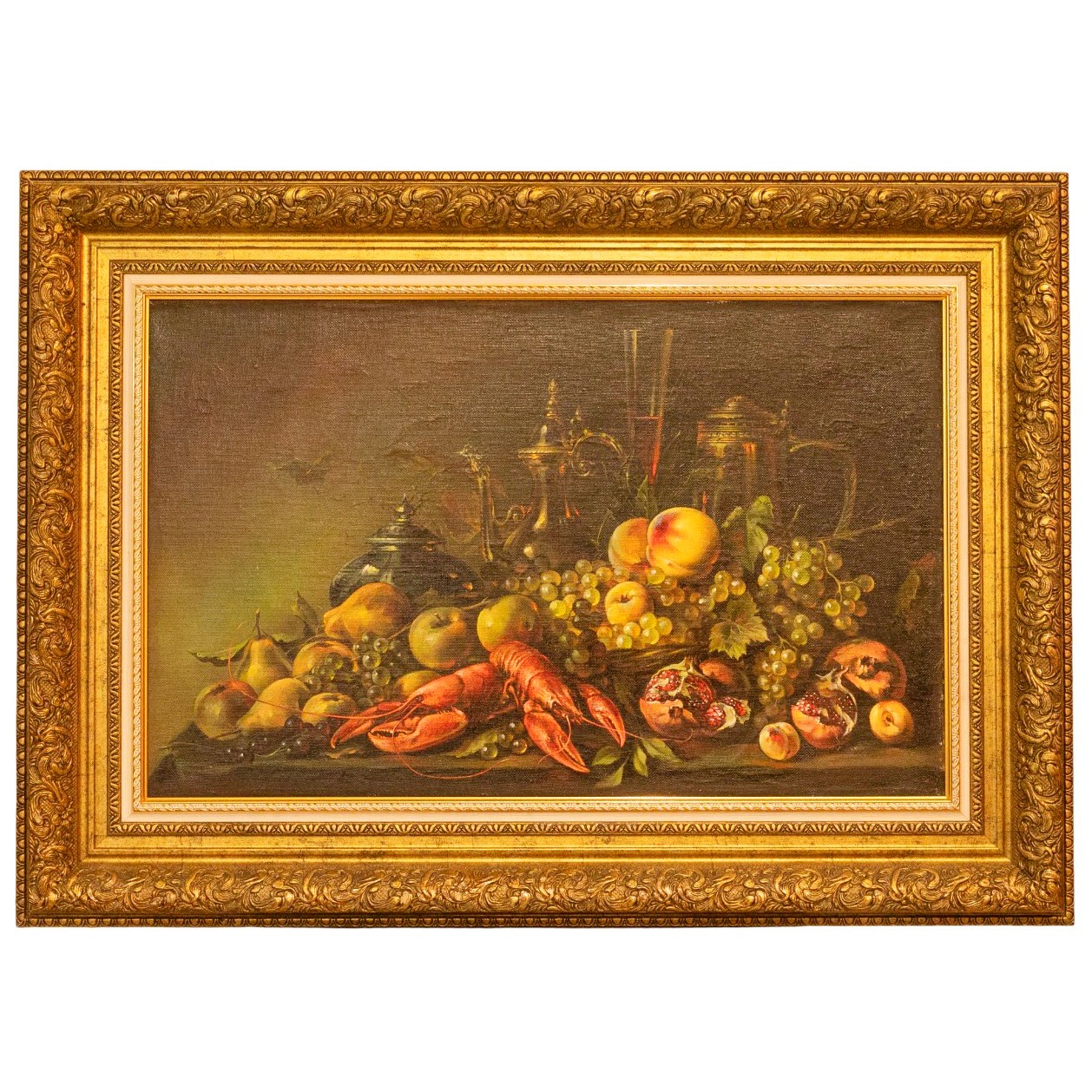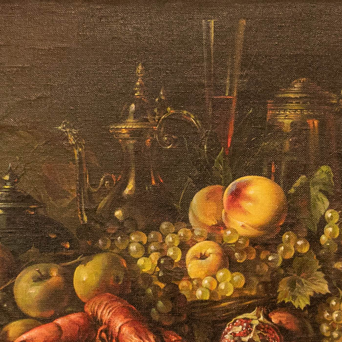 Авторская картина маслом «Натюрморт с фруктами» воплощает торжество изобилия и чувственного богатства в манере, близкой к классическим фламандским традициям. На тёмном фоне, поглощающем свет и усиливающем глубину пространства, выстроена барочная симфония предметов: спелые груши и яблоки, янтарные грозди винограда с фарфоровой прозрачностью ягод, бархатистые персики, изрезанные рубиновым зерном гранаты и благородный омар, сверкающий лакированной панцирной гладью. Тончайшие блики на выверенной поверхности бронзовых кувшинов и чайников, отголоски отражённого света в бокалах с вином, листва, подёрнутая дымкой зелени, — каждая деталь создана с невероятной точностью, будто вырезана из самой материи наслаждения. Композиция дышит покоем и насыщенностью, рождая ассоциации с застольями королевских домов и интерьером библиотек, где тишина и вкус идут рука об руку. Роскошная лепная рама не только усиливает декоративную ценность работы, но и превращает её в полноценный объект коллекционного уровня.