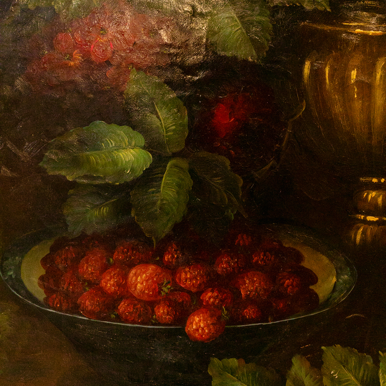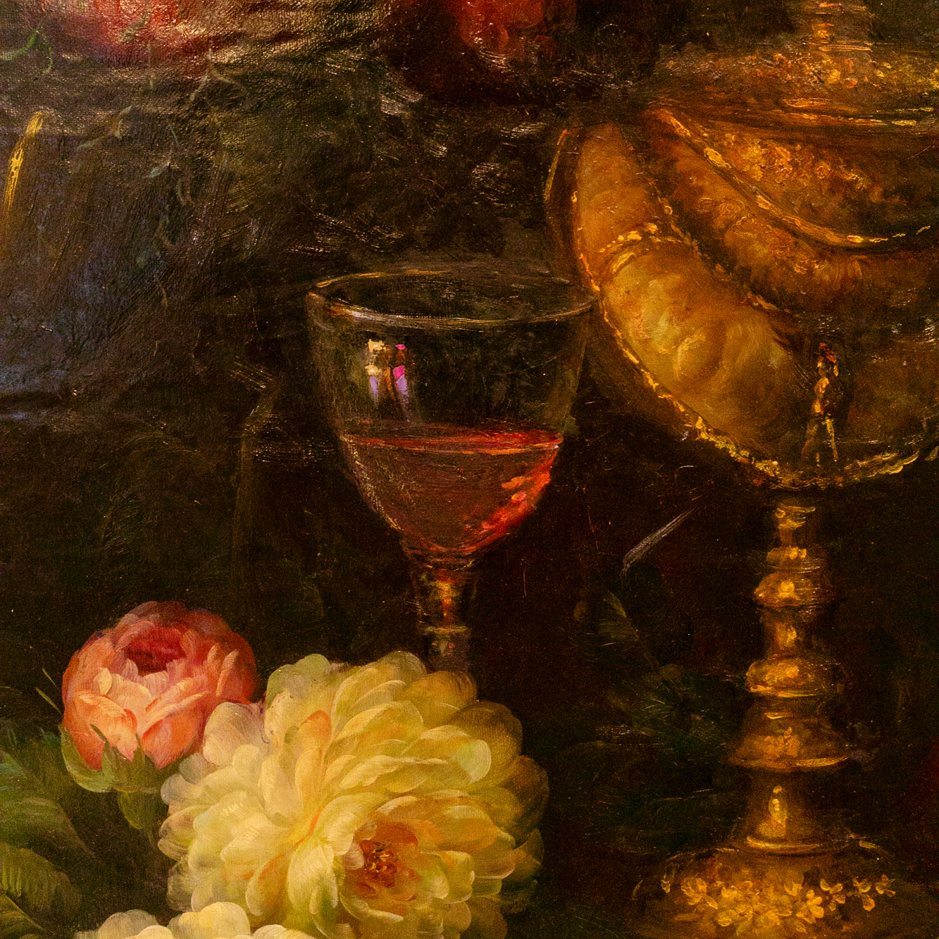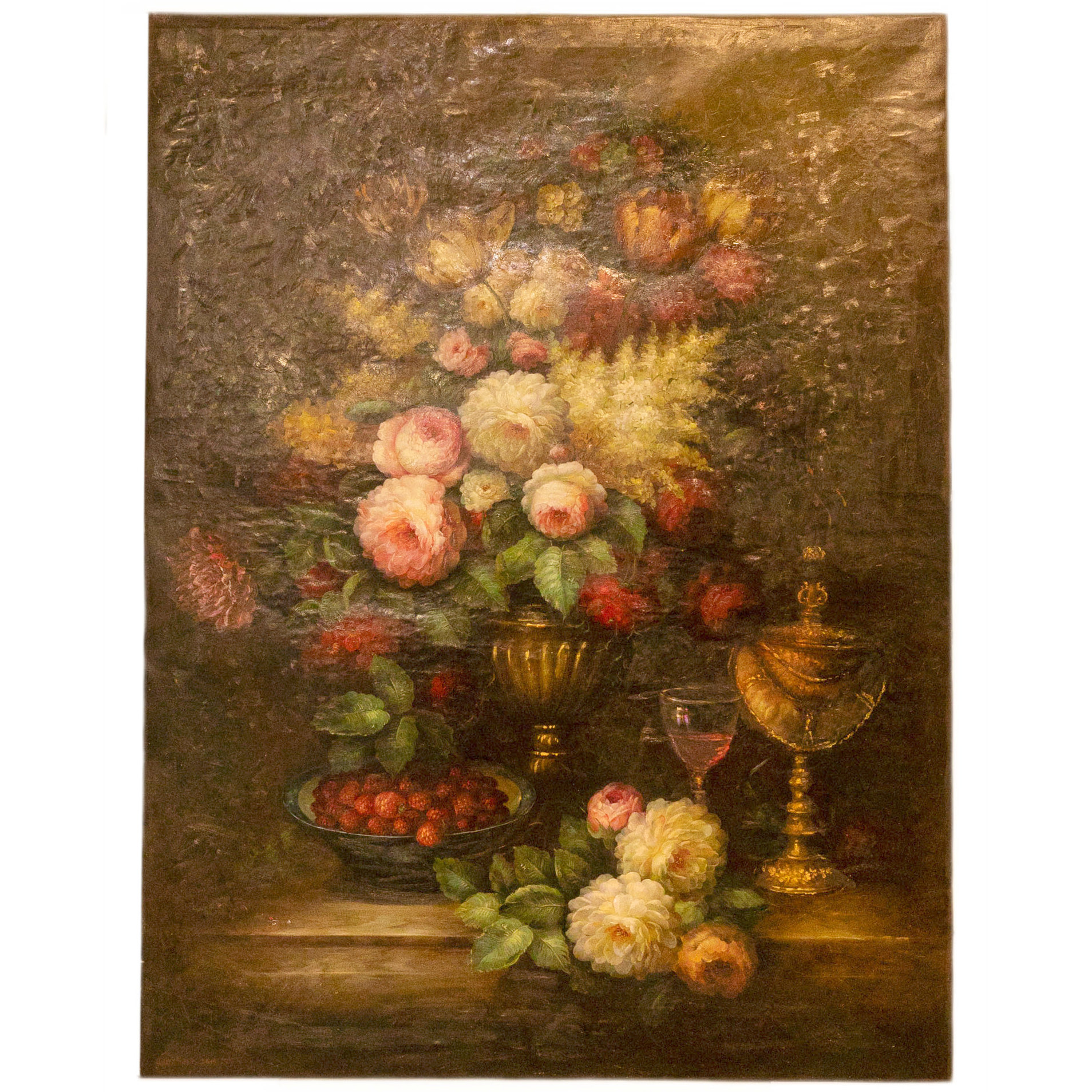 Низ композиции оформлен в духе старинного парадного натюрморта: здесь и глубокая чаша с малиной, писаной по всем канонам светотени, и бокал с вином, переливающимся отблесками света, и драгоценная шкатулка, отливающая матовым золотом. Все элементы — от позолоченного сосуда до бархатной зелени листвы — наполнены густой символикой и атмосферой эпохи. Ветви цветов опираются на край каменной столешницы, как будто приглашая зрителя заглянуть внутрь этой изысканной тишины, где время будто замирает, уступая место вечной гармонии.