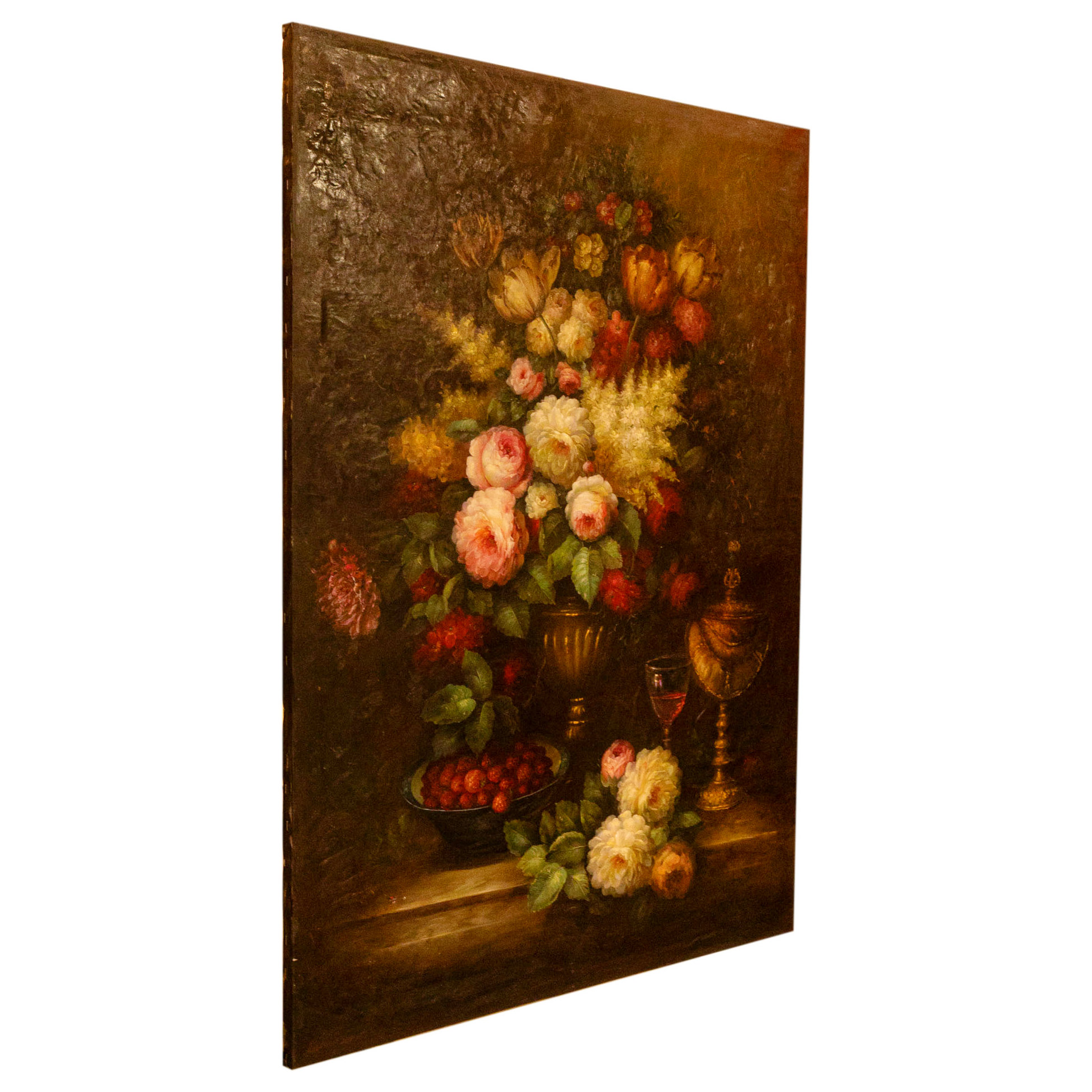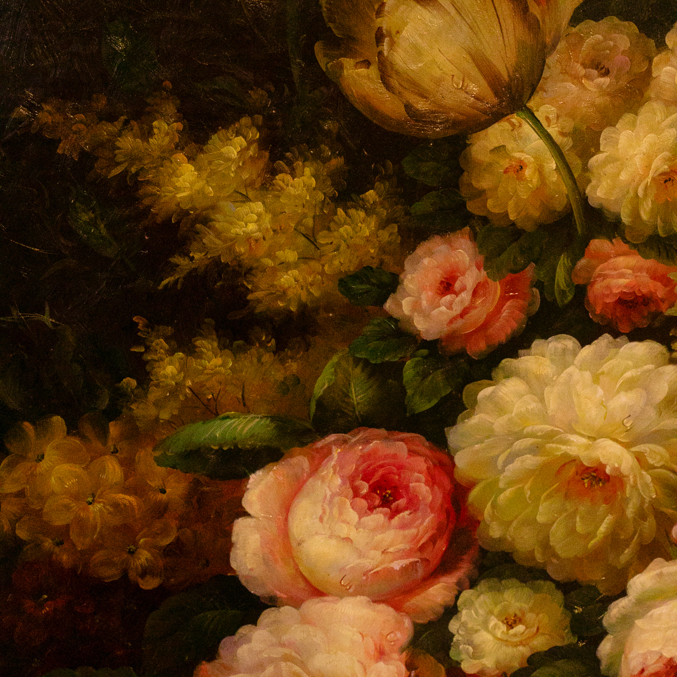 Масло на холсте раскрывает перед зрителем утонченную сцену, вдохновлённую голландскими традициями и пронизанную ощущением благородного покоя. Обилие бутонов пионов и роз, распустившихся в хрустальной тишине теней, наполнено барочной насыщенностью и изысканной композицией. Цветы, словно сошедшие со страниц старинного гербария, плавно стекают из бронзовой вазы, перетекая в пространство холста и сливаясь с фоном, написанным в густых, тёплых полутонах. Каждый лепесток, приоткрывшийся к свету, живёт собственной жизнью, воспевая плоть природы как высшее проявление красоты.