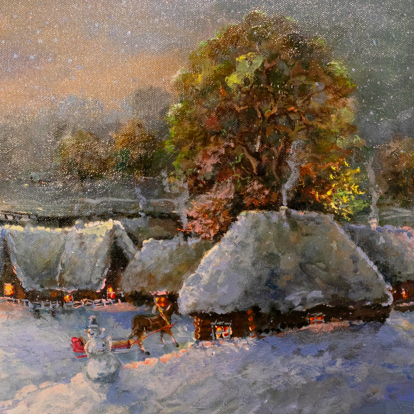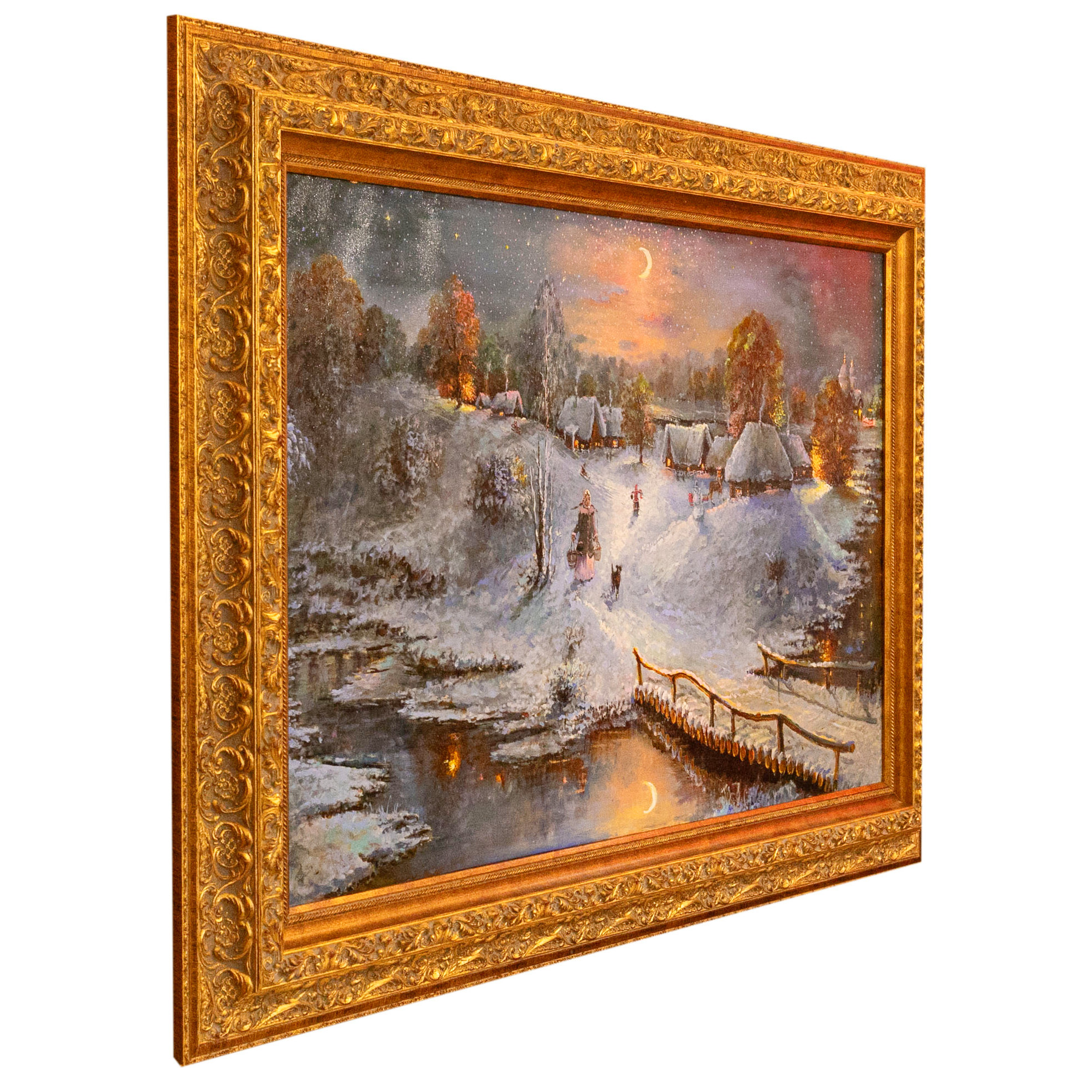 Картина маслом "Ночь перед Рождеством" — живописная симфония деревенской тишины и праздничного ожидания, исполненная с филигранной теплотой и вниманием к деталям. Тончайшие мазки создают целый мир: заснеженные избы, тропинки, уводящие вдаль, и золотой свет, струящийся из окон домов, отражается в хрустальном льду речки. Луна, подвешенная над зимним пейзажем, не просто освещает сцену — она добавляет ей мистическое очарование. Сквозь заснеженную равнину идут сельские женщины с ведрами, дети играют и катаются на санках, — жизнь в этой деревне течёт неторопливо, слаженно, наполнена уютом и заботой. Лошадиная упряжка, пушистый снеговик, дым из труб — каждый элемент пронизан настроением доброй сказки. Всё это заключено в раму музейного уровня, покрытую золотым тиснением с орнаментом старинной школы, — она завершает образ, подчеркивая его статусность и художественную ценность.
