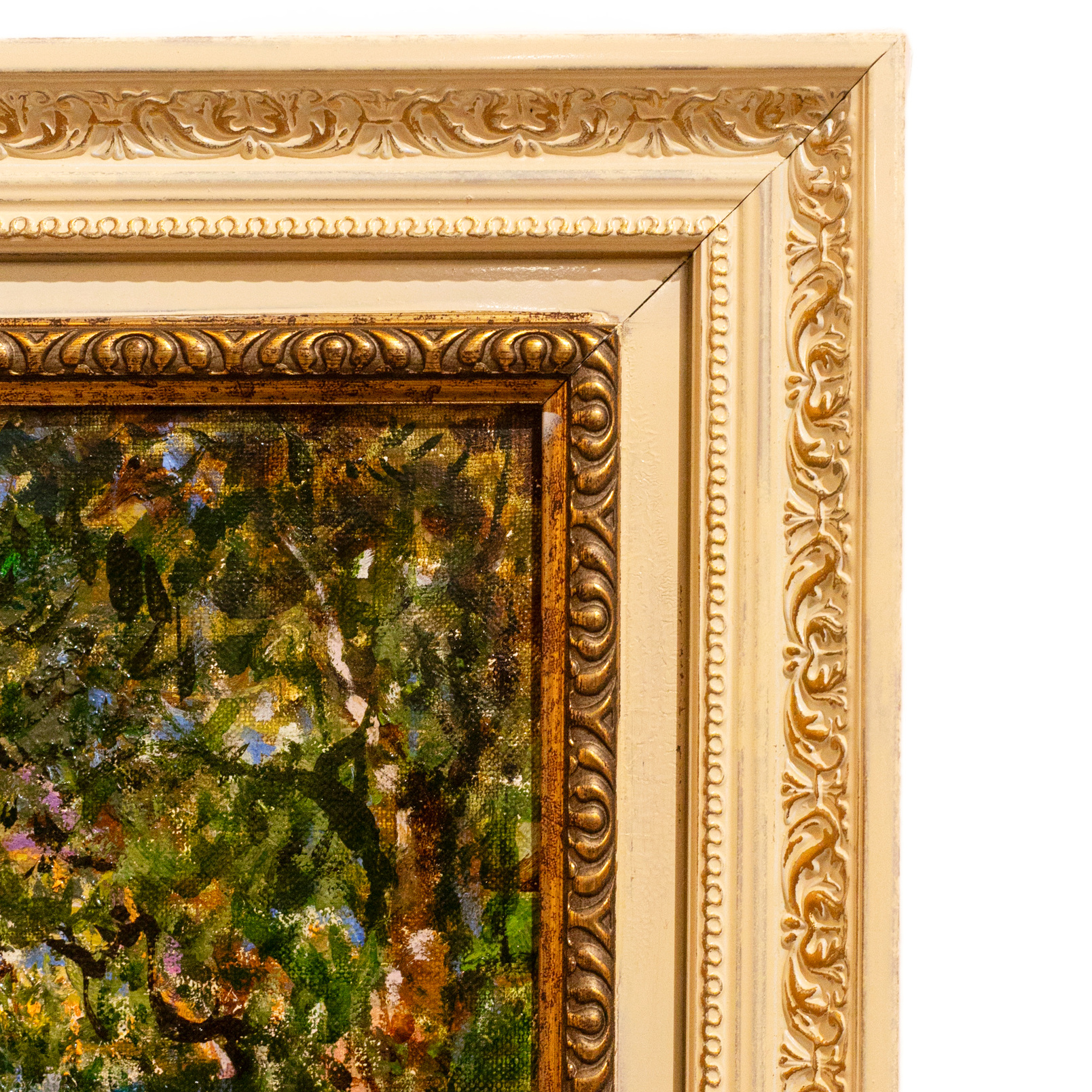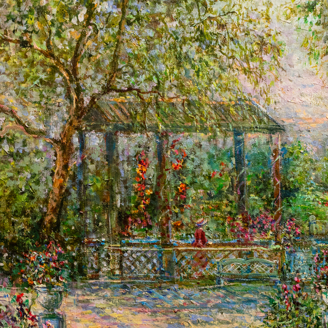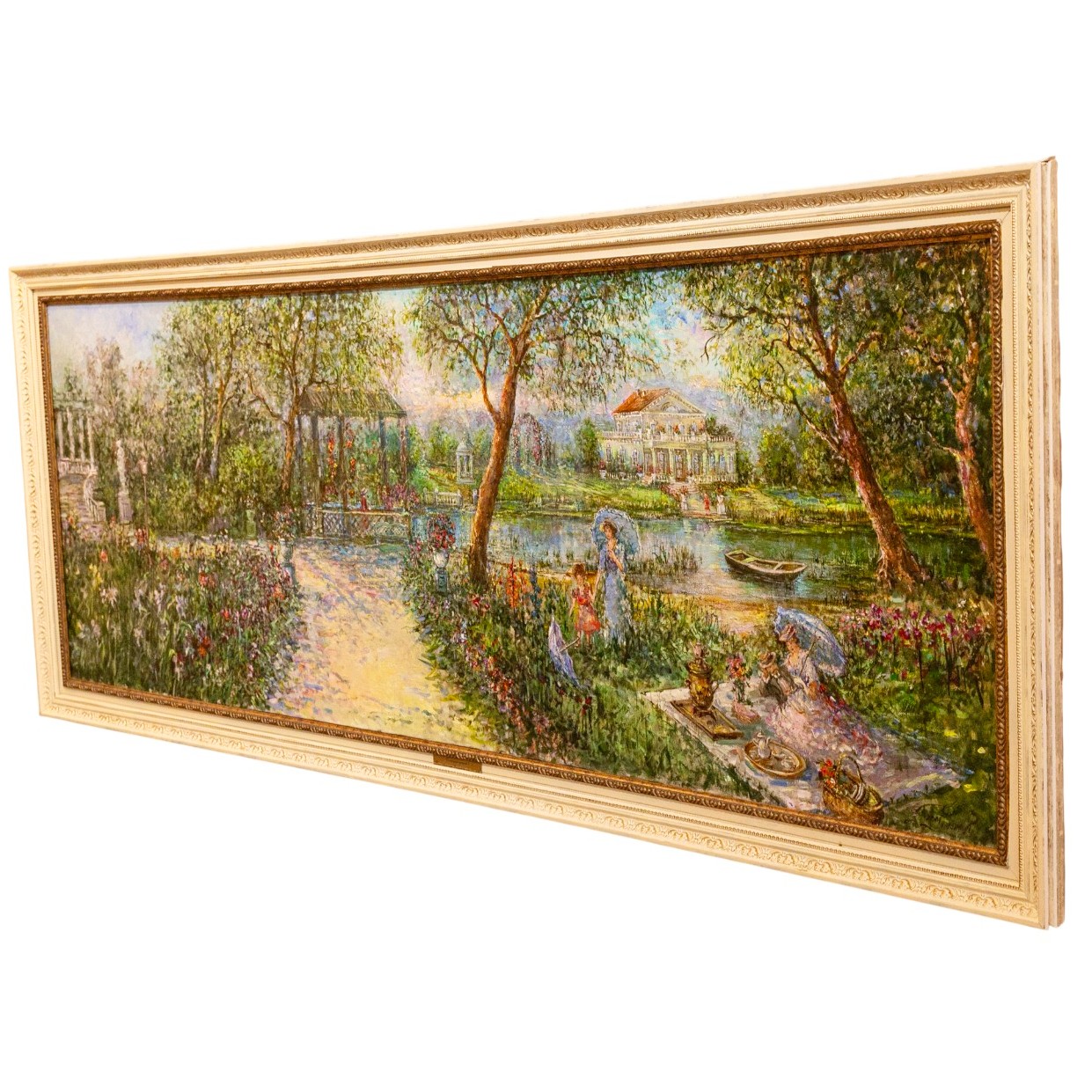 Картина маслом «Останкинский пруд» — изысканный образец импрессионистской живописи, пронизанный светом, воздухом и спокойствием золотого летнего дня. В панорамной композиции раскрывается идиллический уголок дворянской усадьбы, утопающей в цветущем саду. Лепестки ирисов и пионов колышутся от едва уловимого ветерка, солнечные лучи, пробиваясь сквозь листву, танцуют на дорожках, воде и одеждах персонажей. В центре сцены — семья за чаепитием на берегу пруда, накрытый скатертью стол, самовар, цветы в вазах, книги и воздушные зонтики в руках дам придают композиции особую утончённость. Изящная беседка, лодка на глади воды и элегантный усадебный дом с пышными клумбами в перспективе подчеркивают атмосферу покоя, уюта и респектабельности. Колорит полотна построен на светлых пастельных оттенках с тонкими вкраплениями розового, бирюзового, зелёного и золотого, создавая ощущение перламутрового свечения. Техника мазка динамична, наполнена жизнью, — всё дышит и переливается, словно летний день застыл на мгновение в вечности.