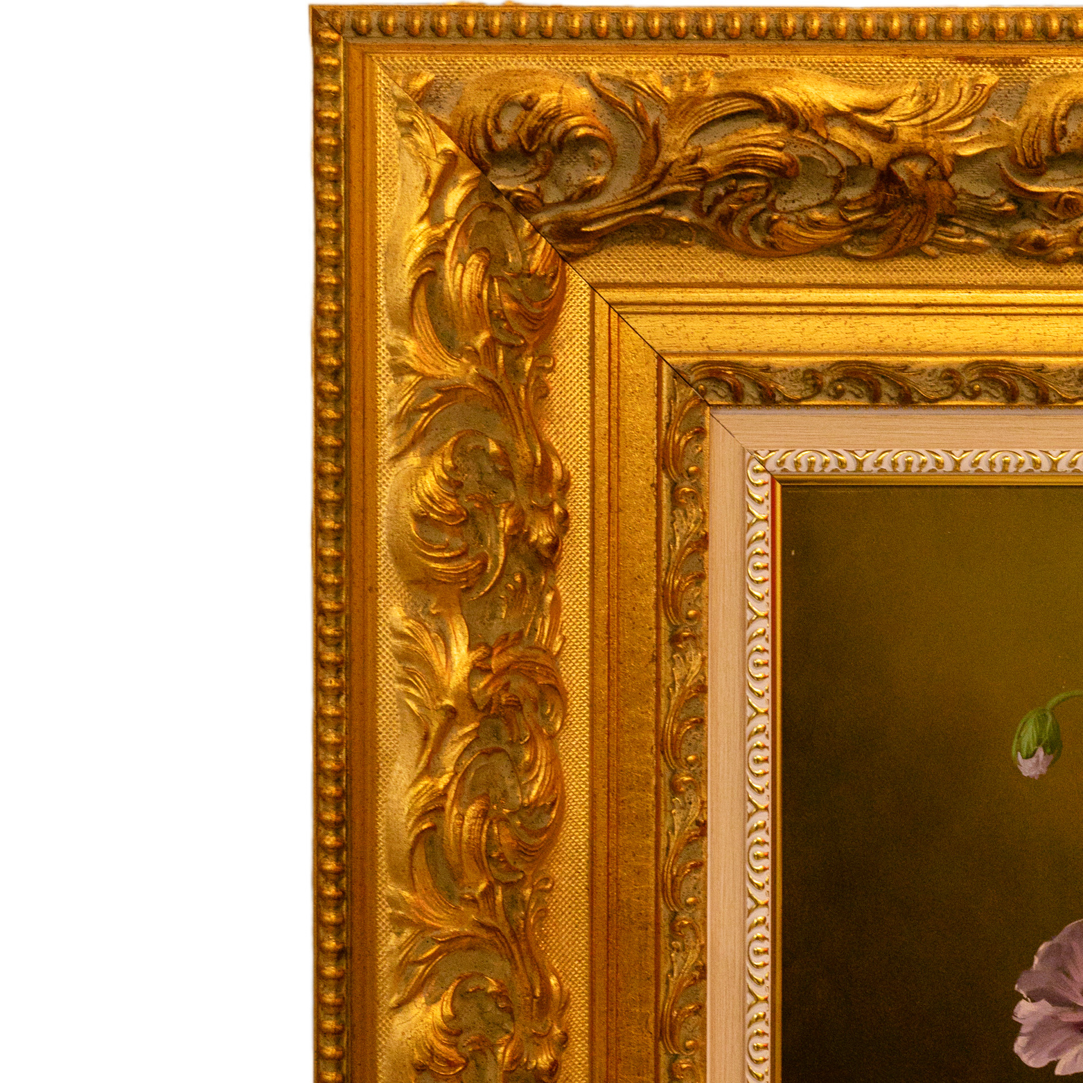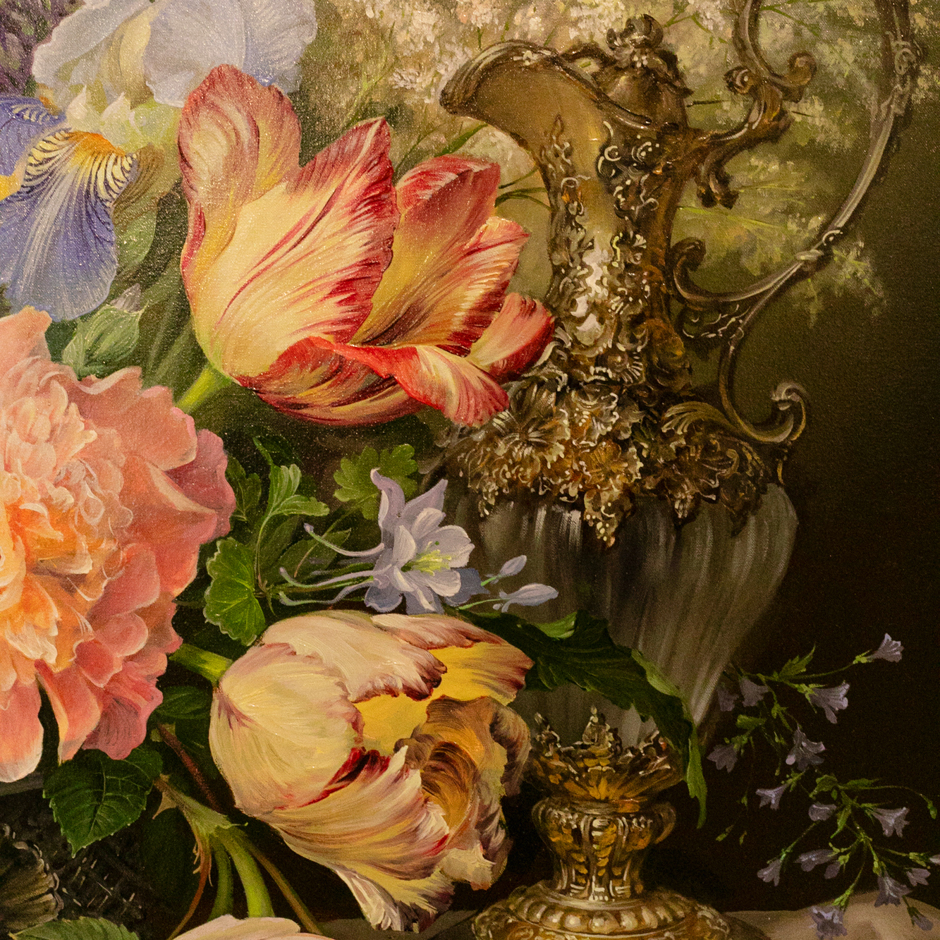 Картина маслом «Пионы» — классический парадный натюрморт, исполненный в лучших традициях европейской школы живописи. Богатая цветочная композиция, размещённая на фоне темного фона, зачаровывает своей торжественностью и утончённой изысканностью. Пышные пионы — главные герои полотна — обрамлены сложной симфонией из ирисов, гортензий, утренней росы на листьях, а также рельефных бутонов, будто только что раскрытых светом утреннего солнца. Каждый лепесток проработан с академической точностью, почти скульптурной осязаемостью. Серебряная ваза с растительным орнаментом отбрасывает световые блики на бархатную драпировку, мягко ниспадающую на стол. Позолоченные кубки, расположенные на первом плане, добавляют сцене величия и музейной торжественности, уравновешивая насыщенность цветовой гаммы благородным металлом. Картина оформлена в роскошную багетную раму цвета старого золота, с глубоким рельефом и растительным узором, подчёркивающим декоративную силу композиции.