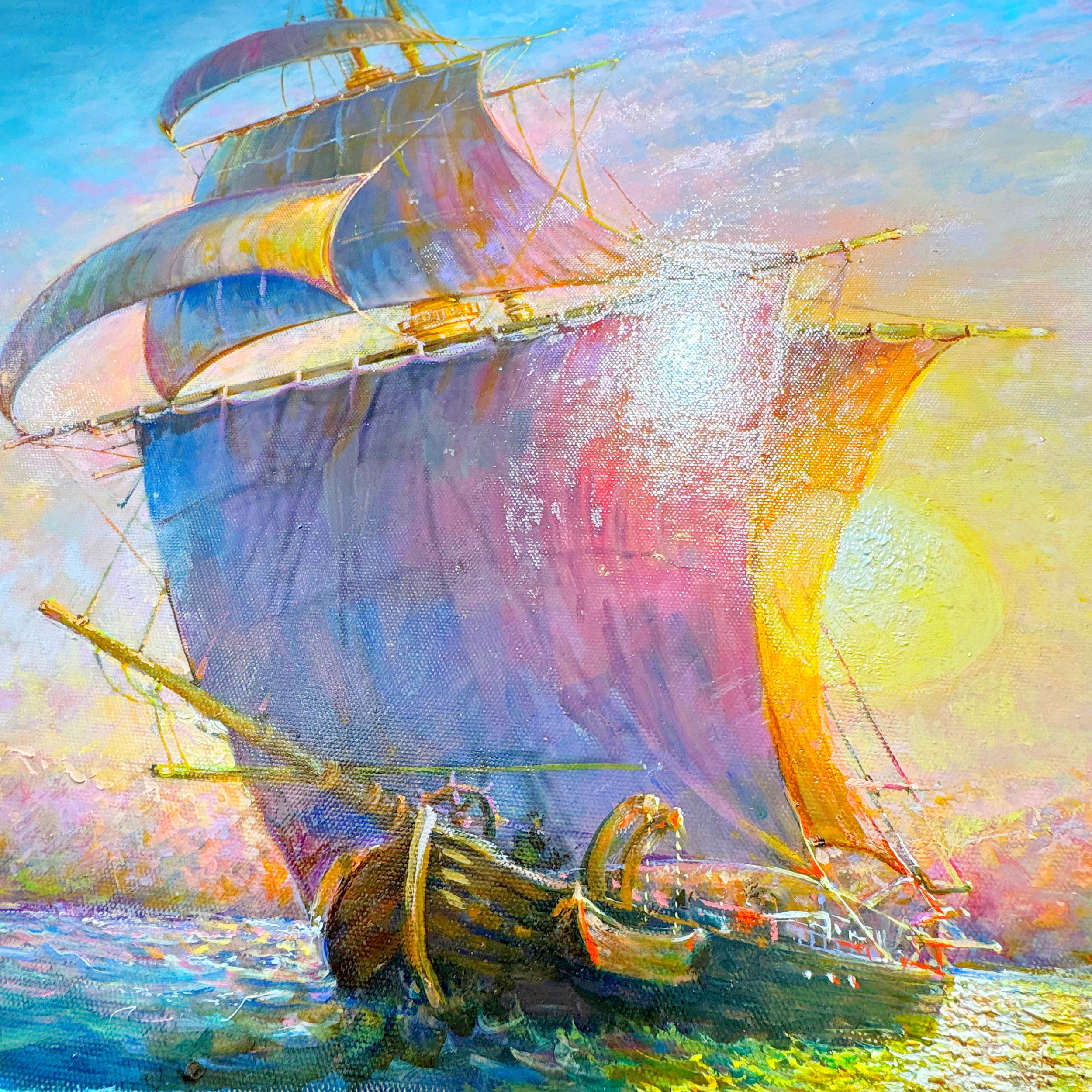 Такое произведение подходит коллекционерам, ценителям морской романтики, инвесторам в современное искусство и владельцам изысканных интерьеров, желающим вложить в пространство предмет, заряженный смыслом. Эта картина говорит без слов: о мечте, пути, о солнце, которое всегда впереди — нужно лишь решиться плыть навстречу ему.