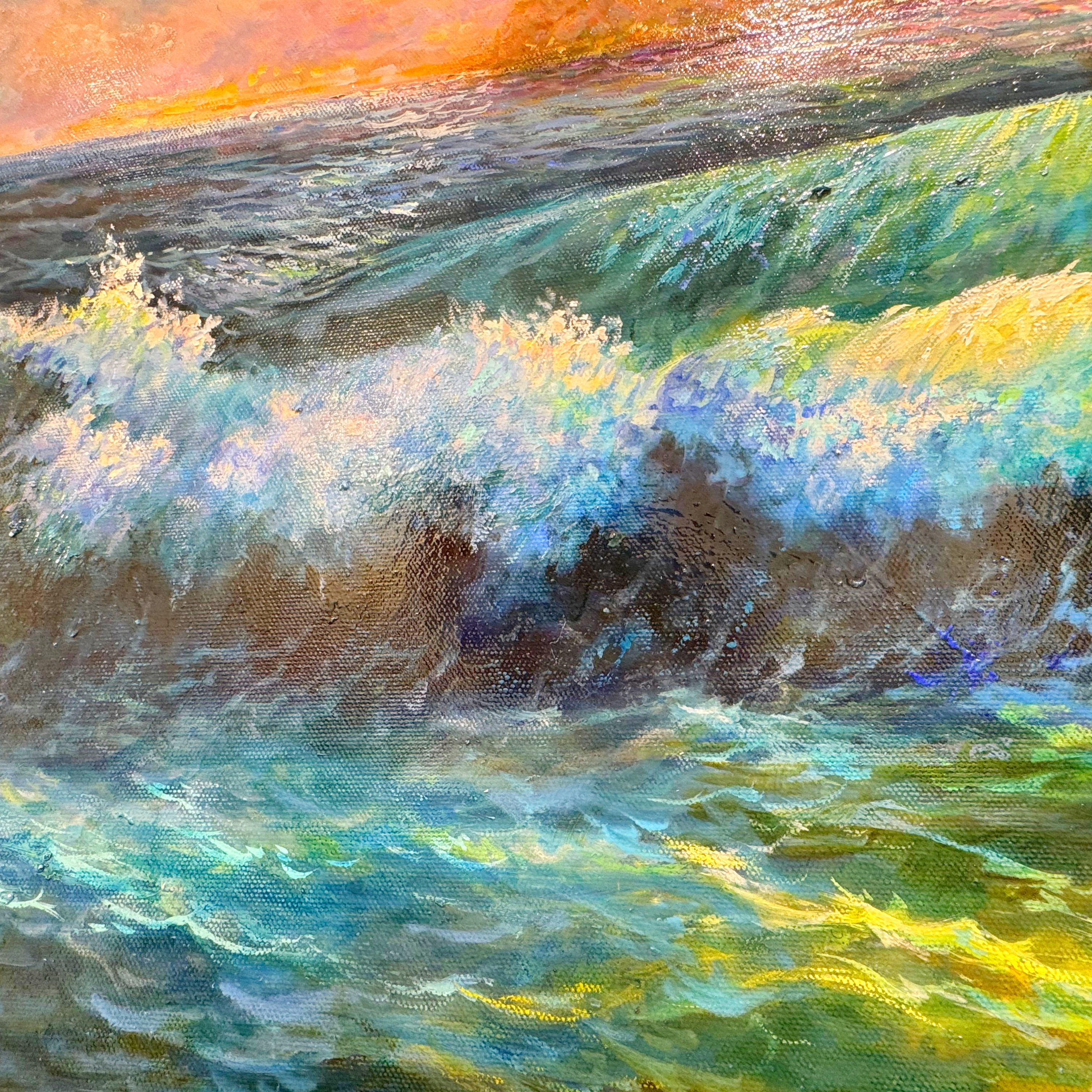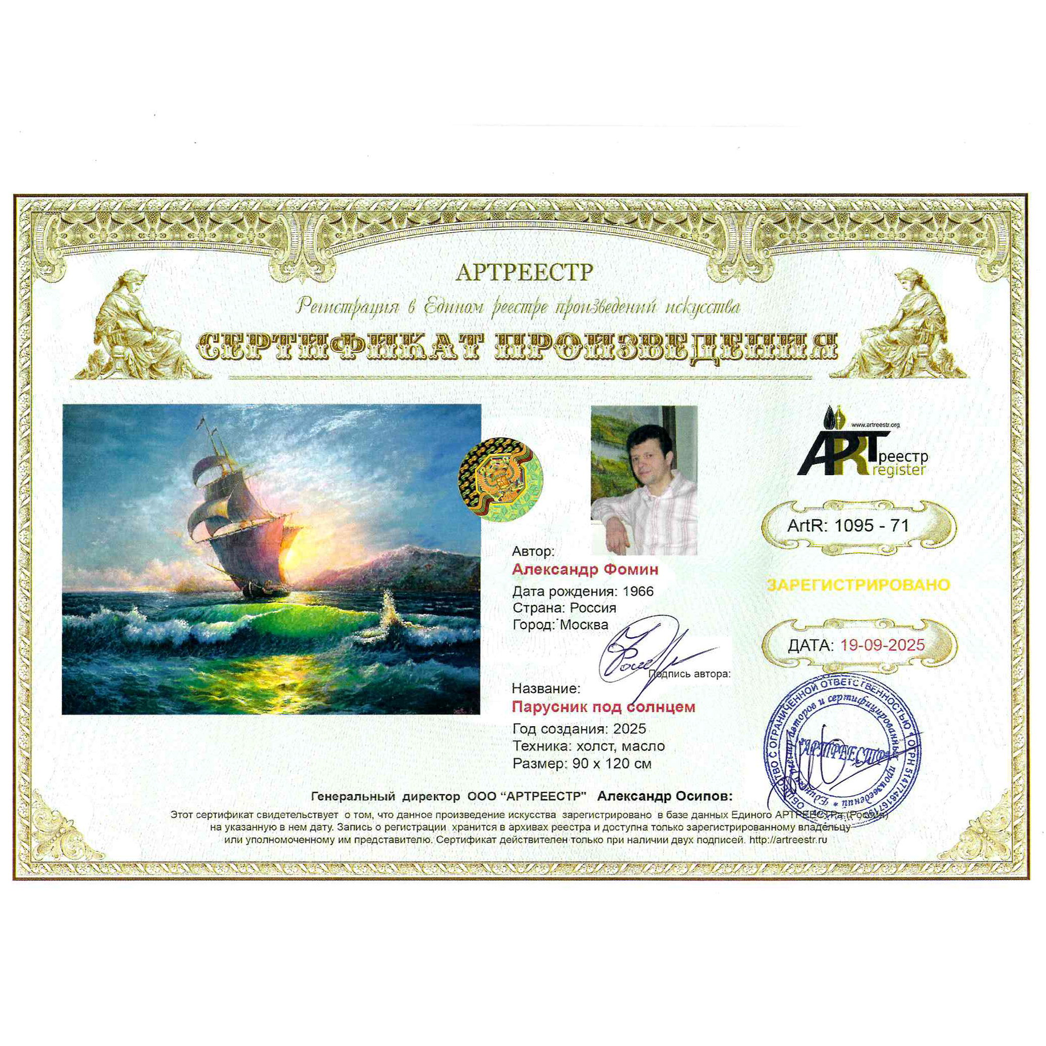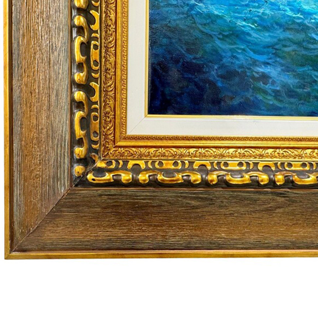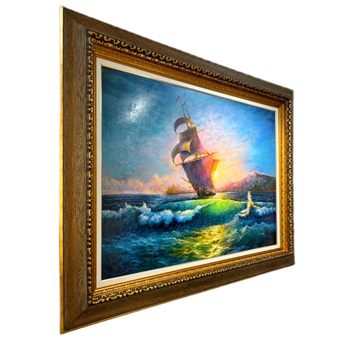 Палитра художника построена на сложных переливах ультрамарина, лазури, охры, пурпура и золота — они сливаются в магическую симфонию цвета, наполняющую полотно теплом, будто исходящим изнутри холста. Мастихиновые мазки волн придают морю рельефность, а контраст холодных и тёплых тонов подчёркивает стремительный силуэт корабля — сосредоточие энергии, будто бы идущей из другого мира. Золочёный багет ручной работы завершает образ, создавая обрамление, достойное музейного экспоната.