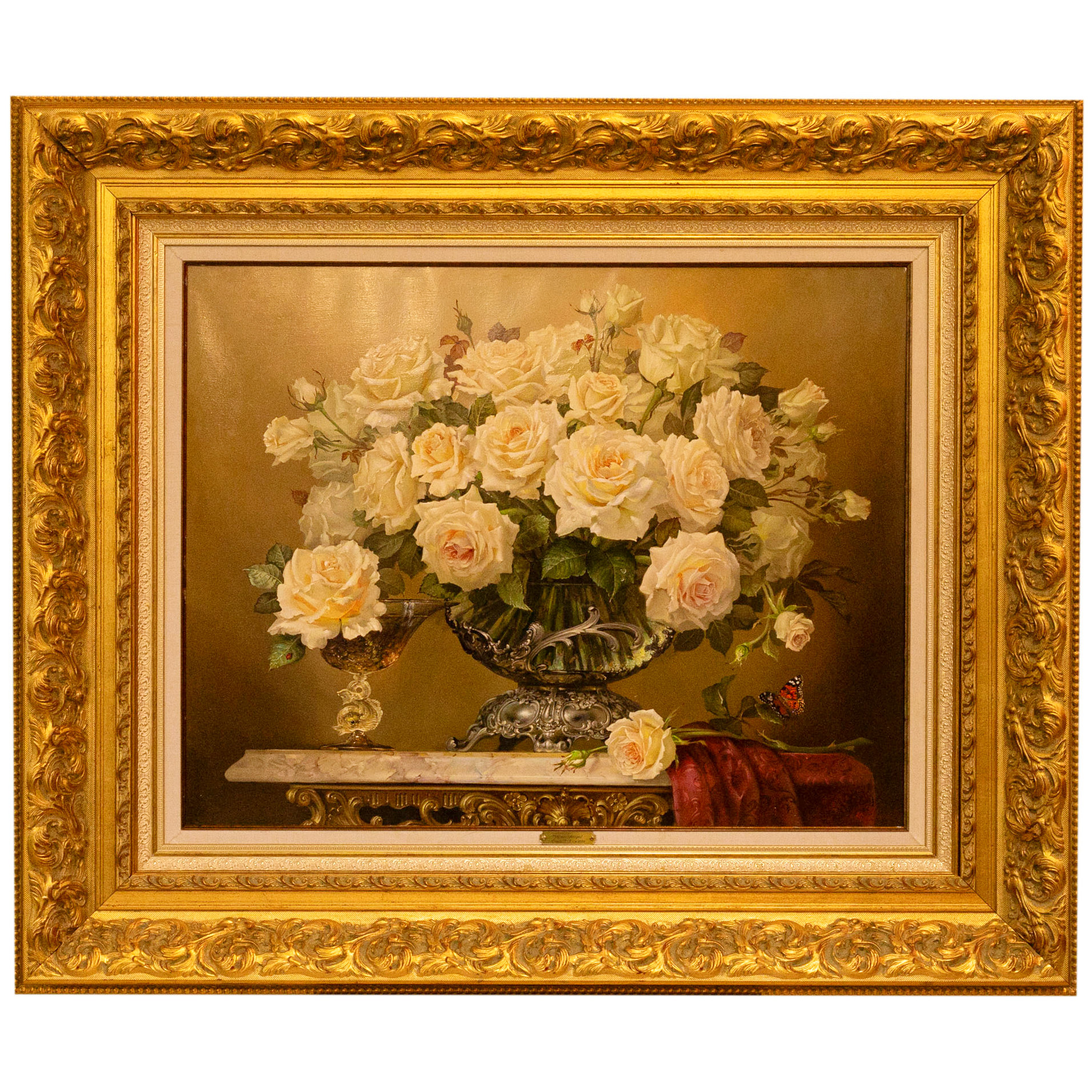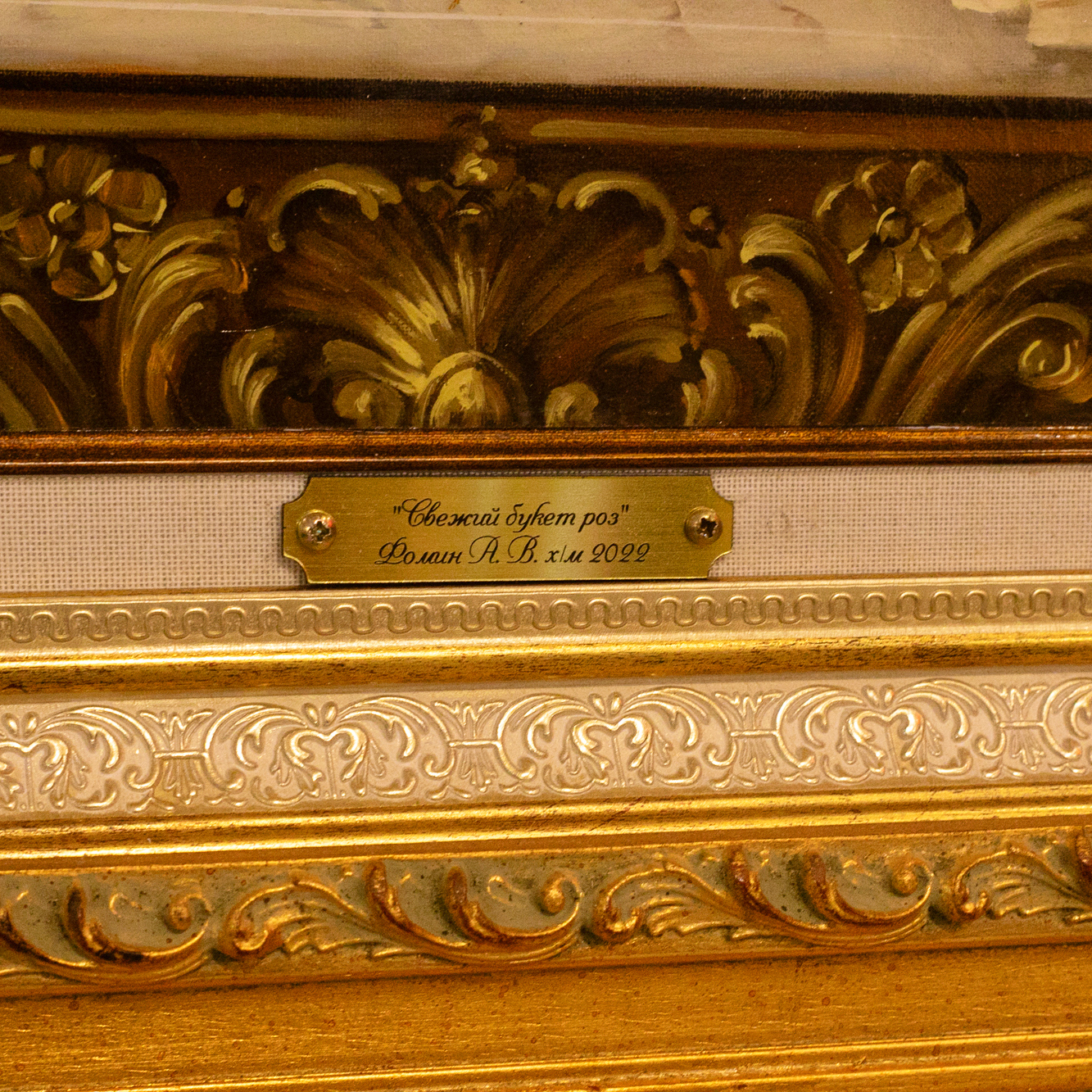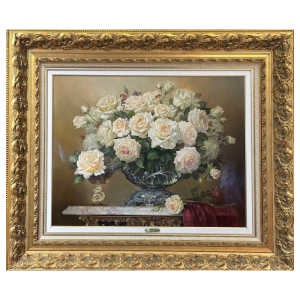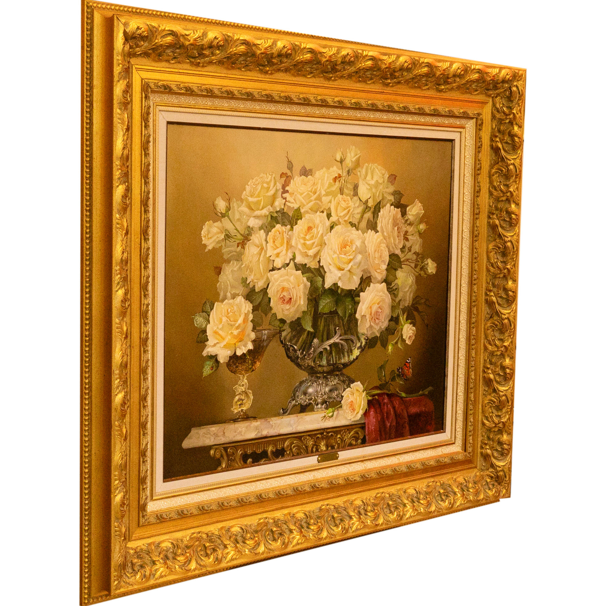 Живописное полотно «Свежий букет роз» — это безукоризненный образец классического масляного натюрморта, выполненного с филигранной точностью, в котором дыхание живой природы застыло в торжественном великолепии цветочной симфонии. Изящные розы сливочного оттенка, распустившиеся в тяжелом серебряном сосуде, каждая со своим неповторимым рельефом лепестков, окутаны мягким сиянием утреннего света. Их бархатистая свежесть подчеркнута присутствием кристально прозрачной вазы, обвитой тонкими стеблями, и невесомой бабочки, замершей на красной парче, словно в попытке соприкоснуться с этим торжественным великолепием. В глубокой тени, позади хрупкой гармонии цветов, угадывается фон из теплого золотистого свечения, делающий композицию почти сакральной. Пышная рама из золочёного дерева с богатым растительным орнаментом не только завершает образ, но и отсылает к дворцовой эстетике XIX века, создавая ощущение музейной значимости произведения.