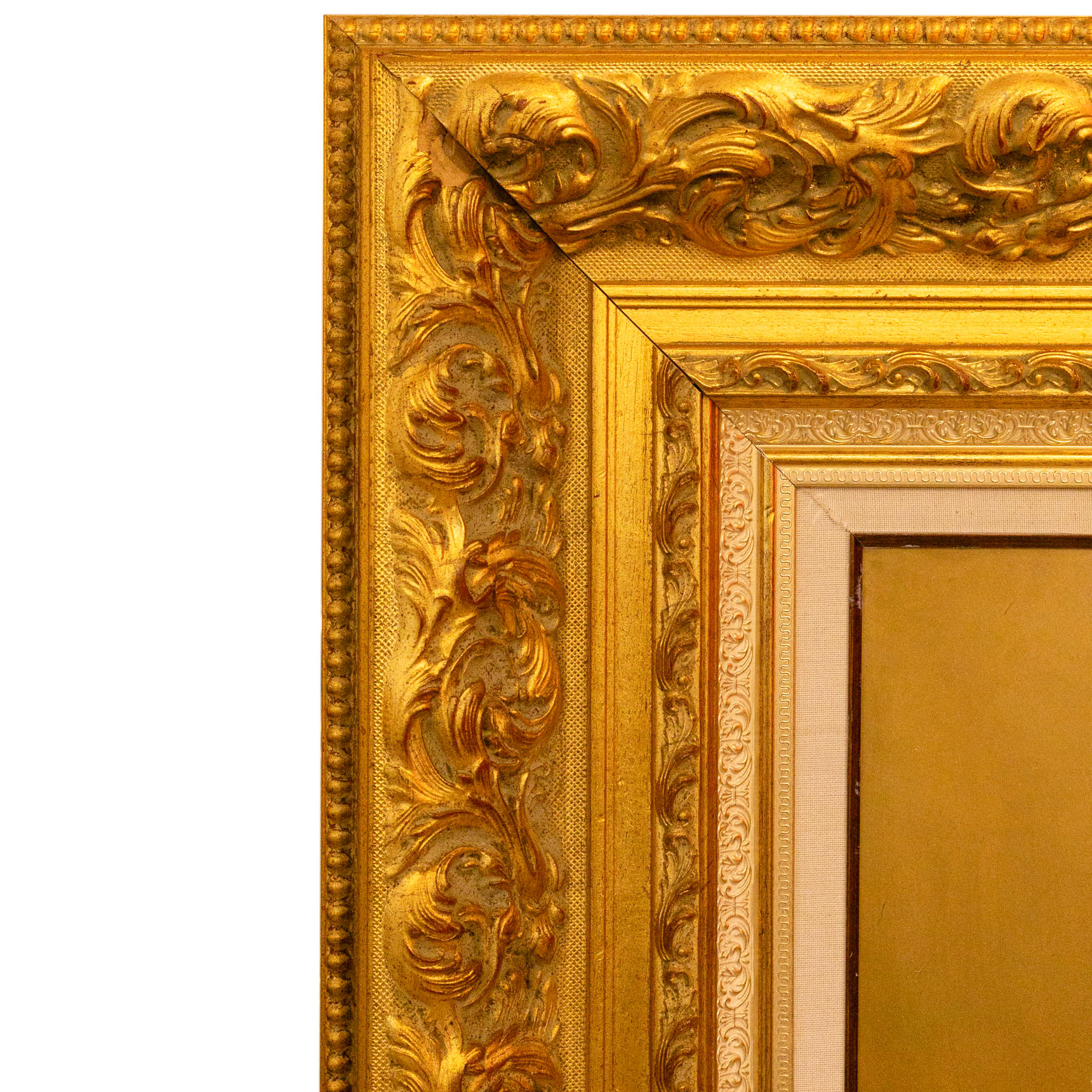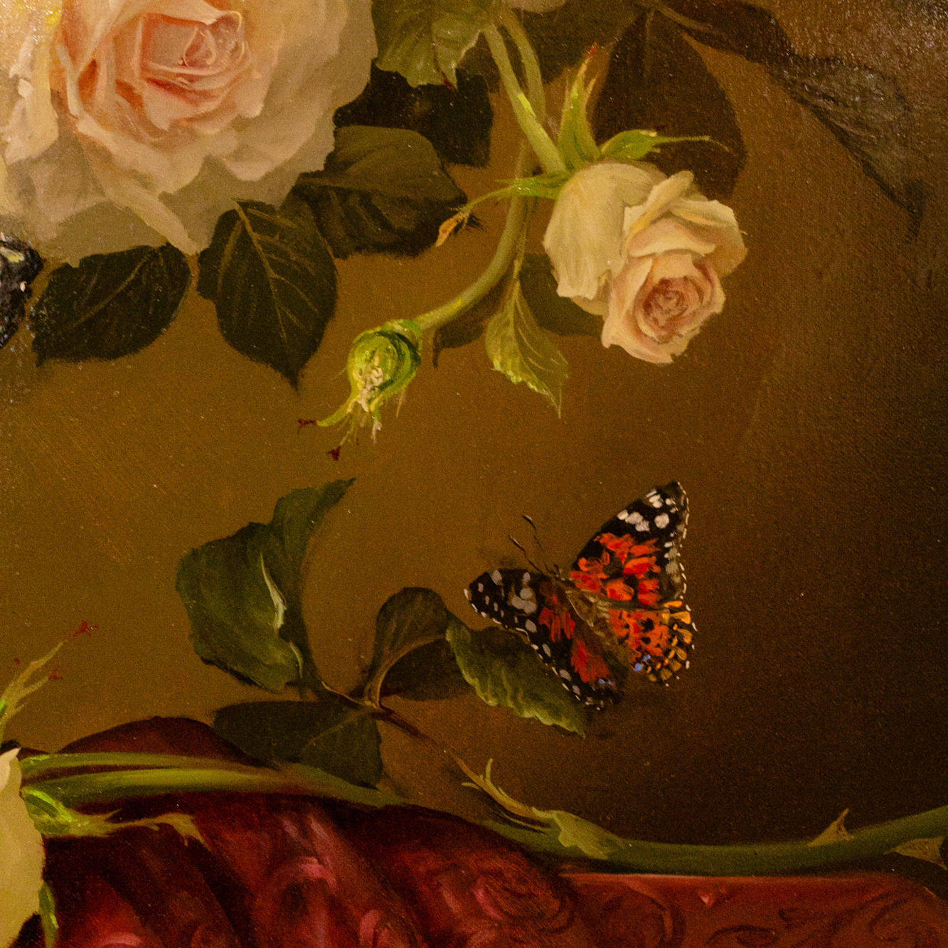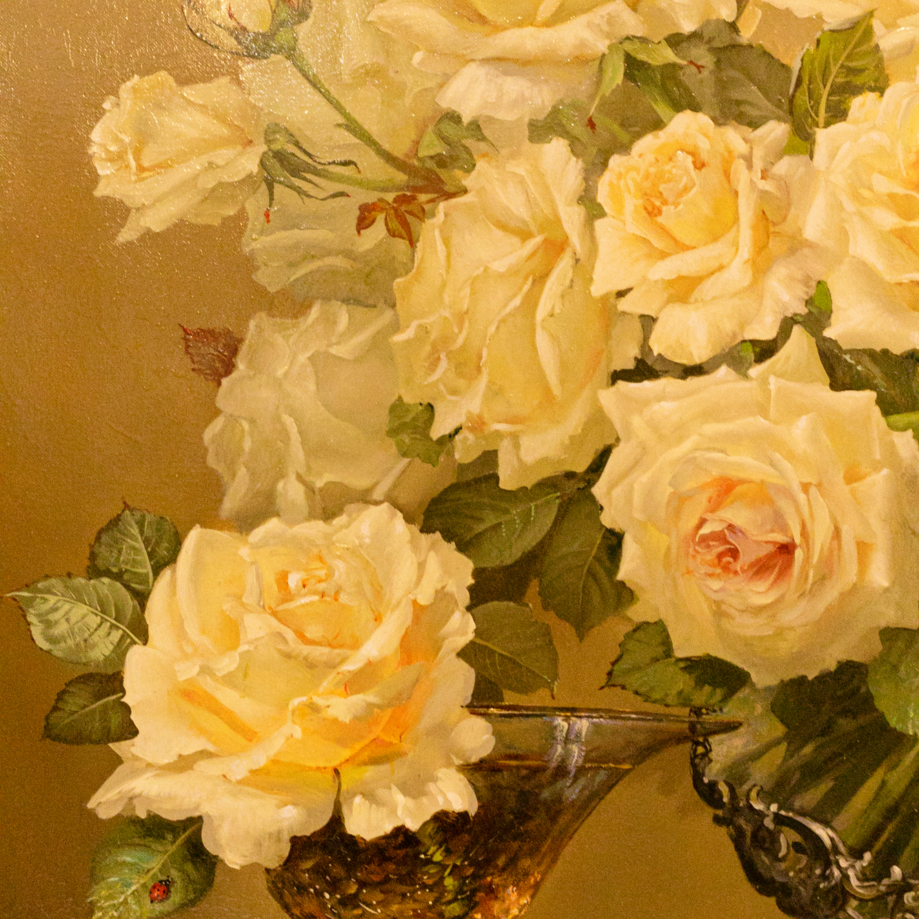 Живописное полотно «Свежий букет роз» — это безукоризненный образец классического масляного натюрморта, выполненного с филигранной точностью, в котором дыхание живой природы застыло в торжественном великолепии цветочной симфонии. Изящные розы сливочного оттенка, распустившиеся в тяжелом серебряном сосуде, каждая со своим неповторимым рельефом лепестков, окутаны мягким сиянием утреннего света. Их бархатистая свежесть подчеркнута присутствием кристально прозрачной вазы, обвитой тонкими стеблями, и невесомой бабочки, замершей на красной парче, словно в попытке соприкоснуться с этим торжественным великолепием. В глубокой тени, позади хрупкой гармонии цветов, угадывается фон из теплого золотистого свечения, делающий композицию почти сакральной. Пышная рама из золочёного дерева с богатым растительным орнаментом не только завершает образ, но и отсылает к дворцовой эстетике XIX века, создавая ощущение музейной значимости произведения.