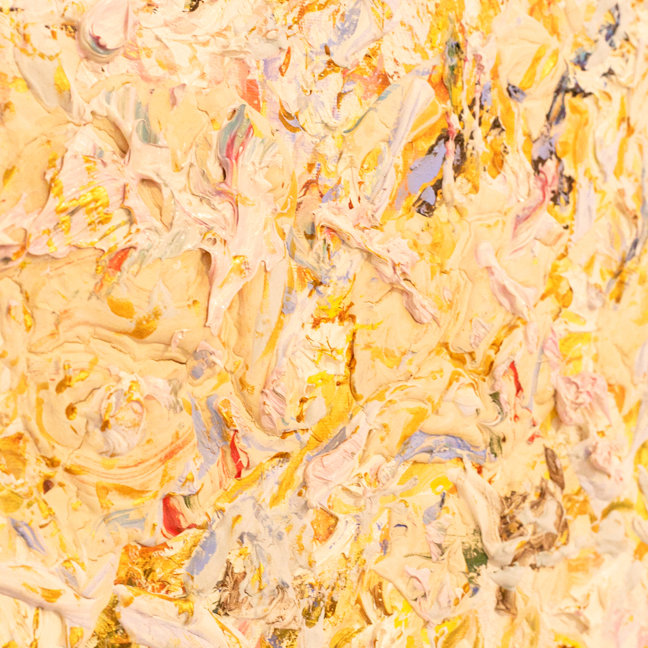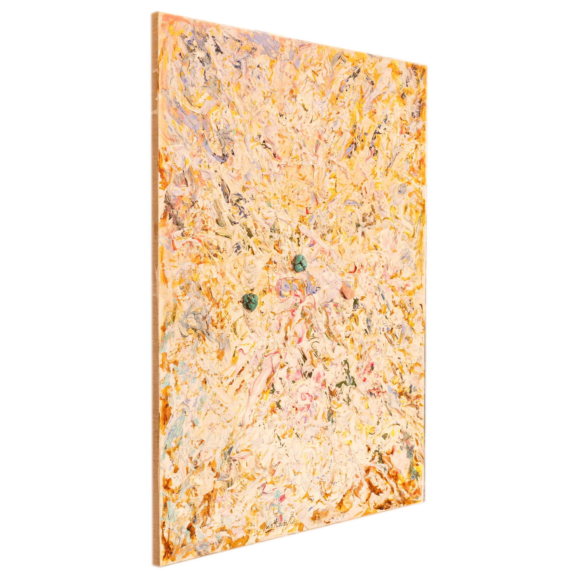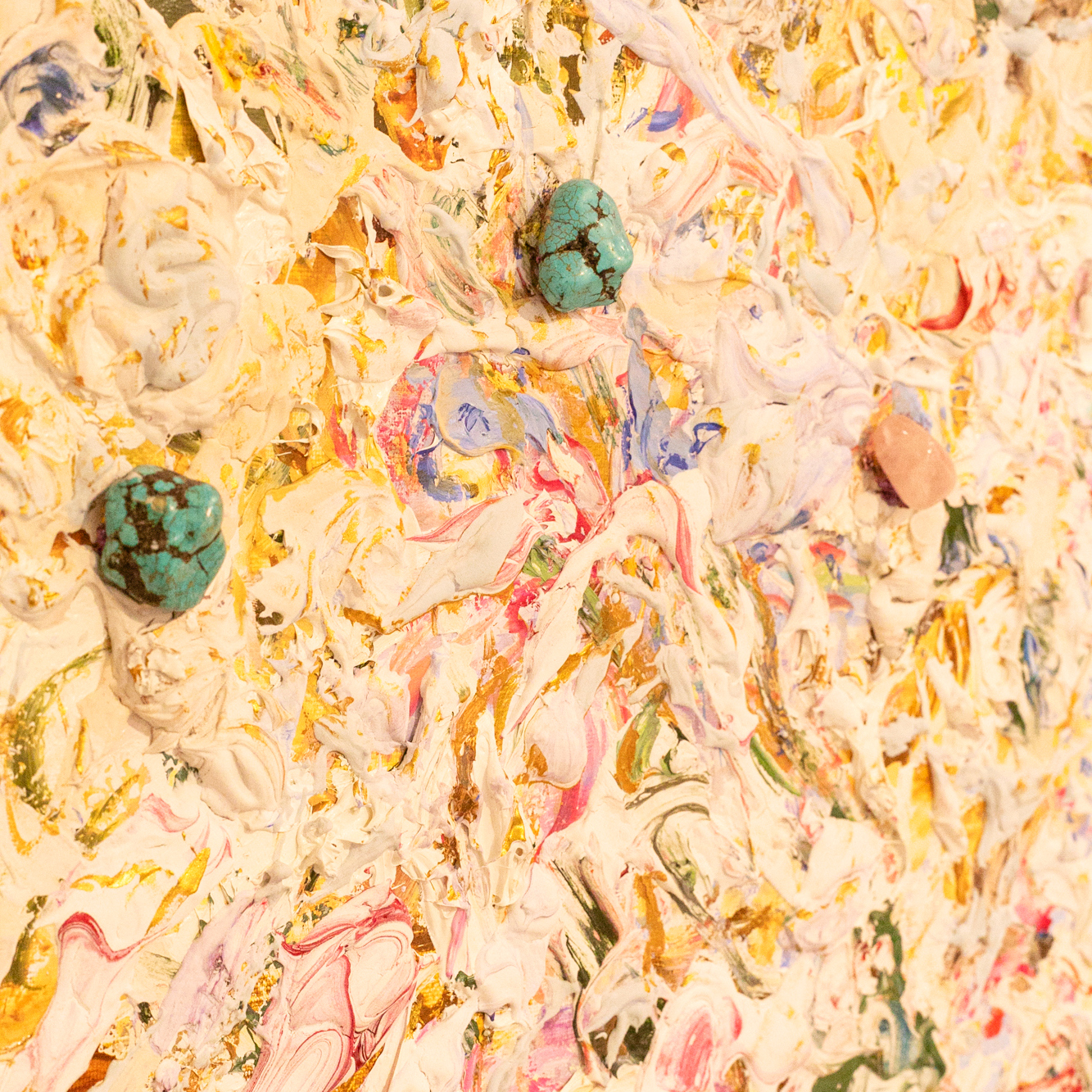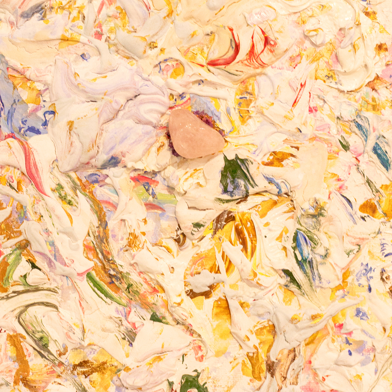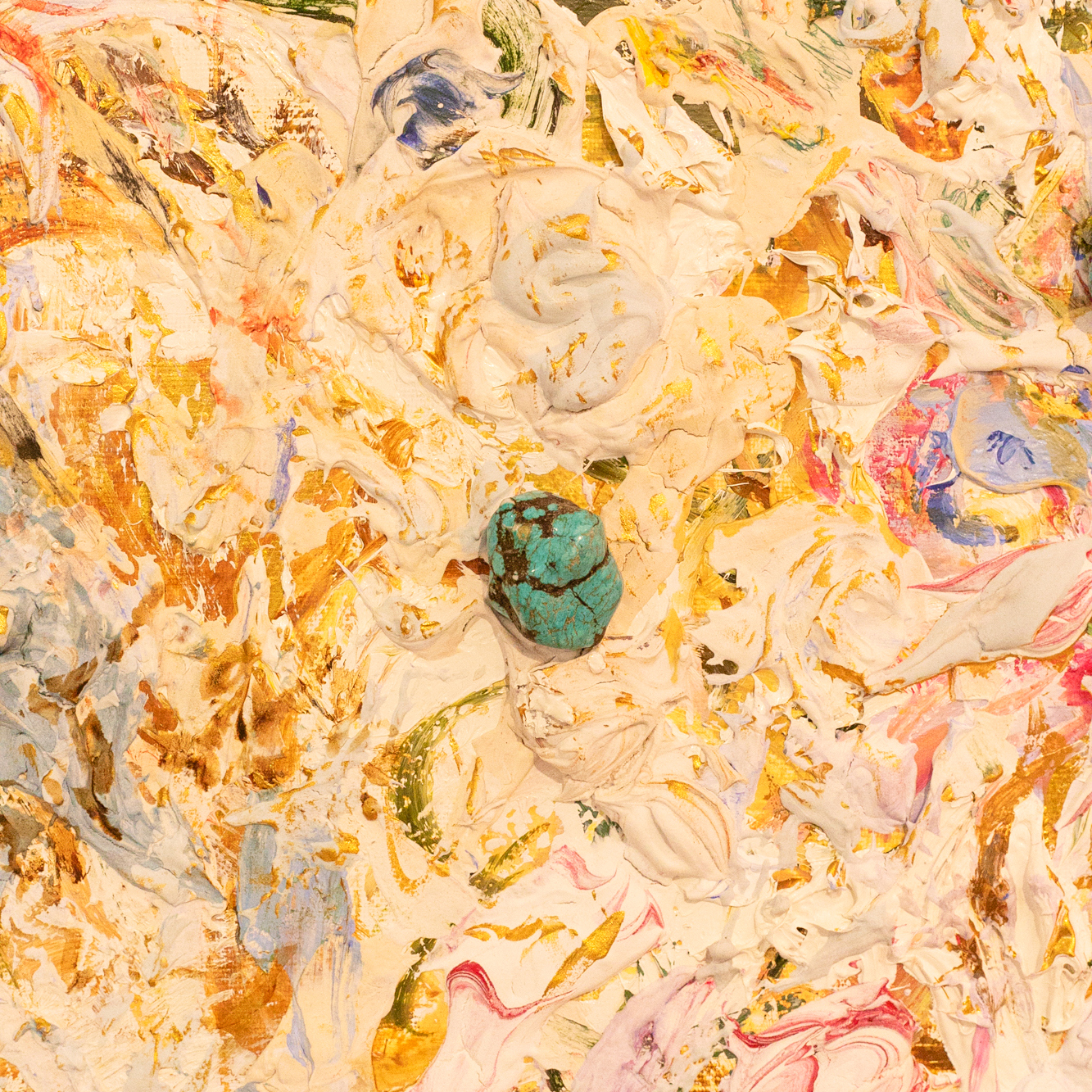 Авторская картина маслом "Треугольник любви" — многослойное полотно, вобравшее в себя сразу несколько измерений: цвет, объем, текстуру и символику. В центре — не геометрическая форма, а чувственная конструкция из натуральных камней: бирюзы и розового кварца. Вихрь пастозных мазков, рожденных палитрой охры, белил, золота и фиолетовых акцентов, охватывает эти точки, словно взрыв эмоций, застывший в моменте. Бирюза, несущая в себе покой и силу, вступает в диалог с кварцем — камнем, источающим мягкое свечение любви. Между ними — пространство, заполненное внутренним движением, в котором нежность и энергия не противопоставлены, а взаимно усиливаются. Поверхность холста будто дышит: мазки живут своей жизнью, преломляют свет, оставляя после себя впечатление живого движения, сияющего изнутри. Вплавленные минералы не только дополняют композицию, но и выводят её за пределы традиционной живописи, превращая картину в арт-объект — в том числе тактильный.