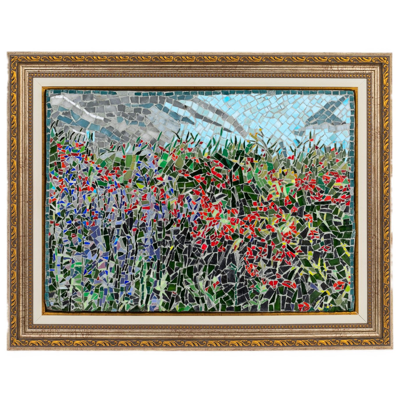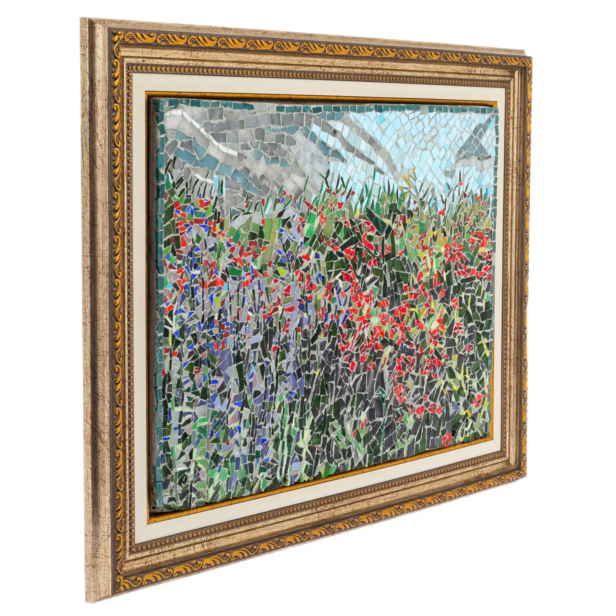 Авторская мозаичная картина «Степные цветы» — это тонкое художественное высказывание в жанре декоративного пейзажа, созданное вручную из десятков фрагментов смальты. В её основе — впечатляющий контраст: живое, почти чувственное дыхание природы и чёткая геометрия мозаичного рисунка. На переднем плане разворачивается буйство полевых трав и цветов — алых, васильковых, лиловых, — словно пойманных в танце ветра, а вдали силуэты гор и небес образуют спокойный фон, придающий композиции глубину. Каждый элемент вставлен вручную, с филигранной точностью подогнан к соседнему, сохраняя живость мазка и одновременно подчёркивая ритм произведения.