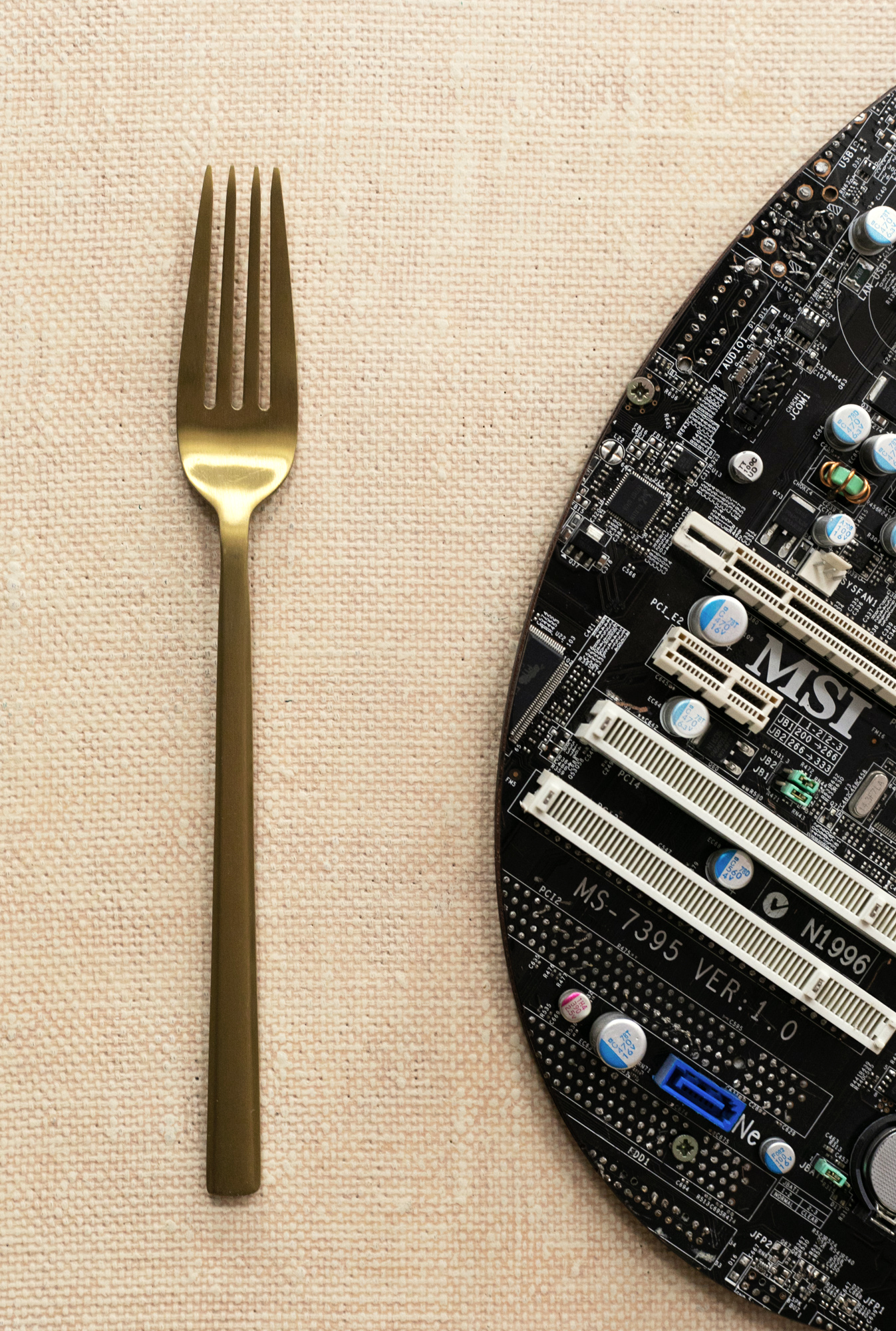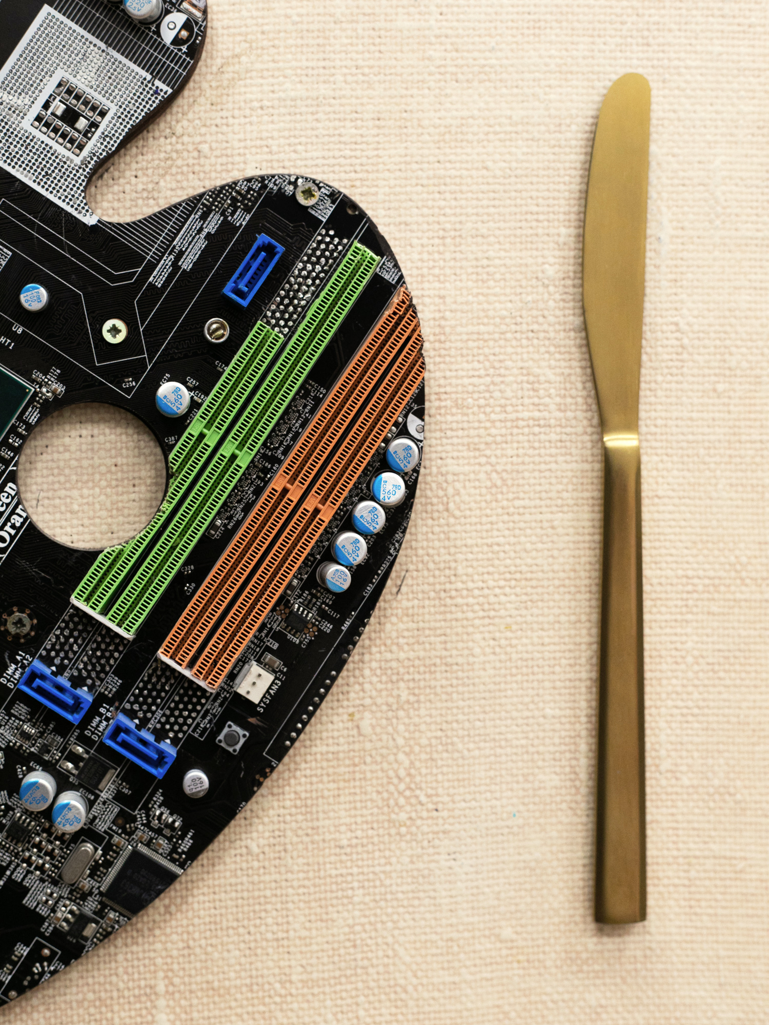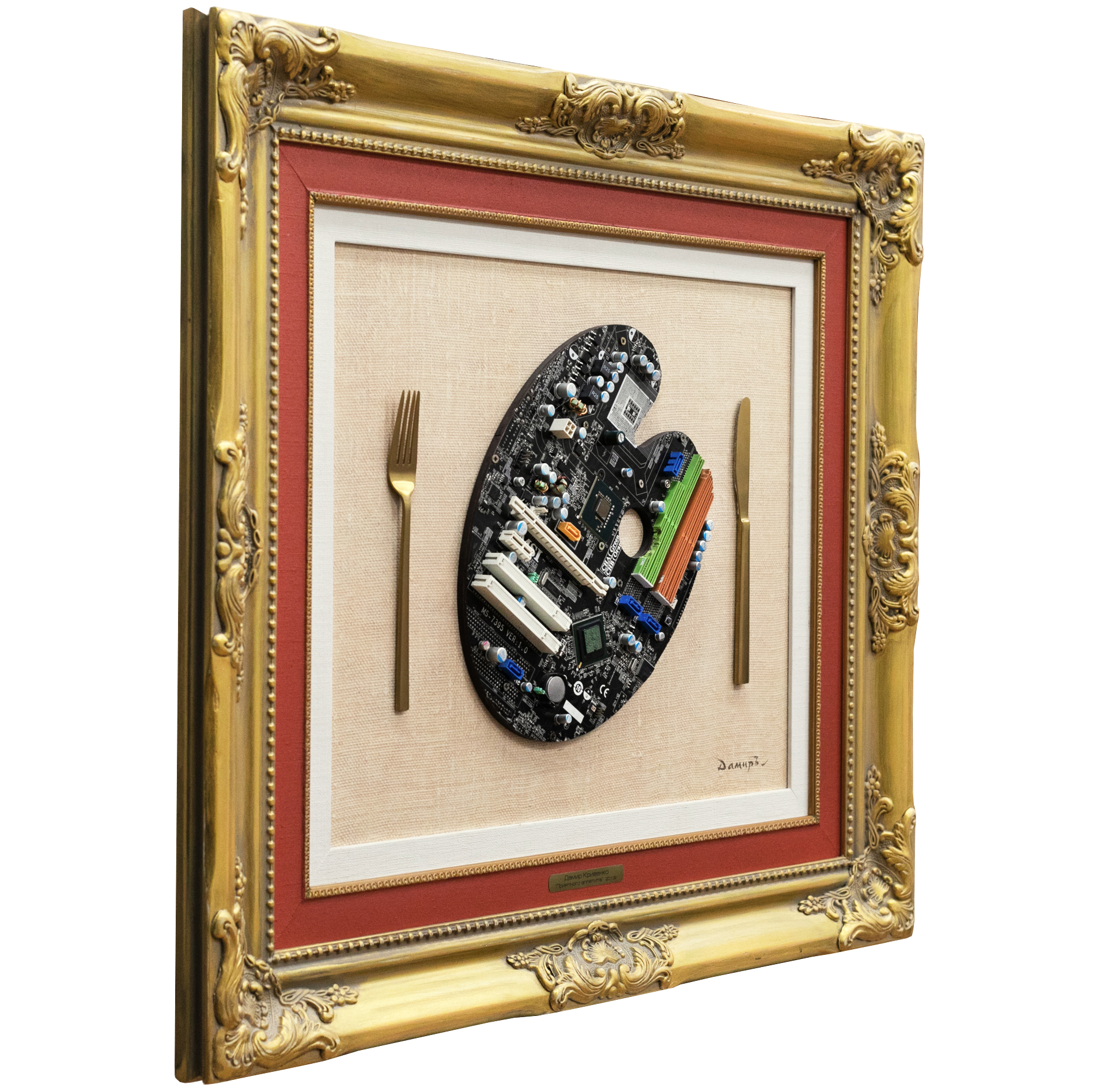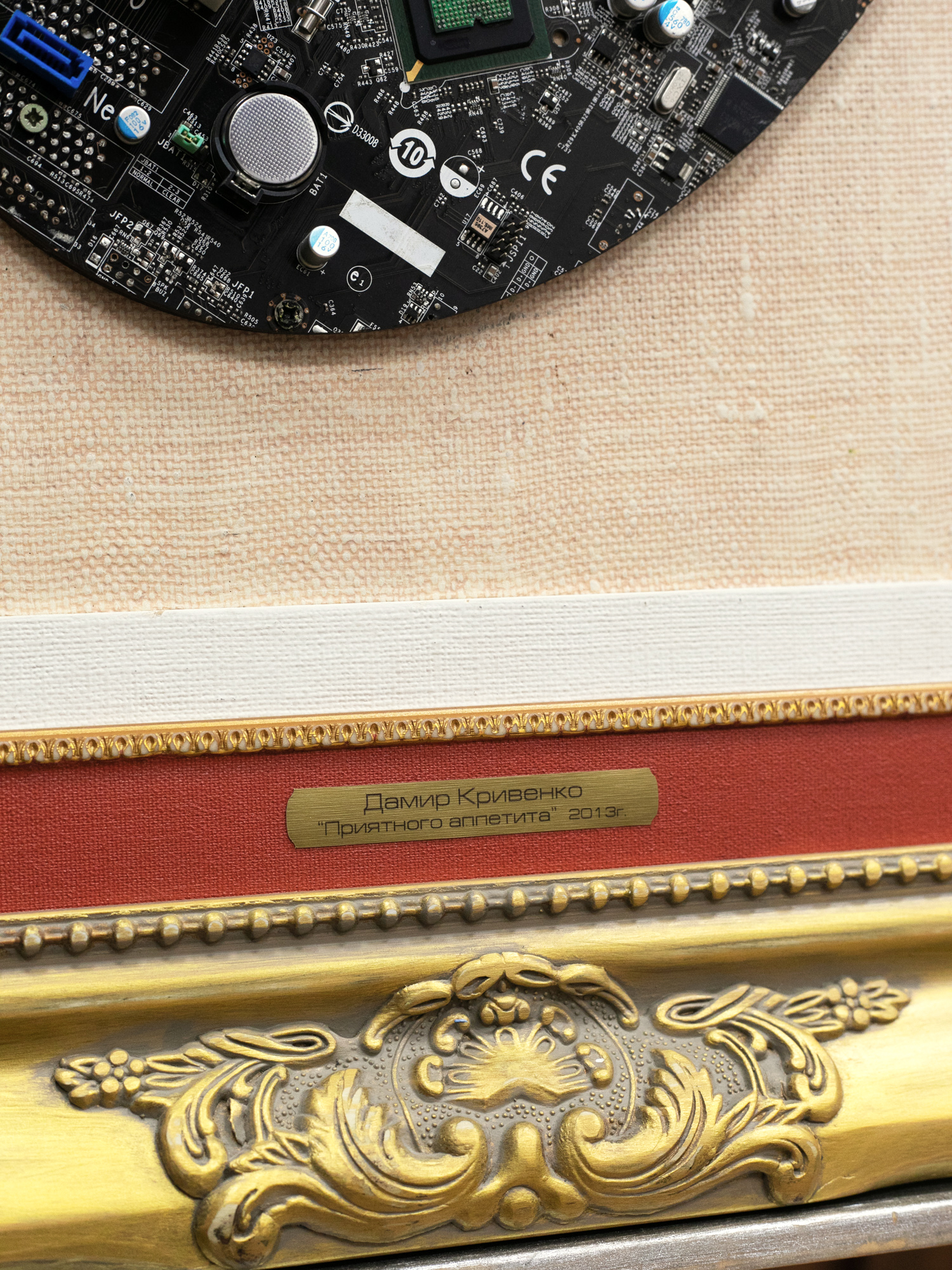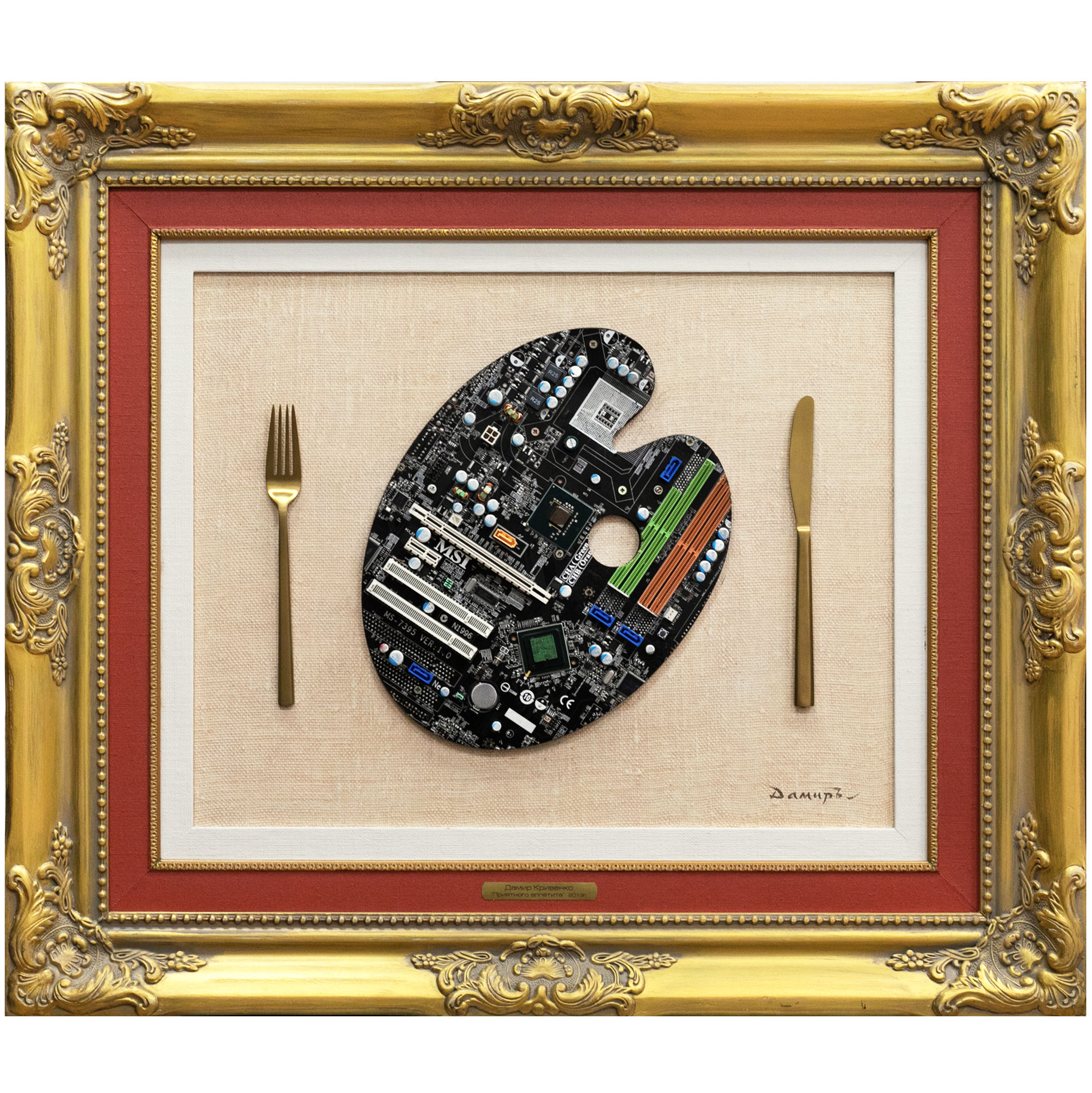 Материалы:холст, масло, компьютерные платы, столовые приборы.