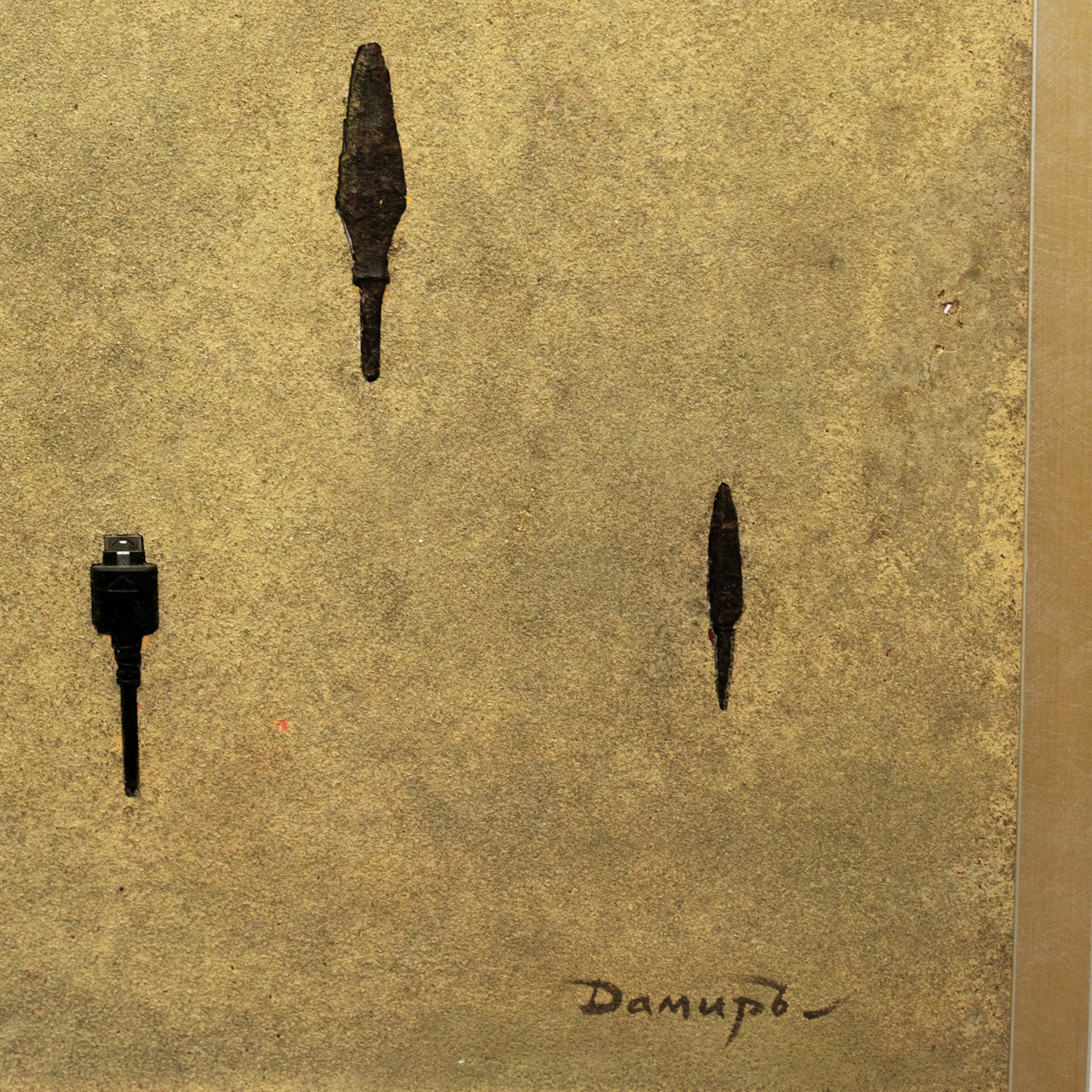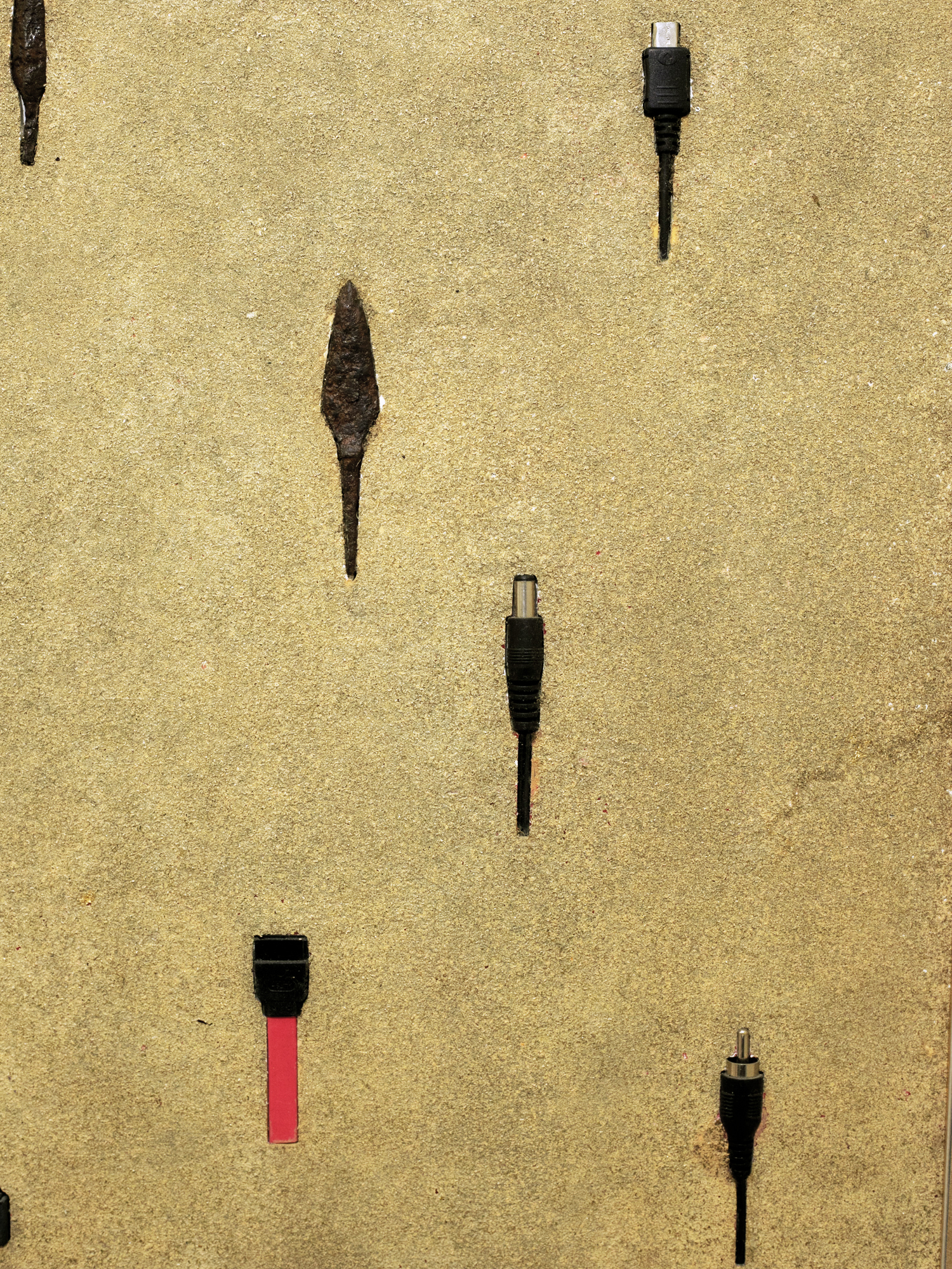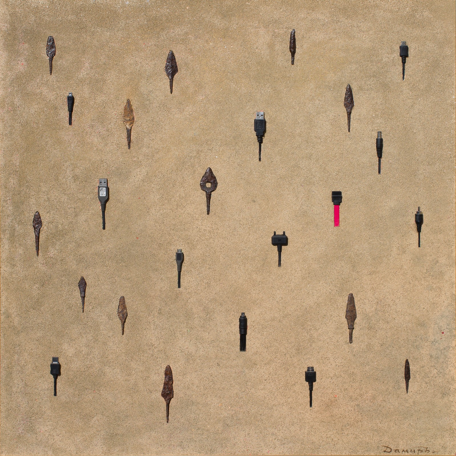 Материалы:пластик, масло, латунь, античные наконечники стрел, детали компьютерной техники.