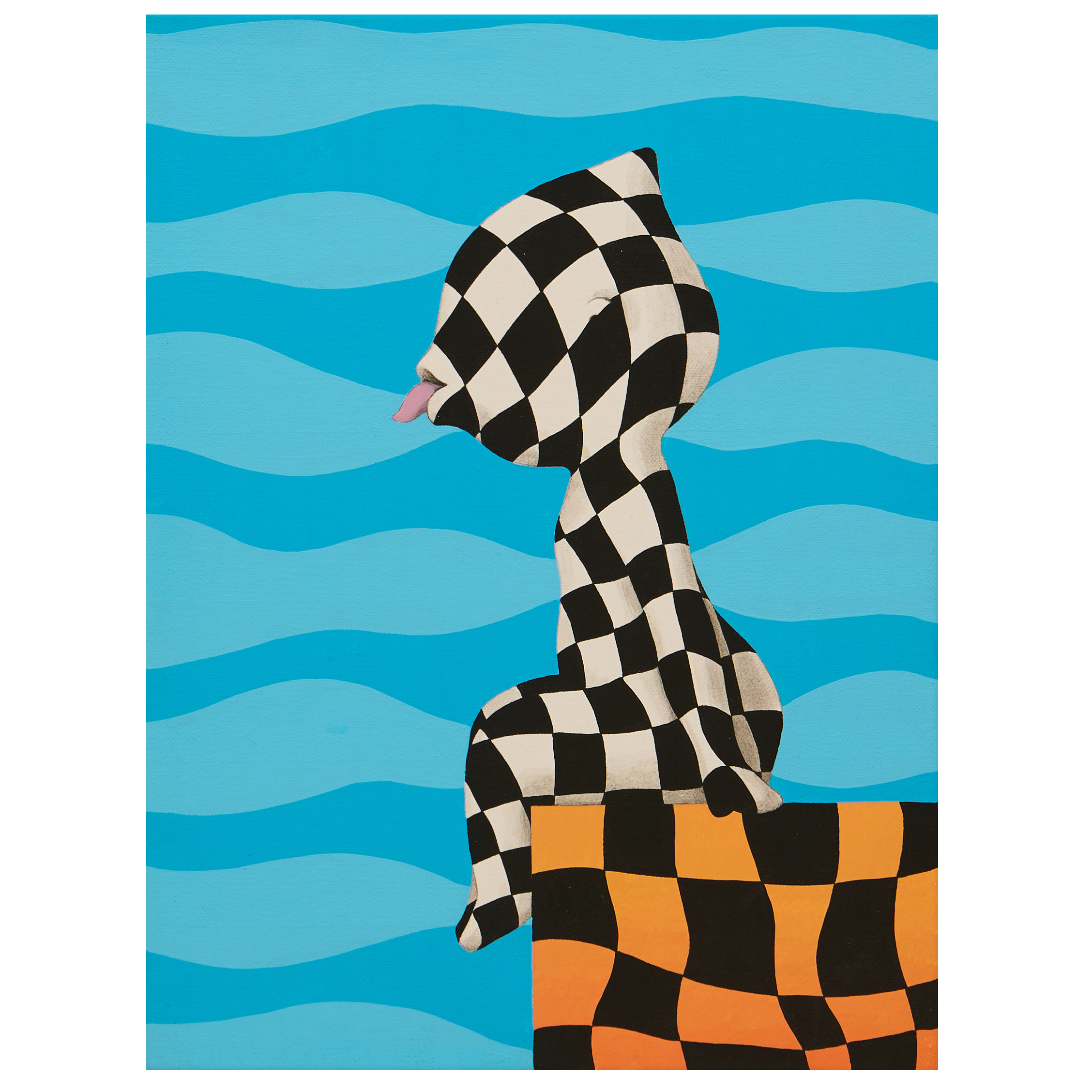 На фоне сине-бирюзовых волн, будто игра света на водной глади, сидит фигура Sinkini — персонаж, напоминающий шахматную фигуру, сбежавшую с доски в мир фантазии. Его тело покрыто черно-белыми клетками, но формы далеки от строгой геометрии — линии изогнуты, словно пространство само колышется. Этот шахматный герой — не игрок и не пешка, он наблюдатель в мире, где правила давно забыты, а реальность подчиняется лишь ритму цвета и импульсу воображения.