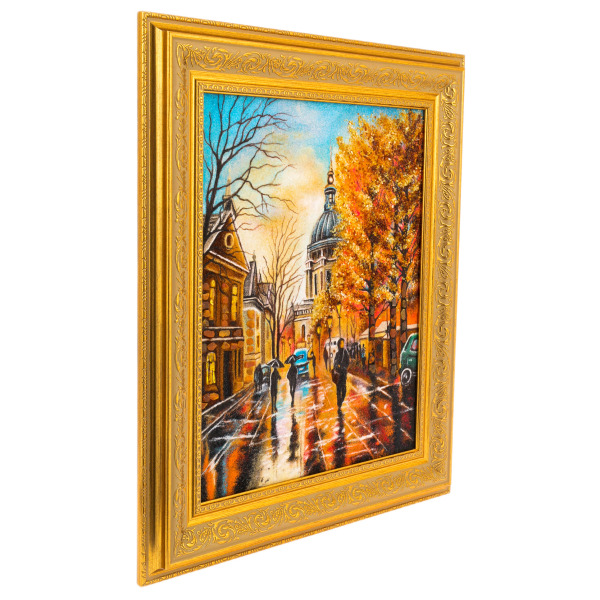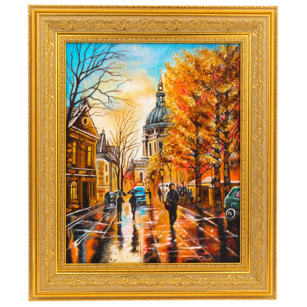 Картина «Мокрый Санкт-Петербург» — это поэтическое отражение городской осени, написанное не кистью, а янтарём. На полотне — тёплый, промокший от дождя вечер, когда отражения огней дрожат на блестящей мостовой, а силуэты прохожих растворяются в золотом мареве. На заднем плане — купол собора, будто всплывающий из тумана воспоминаний. Каждое дерево, каждый отблеск на плитке создан из натурального янтаря, благодаря чему композиция будто излучает внутренний свет. Картина обрамлена массивной резной рамой золотого цвета, которая подчёркивает барочную насыщенность и праздничную глубину цвета.