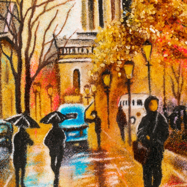 Янтарь — это не просто камень, а застывшее солнечное время, которому миллионы лет. В нём заключено дыхание древних лесов, энергия Солнца и магия природной сохранности. Он веками считался оберегом, способным сохранять душевное тепло и защищать от тревог. В художественном контексте янтарь даёт уникальный эффект: он живёт в свете, переливается, создаёт иллюзию объёма и движения. Особенно выразительно он раскрывается в пейзажах — как в этой работе, где каждая капля дождя, каждый отсвет фонаря оживают на глазах.