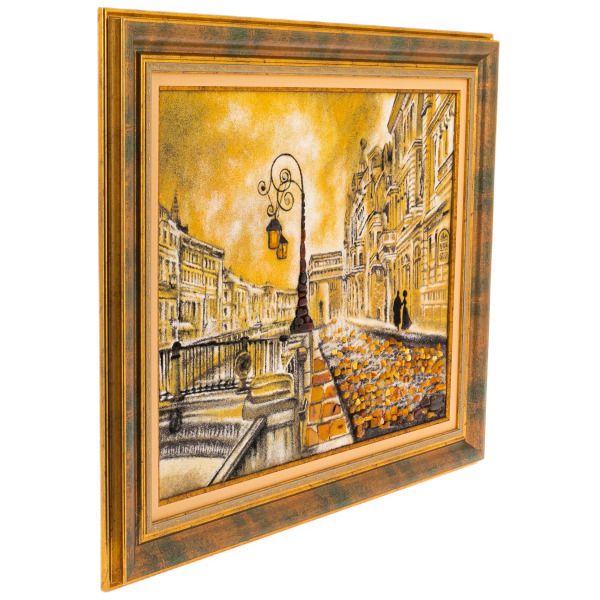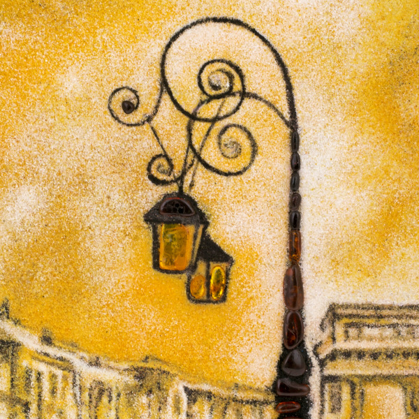 С первого взгляда захватывает магия полутонов, созданных тончайшими оттенками янтаря. Каждая деталь, от фонаря до таинственных силуэтов прогуливающейся пары, наполнена теплом природного камня. Янтарные мостовые будто переносят зрителя в вековую романтику Петербурга, где истории любви переплетаются с шумом Невы.