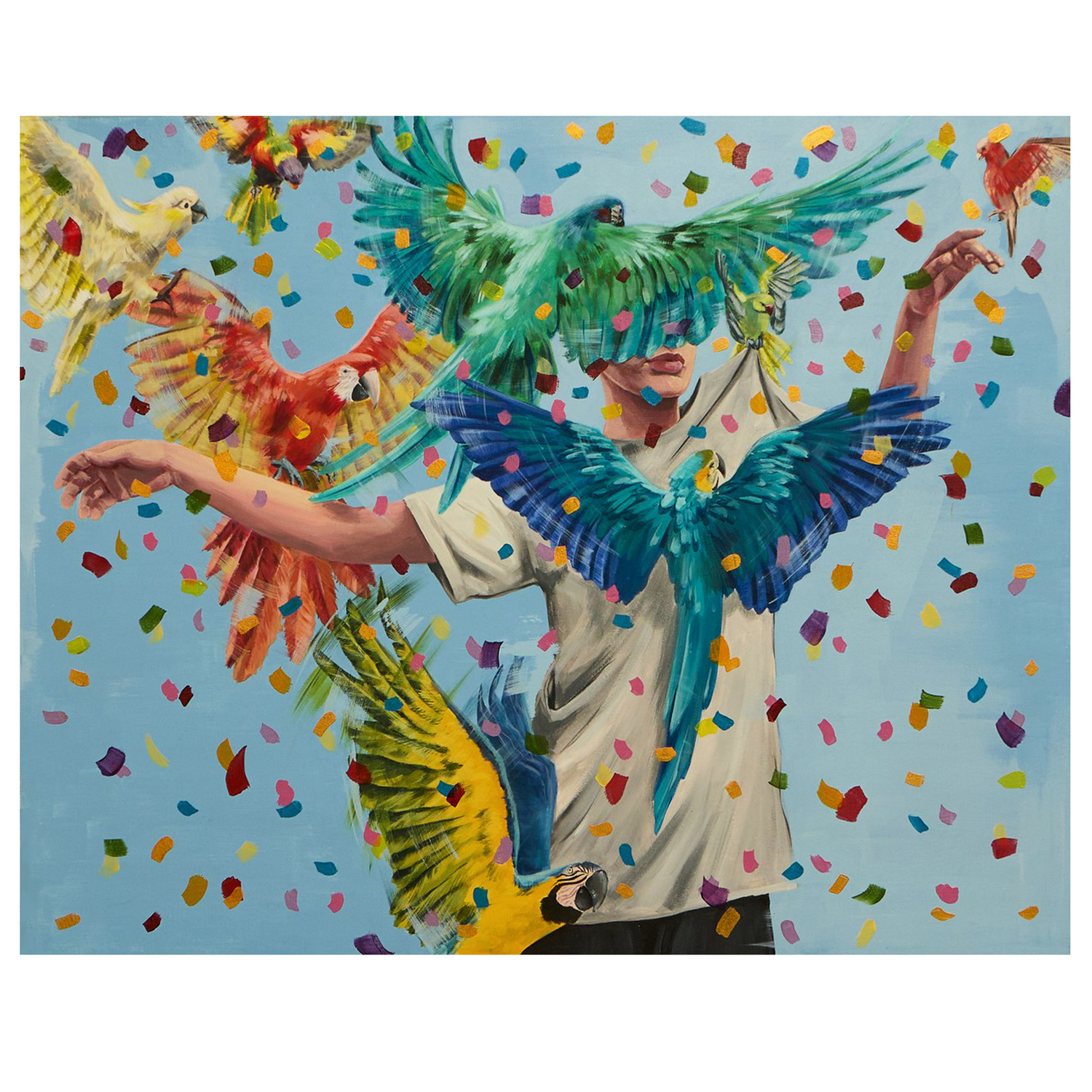 Картина “Конфетти” — яркое, экспрессивное полотно, в котором энергия движения, света и цвета сливается в едином порыве. Фигура подростка, застывшего с поднятыми руками, растворяется в вихре ярких попугаев и падающих бумажных фрагментов, словно находится в эпицентре стихийного торжества. Его лицо частично скрыто крыльями, будто радость, свобода или хаос заслоняют личность, превращая человека в элемент большой, ликующей композиции. Птицы — сине-жёлтые, алые, зелёные — не просто обитатели тропиков, а визуальные воплощения внутренней свободы, мечты и неконтролируемого полёта мысли.