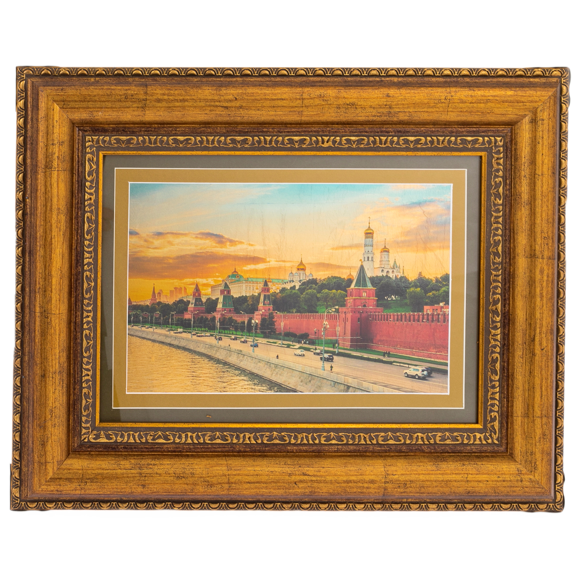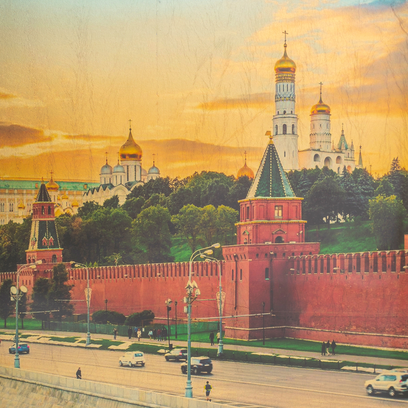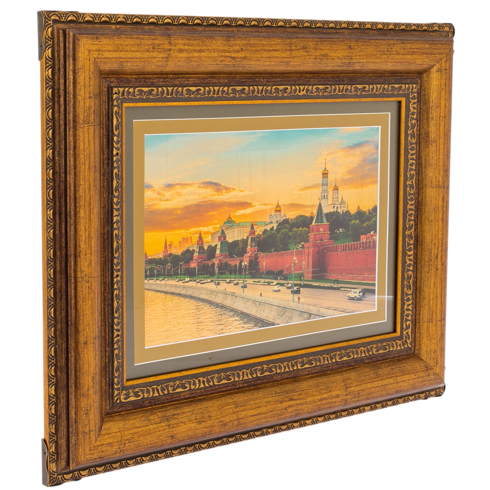 Картина "Кремлёвская набережная" на сусальном золоте — это произведение, которое воссоздаёт легендарный образ Москвы в момент величественного заката. Вид с реки на Кремль, погружённый в тёплые золотые отблески заходящего солнца, словно приглашает окунуться в атмосферу величия и славы российской столицы.