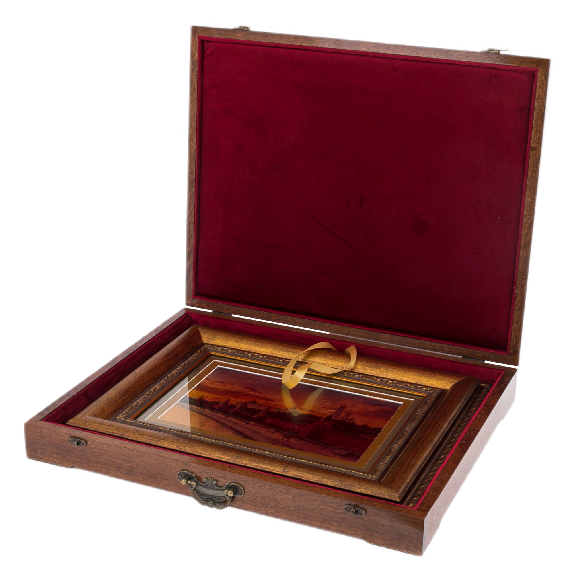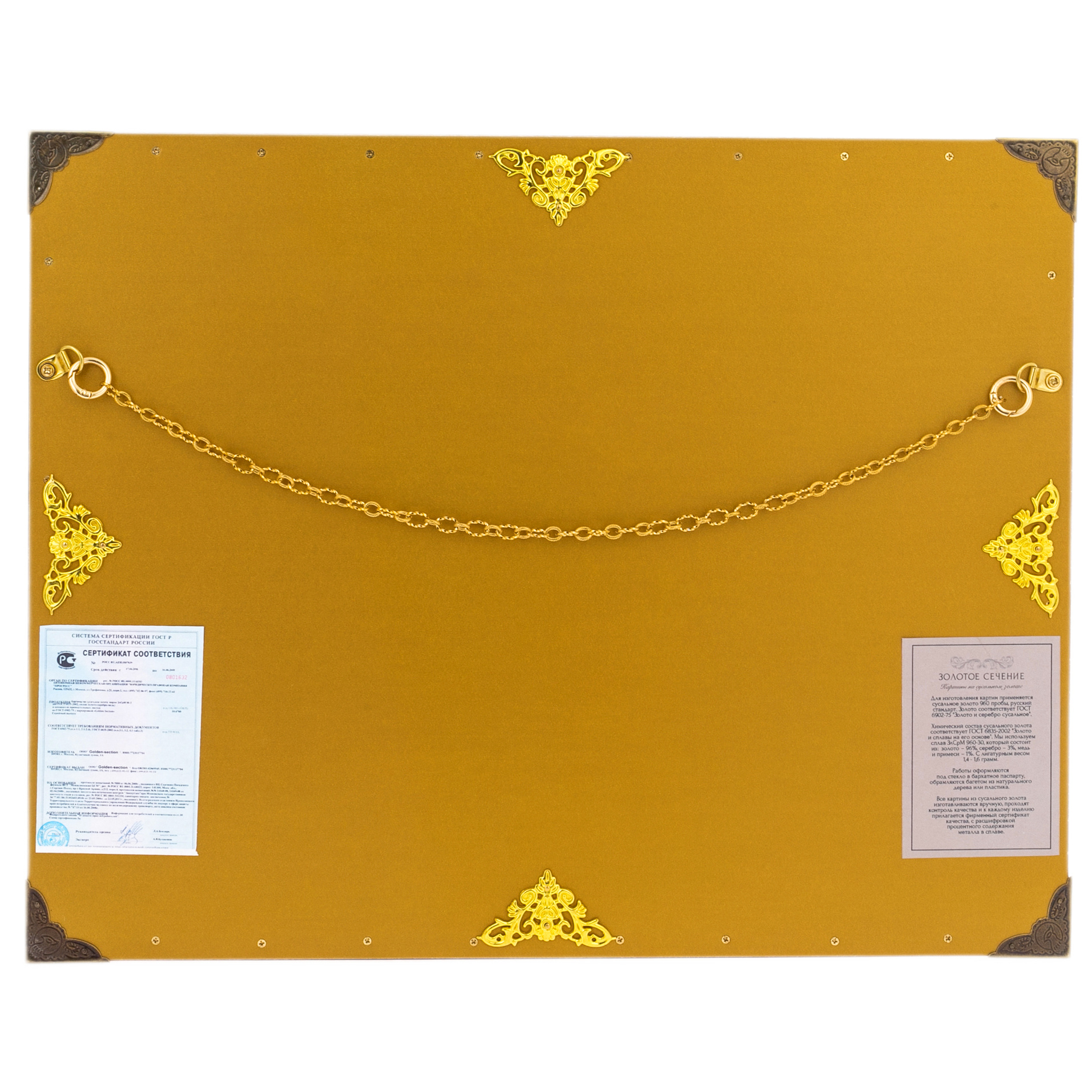 Особую ценность этой картине придаёт техника нанесения изображения на сусальное золото — древнее искусство, сохранившееся на протяжении веков и использующееся лишь для создания поистине уникальных шедевров. Каждый элемент композиции — от башен Кремля до спокойных вод Москвы-реки — подчёркивает исключительное мастерство художников, способных запечатлеть не только внешнюю красоту, но и душу города.