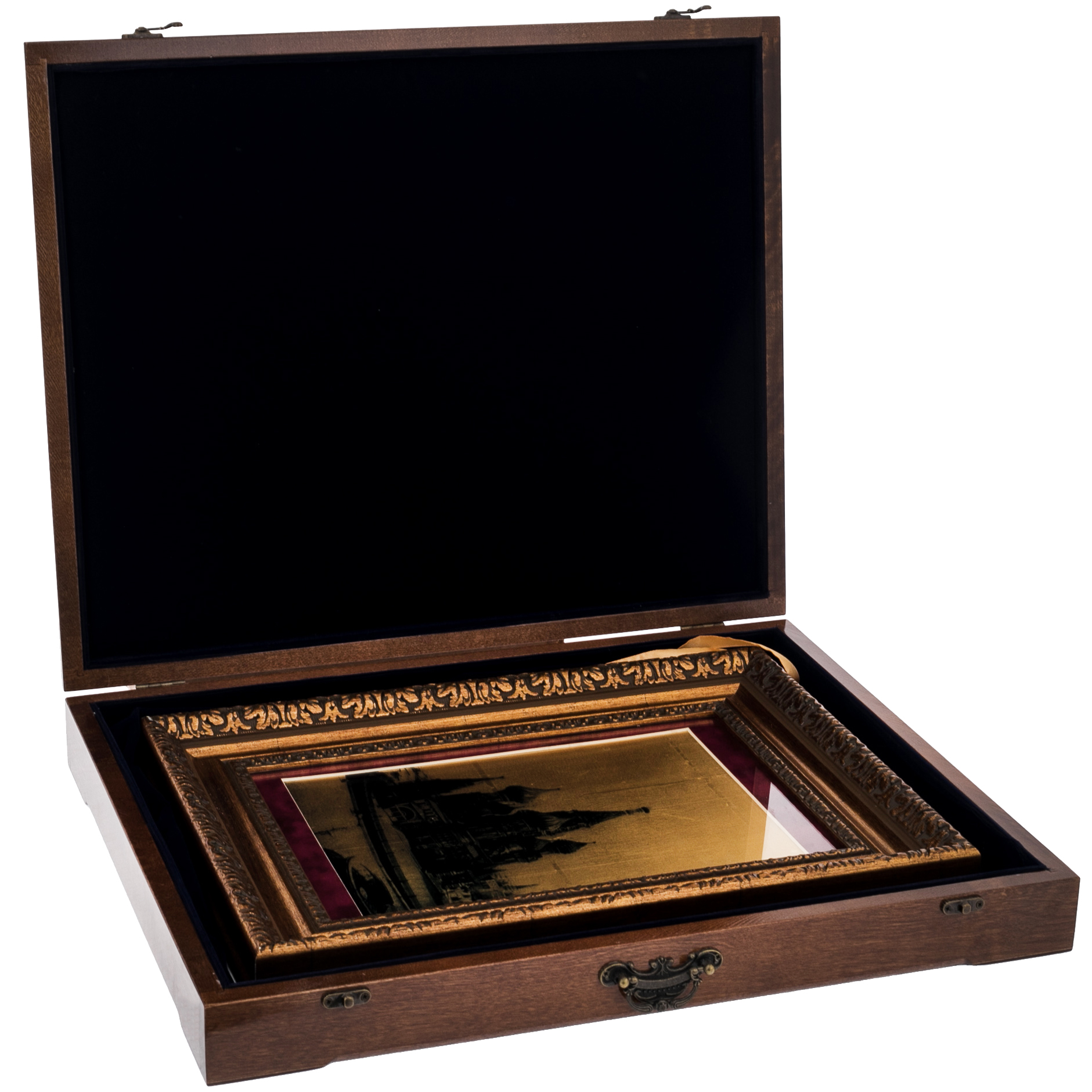 Материалы:золото 960 пробы, бархатное паспарту, багет - пластик, стекло.