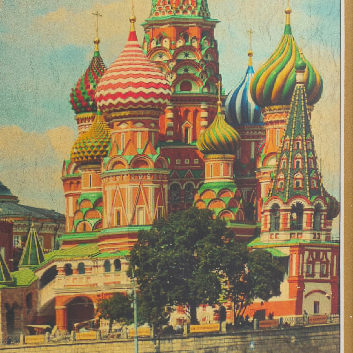 На картине Васильевский спуск изображен в контексте его архитектурного окружения, где каждый элемент передает атмосферу величия и торжественности. Золотой фон добавляет изображению особую выразительность, подчеркивая значимость места и его культурное наследие. Детали, выполненные с исключительной точностью, позволяют ощутить дух времени и величие Москвы, словно стоящей на пересечении эпох и судеб.