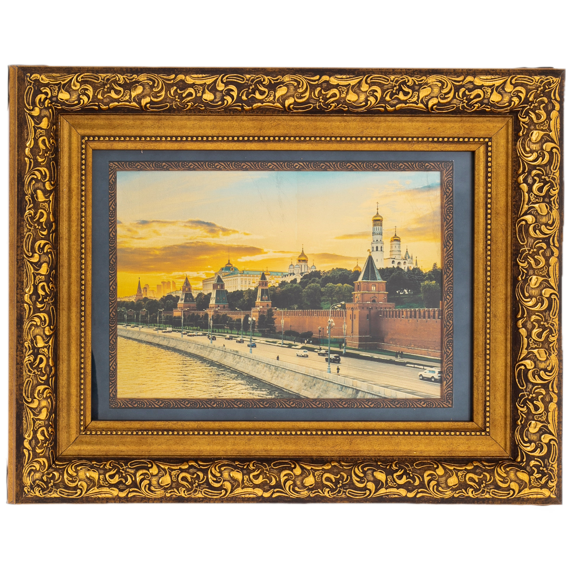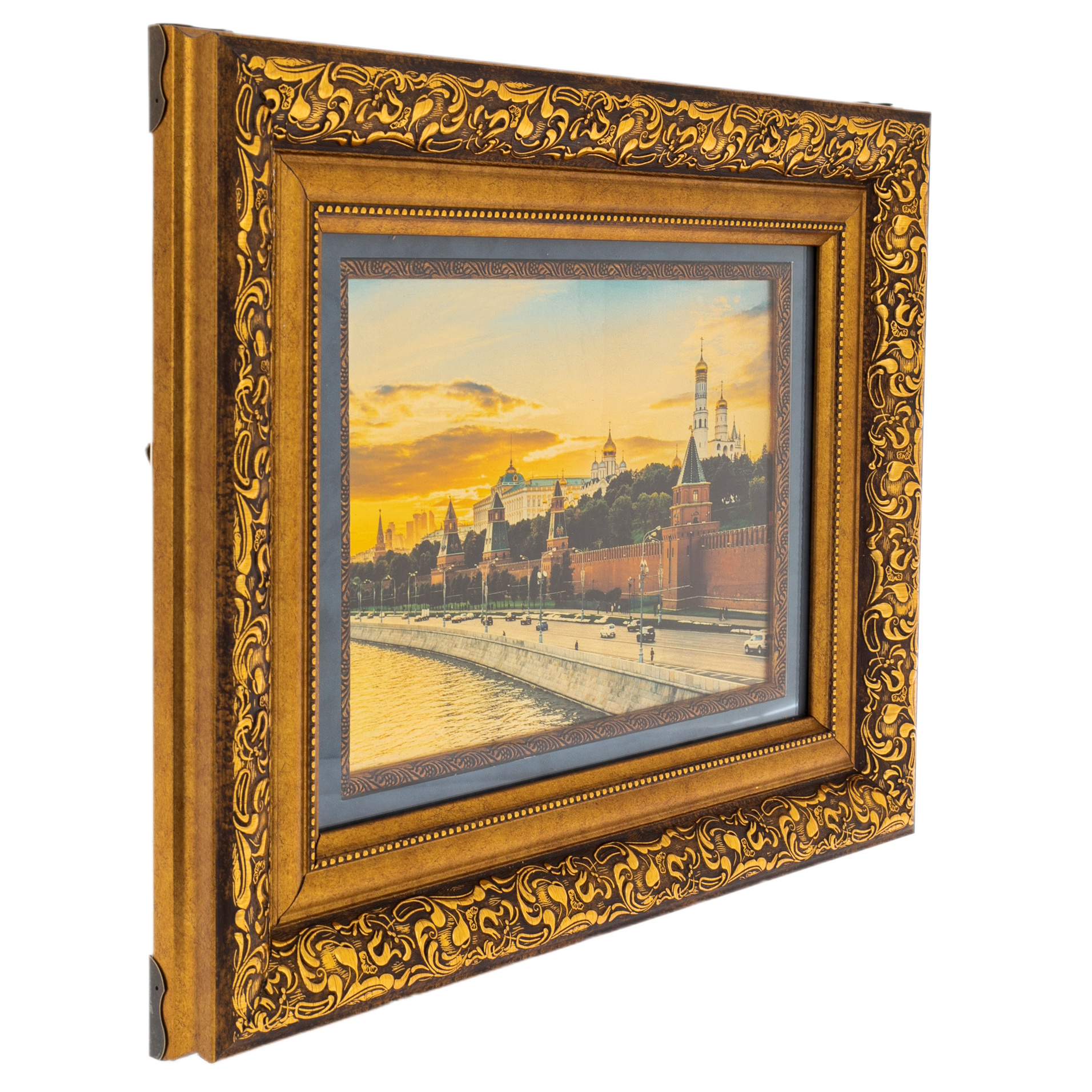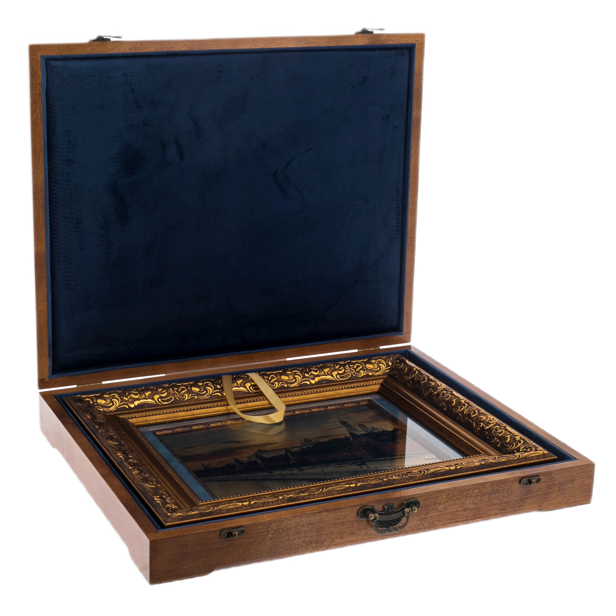 Материалы: сусальное золото 996-й пробы (ЗлСрМ 96-3 по ГОСТ 6835-2002), бархатное паспарту — цвет на ваш выбор, багет — пластик, стекло.