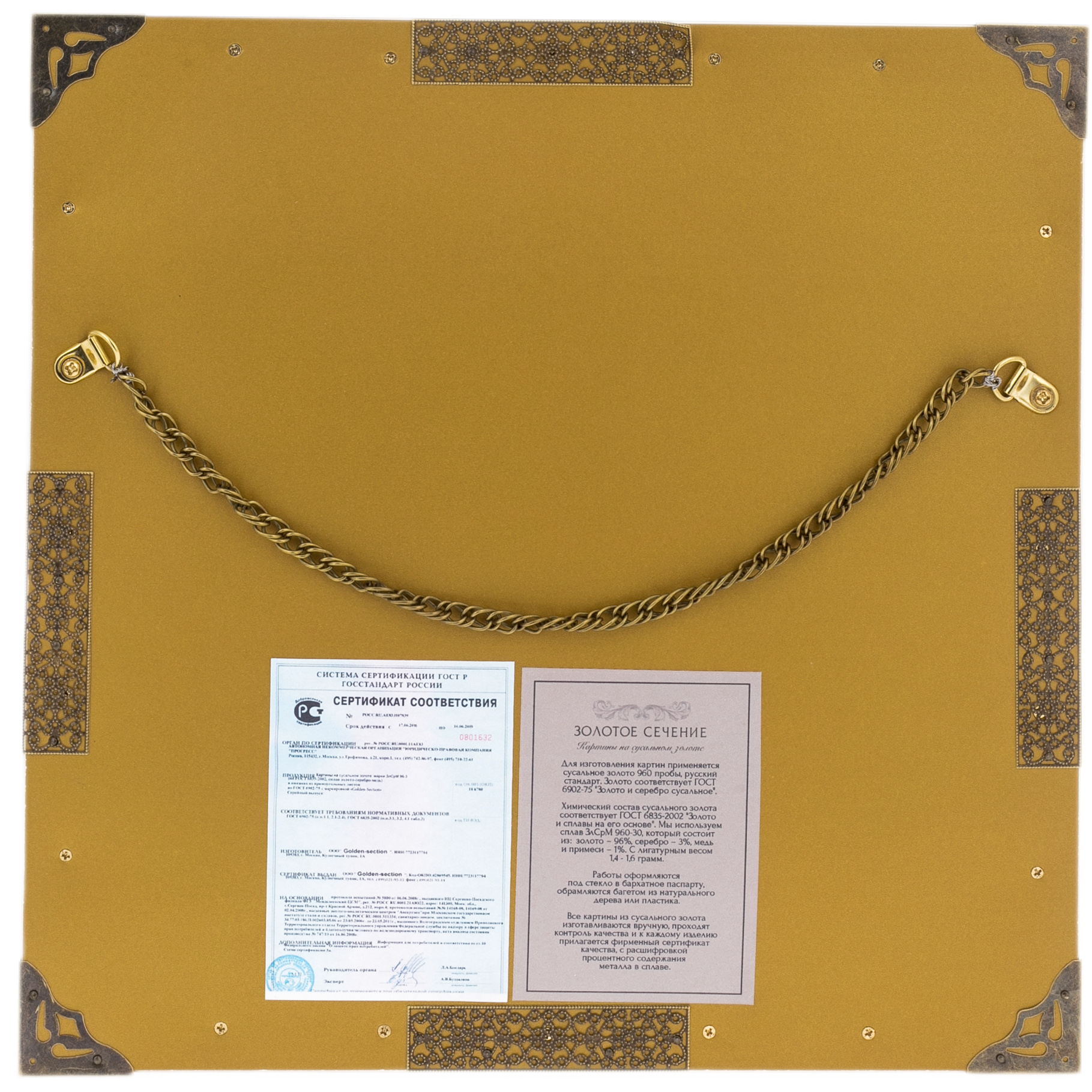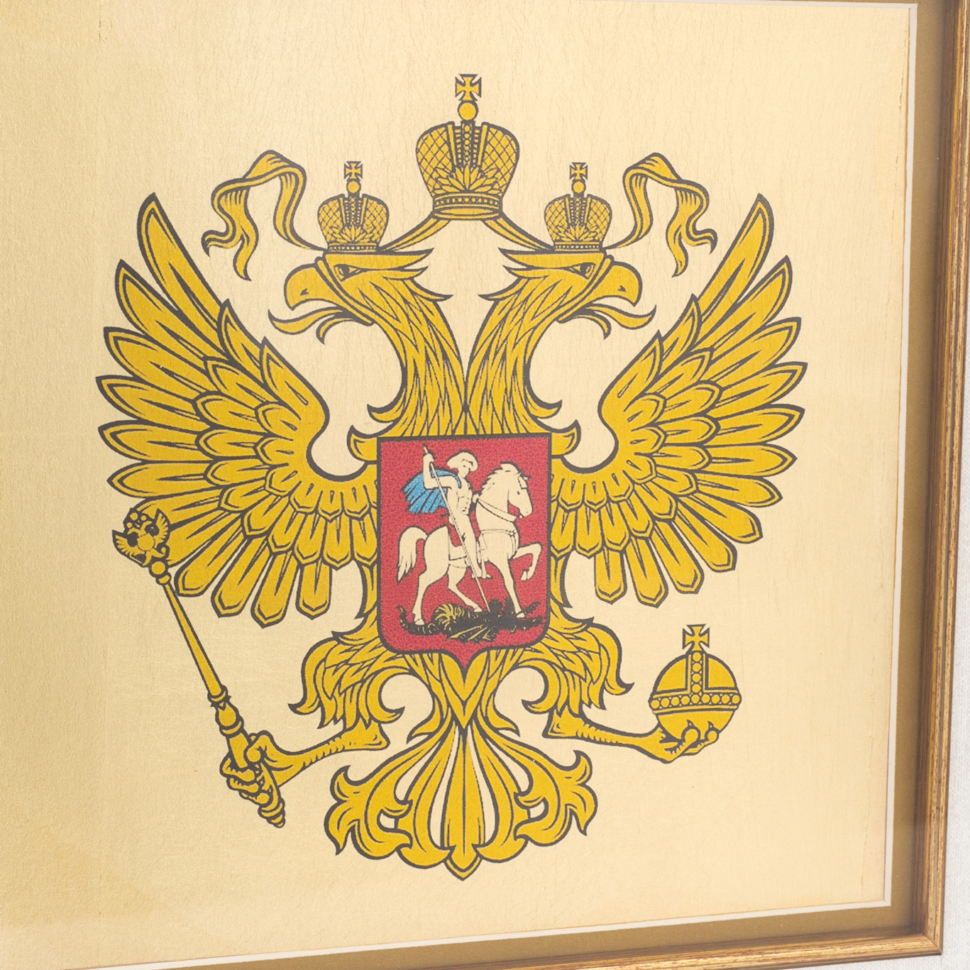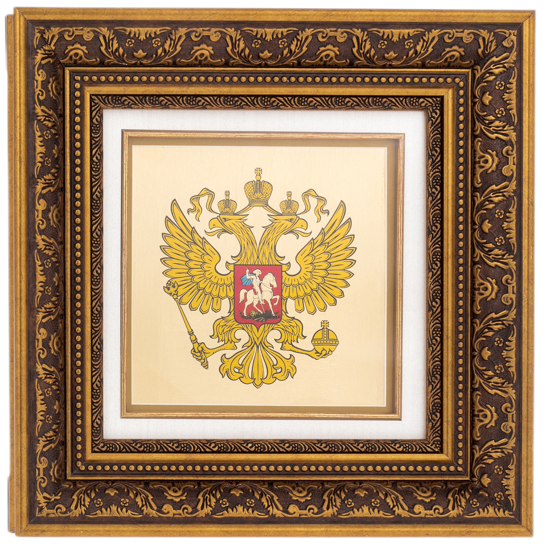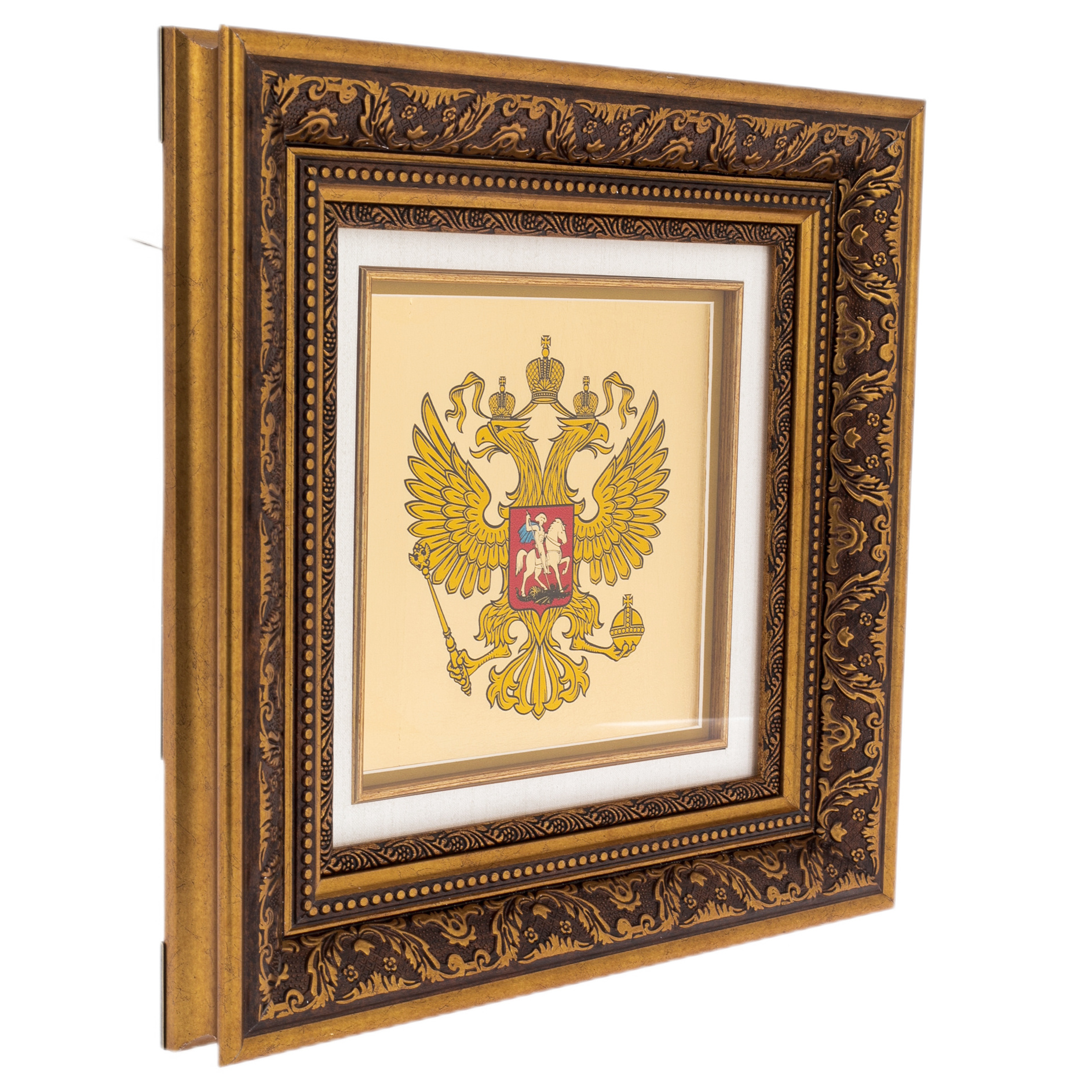 Обрамленный в роскошную резную раму, словно в царскую мантию, этот символ приобретает особый вес — вес преемственности, вес наследия, которое достойно самых почетных залов, кабинетов и резиденций. Глубина оттенков, филигранность деталей, теплое сияние золота — все здесь говорит о величии, неподвластном времени. Это не просто картина, а манифест силы, уверенности и торжества государственной идеи.