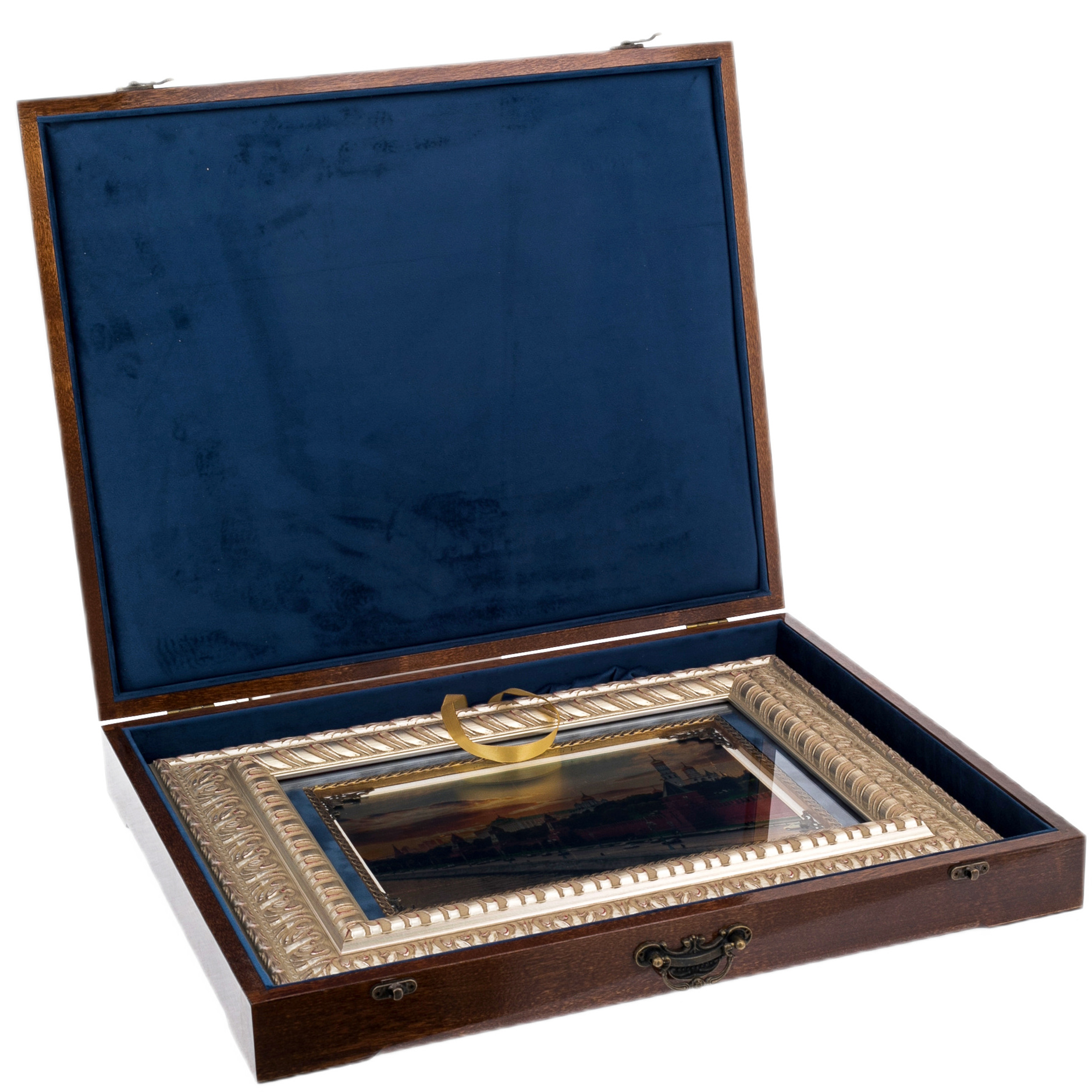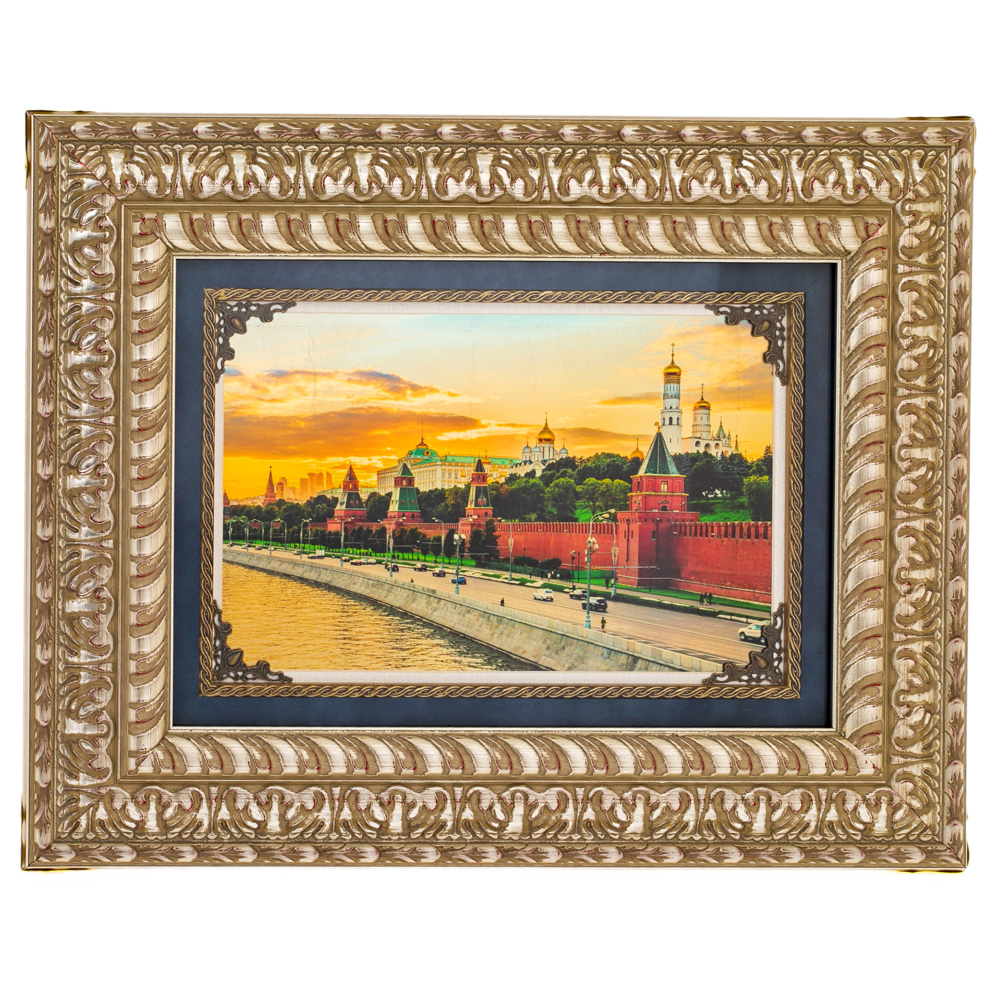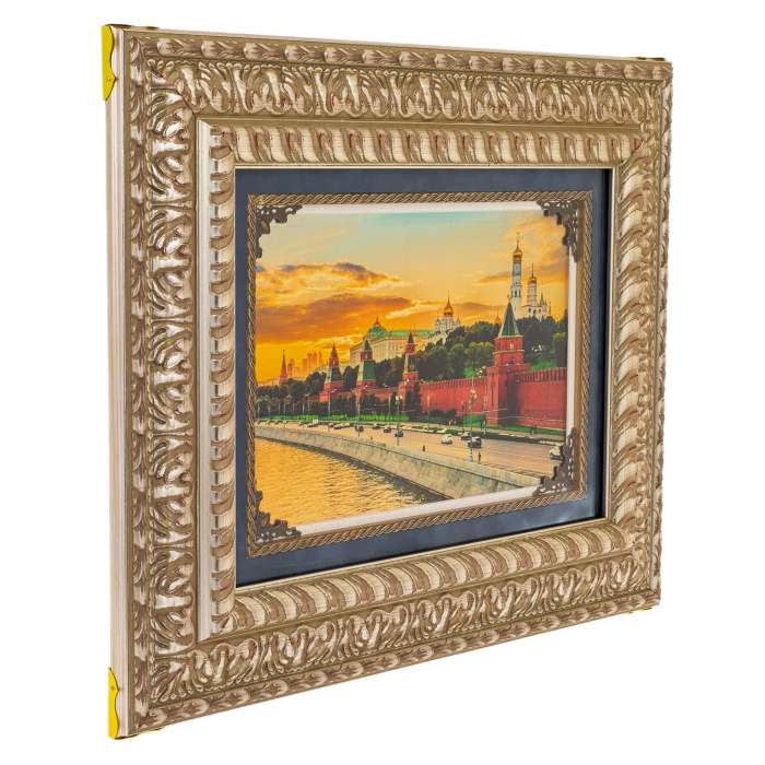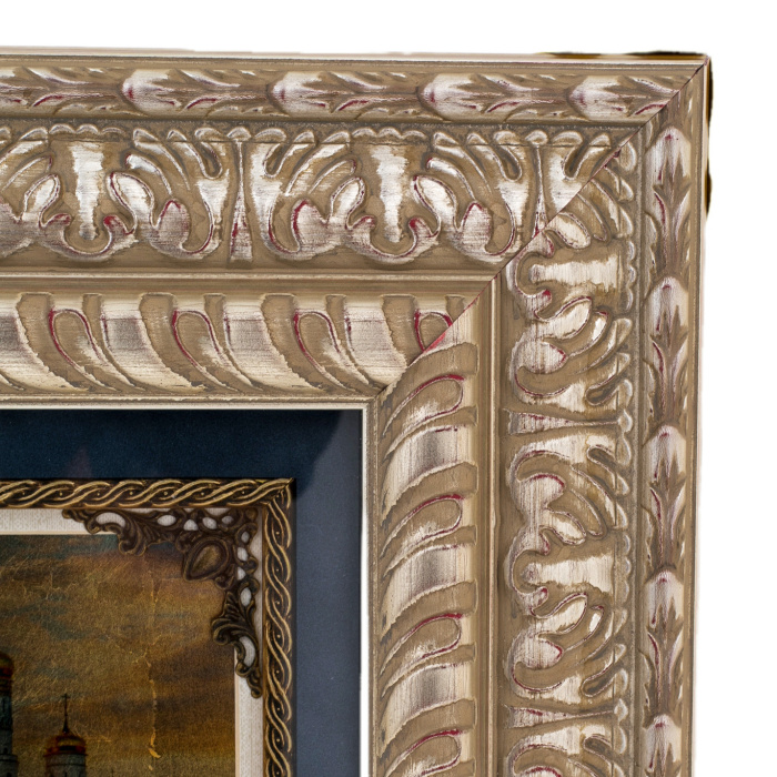Произведение заключено в массивный резной багет, струящийся сложным орнаментальным рельефом. Тёплая, насыщенная фактура рамы создаёт ощущение предмета, прошедшего путь через поколения, но сохранившего свежую благородную патину. Линии резьбы, обработанные вручную, образуют единый орнаментальный поток, мягко обрамляющий золотую поверхность изображения. Внутренний контур подчёркнут тёмным паспарту, усиливающим визуальную глубину и позволяющим взгляду плавно перейти от золота к окружающему пространству, словно произведение открывает окно на вечернюю Москву.