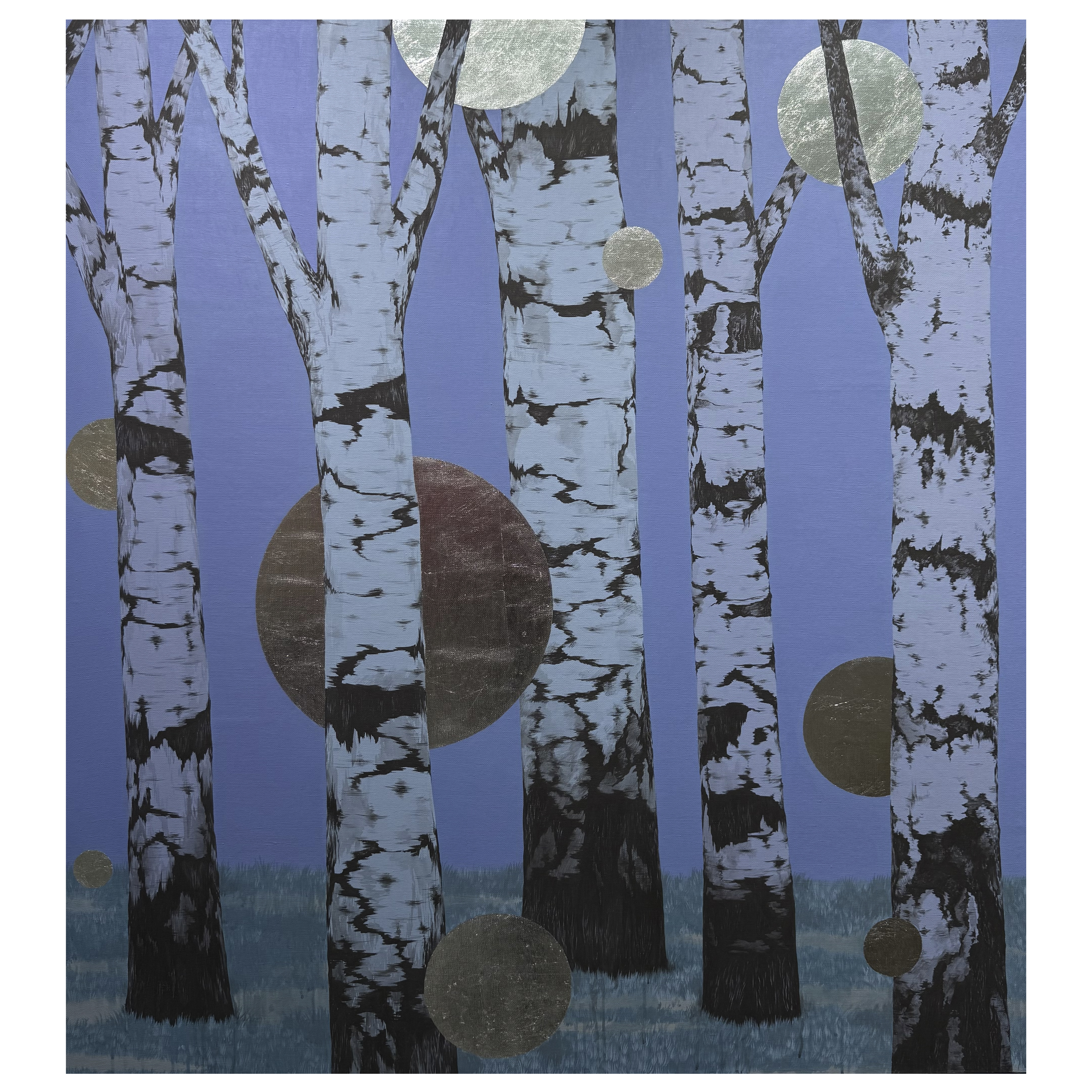 Картина “Умиротворение” — это визуальная медитация, воплощённая в синеватых полутонах и хрупкой графике берёзовых стволов. Перед зрителем раскрывается лес, застывший в безмолвии: высокие белёсые деревья, вытянутые вверх в вечном стремлении к свету, кажутся приостановленными во времени. На фоне сумеречного неба, плавно переходящего от лилово-синего к глубокому индиго, серебристые и бронзовые круги мерцают подобно лунам или воспоминаниям — эфемерным, но наполненным внутренним светом. Эти геометрические элементы, вкраплённые в органический рисунок, создают ощущение снов, в которых природа и воображение сливаются в едином ритме покоя.