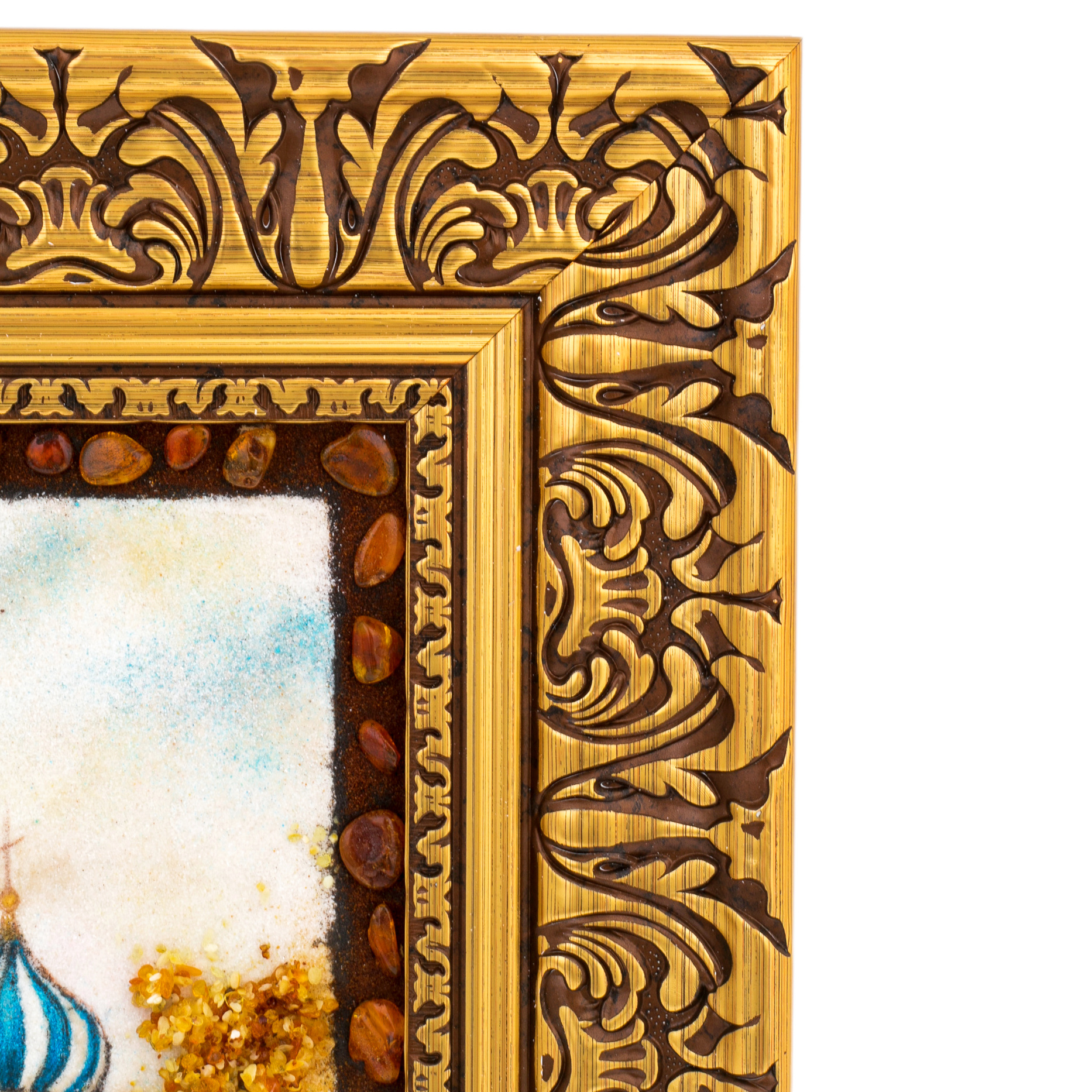 Картина из янтаря «Москва. Собор Василия Блаженного» — это произведение, в котором энергия древности соединяется с архитектурной лирикой столицы. Сюжет, запечатлевший один из самых узнаваемых символов России, выполнен в уникальной технике, объединяющей янтарную мозаичность и пастельную живопись. Купола собора, словно купели света, парят на фоне неба, подсвеченного розовым закатом, а осенние деревья, созданные из крошки и пластин натурального янтаря, придают изображению объём и живую материальность. Каждая гранула, вплавленная в пейзаж, играет на свету, словно храня тепло Балтийского побережья.
