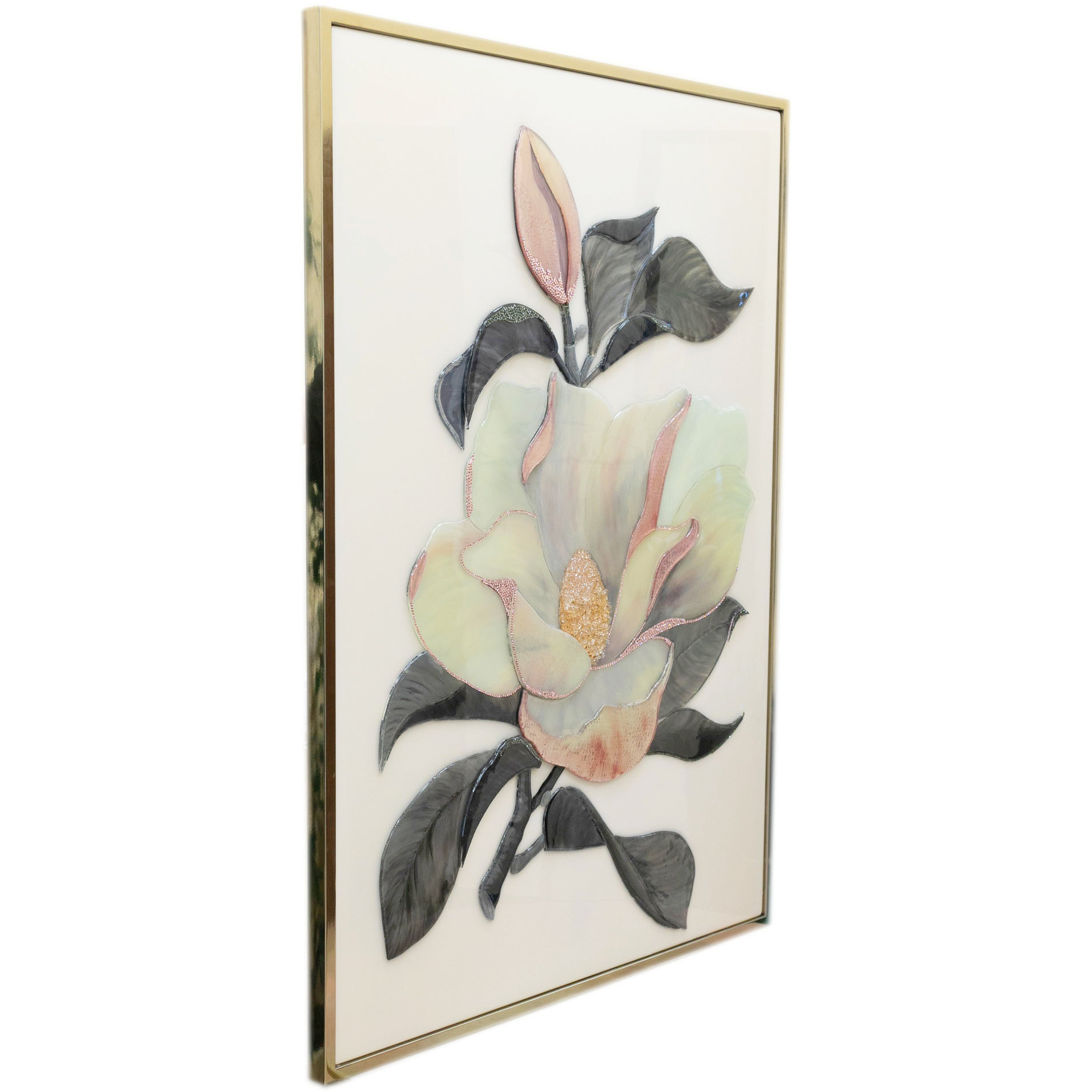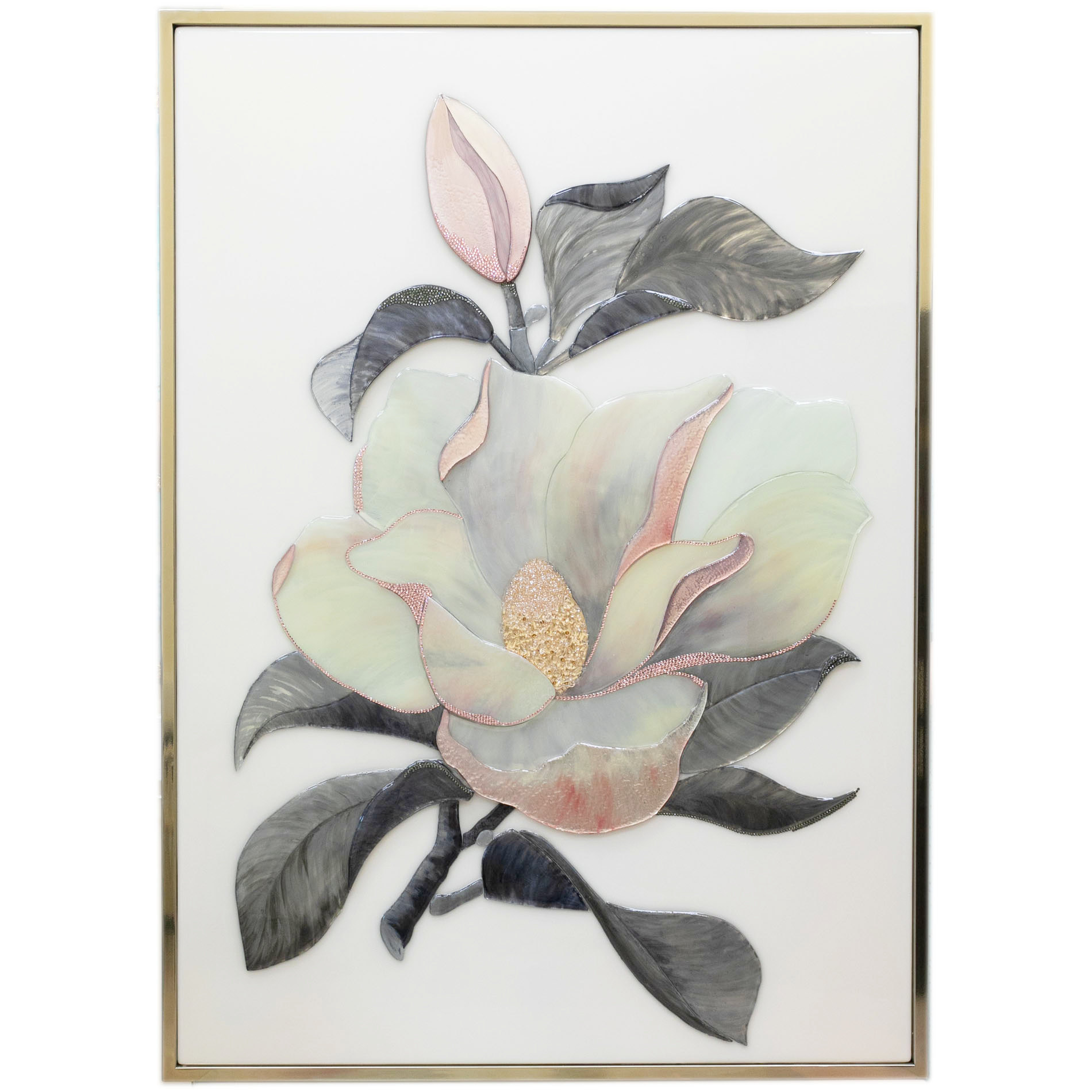 Основу композиции составляет барельеф, искусно передающий нежность и красоту цветка магнолии. Каждый лепесток выполнен с филигранной точностью, подчеркивая природную изящность и грацию растения. Особое внимание привлекают зеркальные элементы, добавляющие произведению глубину и многогранность. Они создают эффект игры света, делая панно живым и динамичным.