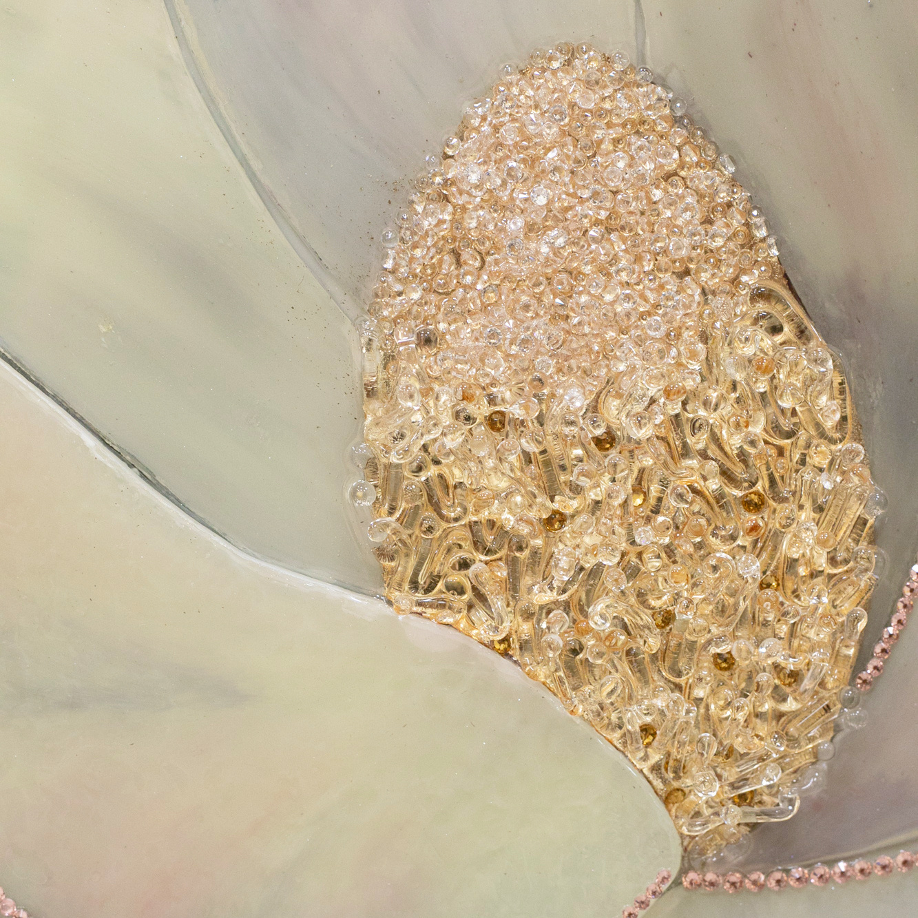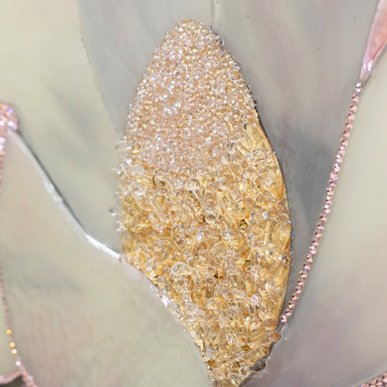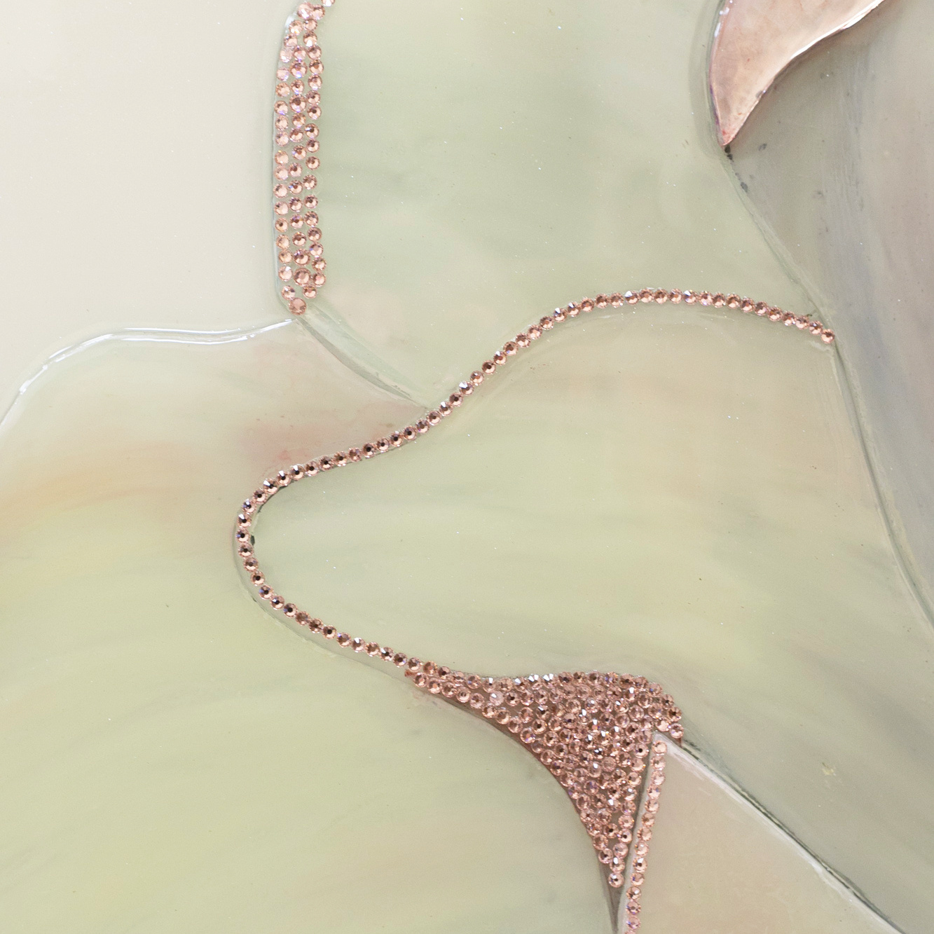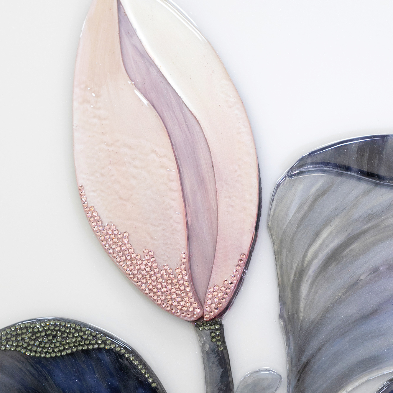 Инкрустация кристаллами и стразами Swarovski придает изделию невероятные блеск и шик. Эти сверкающие детали, искусно размещенные по всей поверхности панно, создают эффект мерцания, словно капли росы на лепестках магнолии. Декорирование природным горным хрусталем добавляет произведению естественную красоту и делает его по-настоящему уникальным.