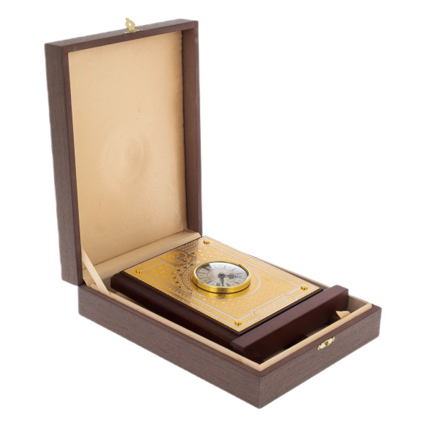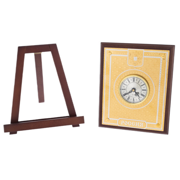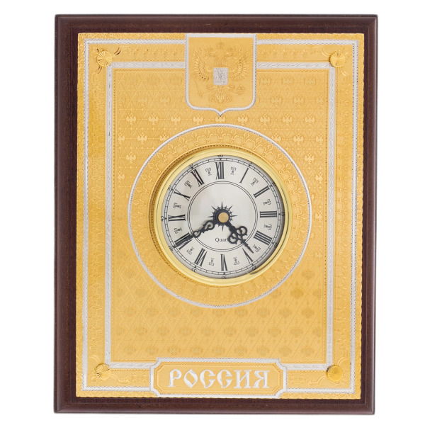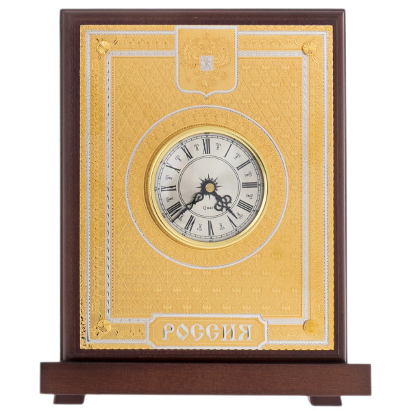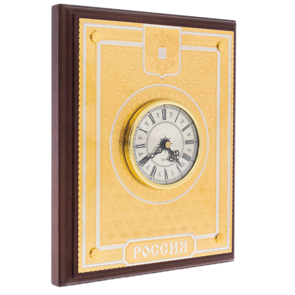 Массивная деревянная основа добавляет изделию монументальности, придавая ему ощущение стабильности и надежности — как прочного фундамента, на котором стоит вся великая Россия. Тонкая игра золотого фона с контрастным циферблатом заставляет задуматься о быстротечности времени, но в то же время о вечности идеи могущества и власти. Часы как бы становятся хранителями мгновений и памяти, напоминая о неугасаемой энергии, которую дарит Родина.