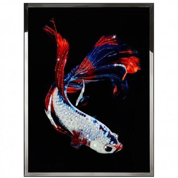 Рама из полированной нержавеющей стали придает панно роскошный и современный вид. Центральное место на панно занимает изображение бойцовой рыбки Betta Splendes, выполненное с невероятной точностью и вниманием к деталям, что позволяет полностью передать красоту и элегантность этого существа.