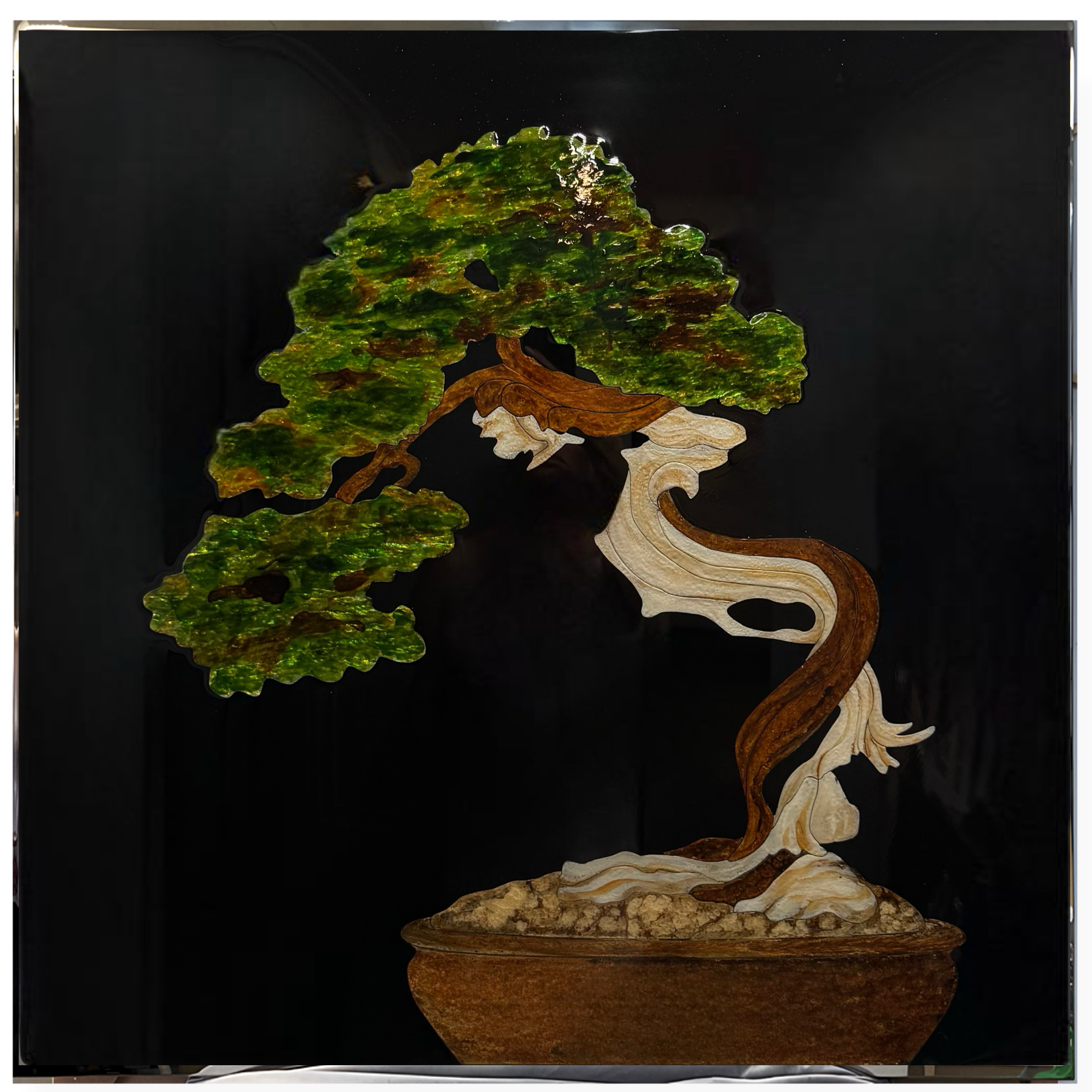 Декоративное панно «Бонсай зеленый» является художественным объектом, обращённым к философии созерцания и внутреннего равновесия. Композиция выстроена вокруг образа древнего дерева, склонённого временем и ветрами, но сохраняющего силу и достоинство. Панно воспринимается как самостоятельное произведение интерьерного искусства, предназначенное для пространств, где ценят тишину формы, глубину смысла и визуальную паузу, позволяющую взгляду задержаться и успокоиться.