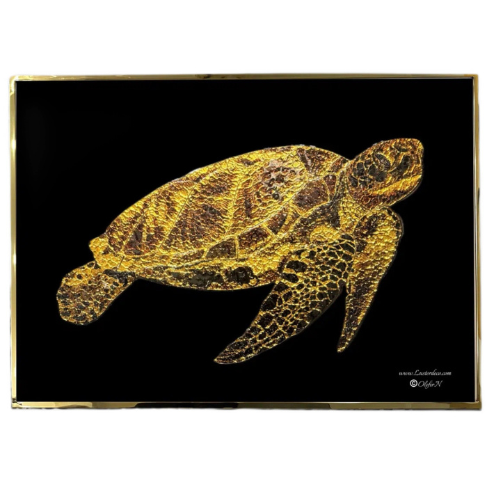 Золотистая черепаха на насыщенном чёрном фоне выглядит словно древний символ, извлечённый из глубин океана. Теплые отблески металла оживляют фактуру панциря, передавая ощущение движения и устойчивости одновременно. Этот образ ассоциируется с гармонией, мудростью и вечным течением времени — качествами, которыми наполняется пространство, где находится панно.