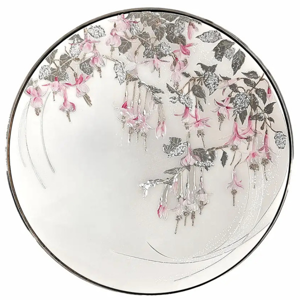 Изящное декоративное панно из зеркального акрила с художественной живописью эмалями отражает утончённую игру света и хрупкой красоты. Композиция, вдохновлённая цветением фуксии, воспроизводит утреннюю негу и прозрачность летнего воздуха, в котором словно зависли лёгкие соцветия, вытянутые тонкими серебристыми стеблями. Лепестки окрашены вручную мягкими градиентами розового, сиреневого и жемчужного — эффект достигается за счёт тонкой работы с эмалями, каждый мазок которых застывает в стеклянной чистоте. Листовая поталь, вкраплённая в листву, создаёт эффект металлического блика, перекликаясь с сиянием ювелирных кристаллов и хрустальных стразов.