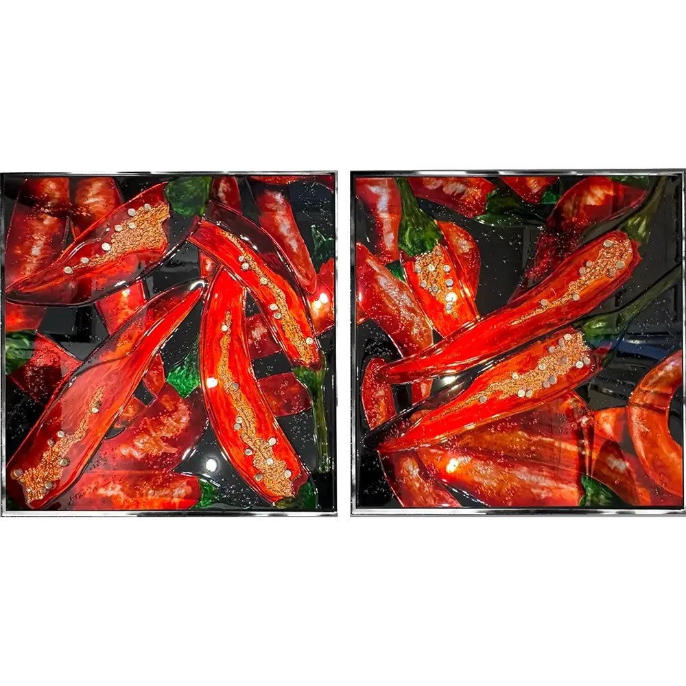 В панно использованы многослойные стеклянные вставки с глубокой проработкой внутренней текстуры плодов — от гладкой поверхности до зёрнышек внутри. Хромированные рамки добавляют современное звучание, играя на контрасте с нарочито «натуральной» изобразительной манерой. Благородный чёрный фон подчёркивает насыщенность красок, создавая визуальный объём и усиливая ощущение пикантности, будто аромат перца вот-вот коснётся воздуха.